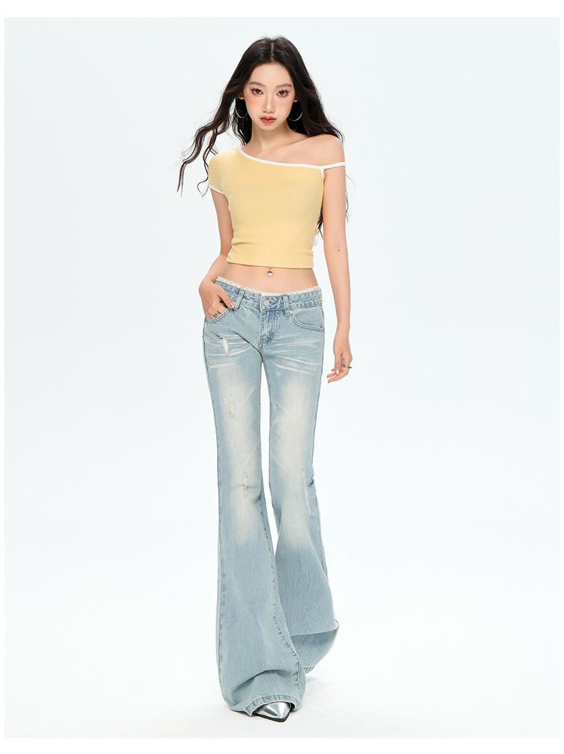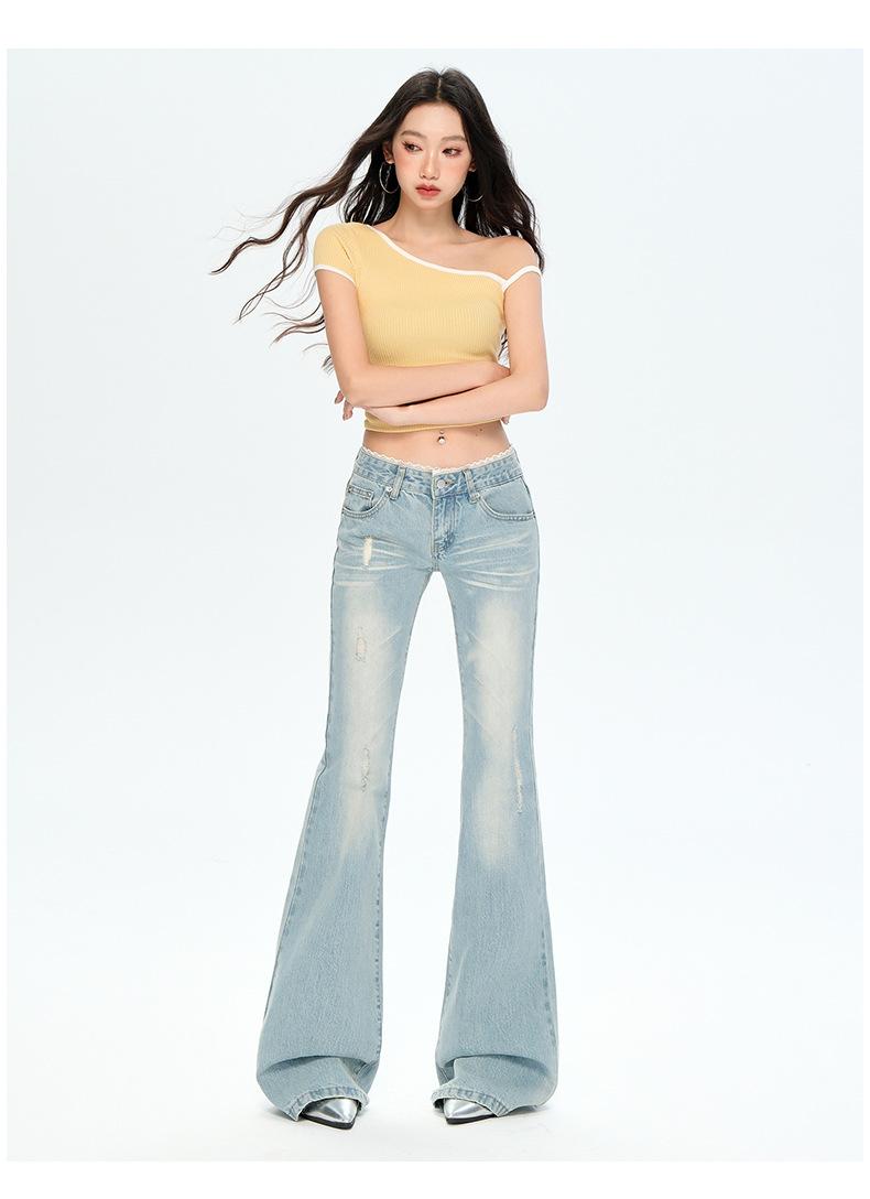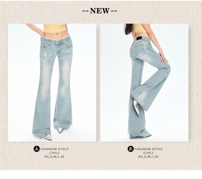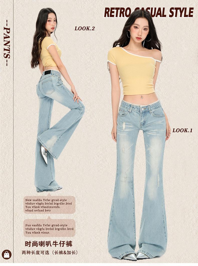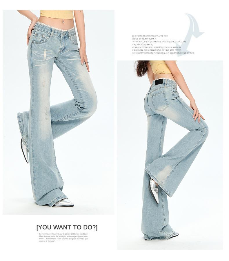 Jeans Microacampanados de Cintura de Encaje para Mujer Primavera 2025 Nueva Llegada Jeans Rotos de Cintura Baja Adelgazantes sin Piernas