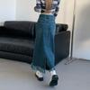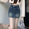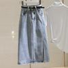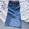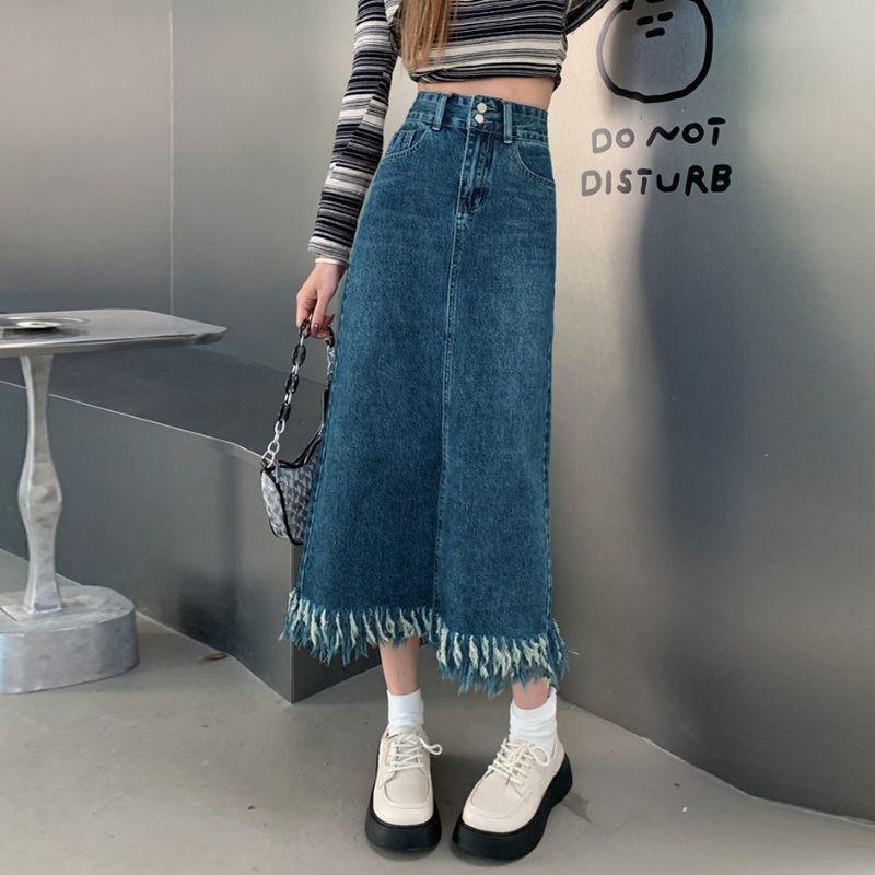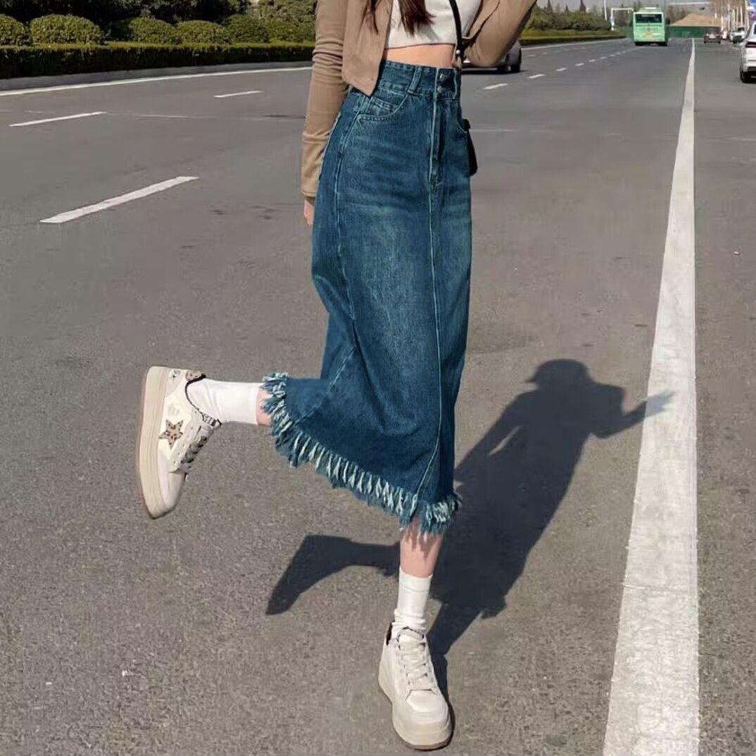 Falda de mezclilla con abertura de cintura alta para mujer ejecutiva 2025 de largo medio, corte slim A, falda de cadera con flecos de borlas