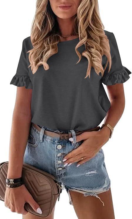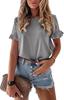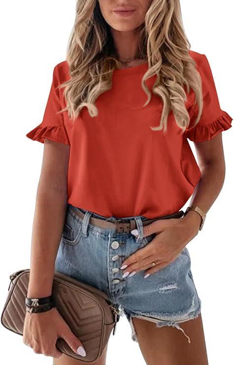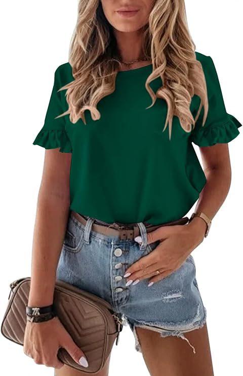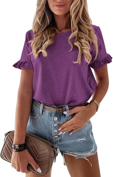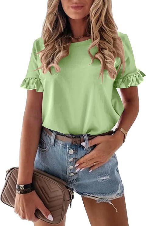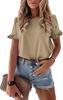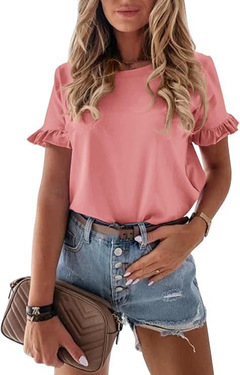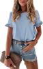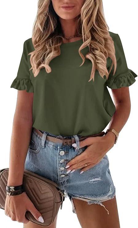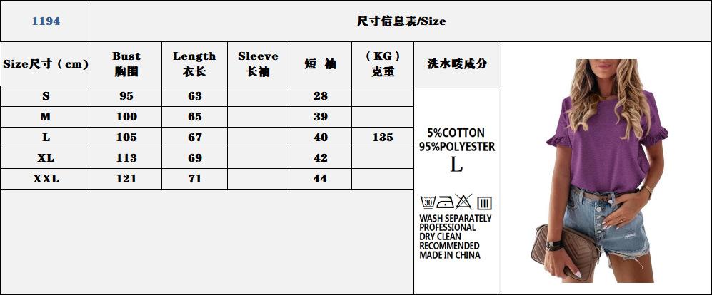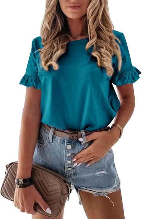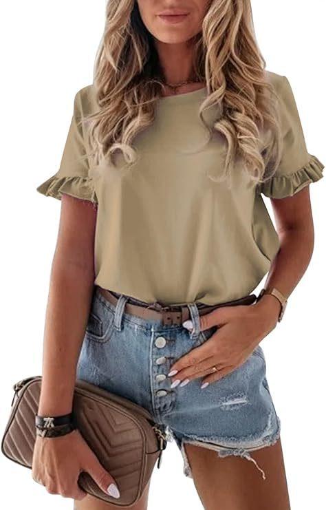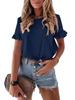 Tops estilo europeo y americano 2025 Casuales con volantes de manga corta de verano sueltos de color sólido con cuello redondo
