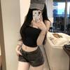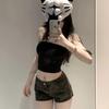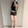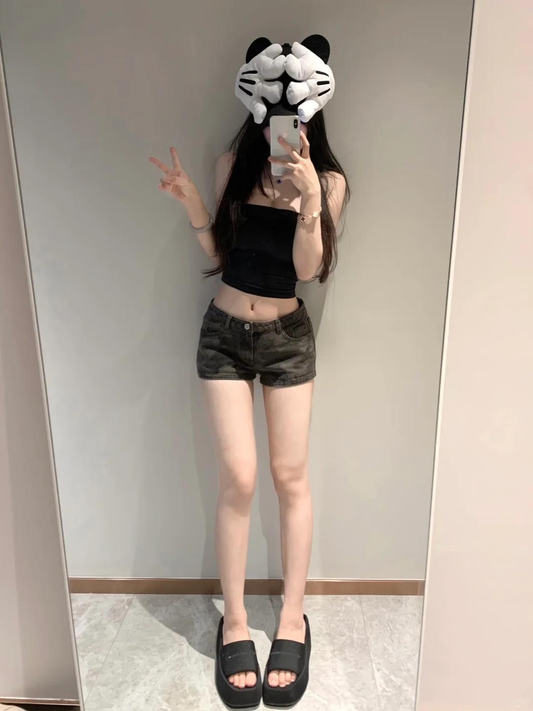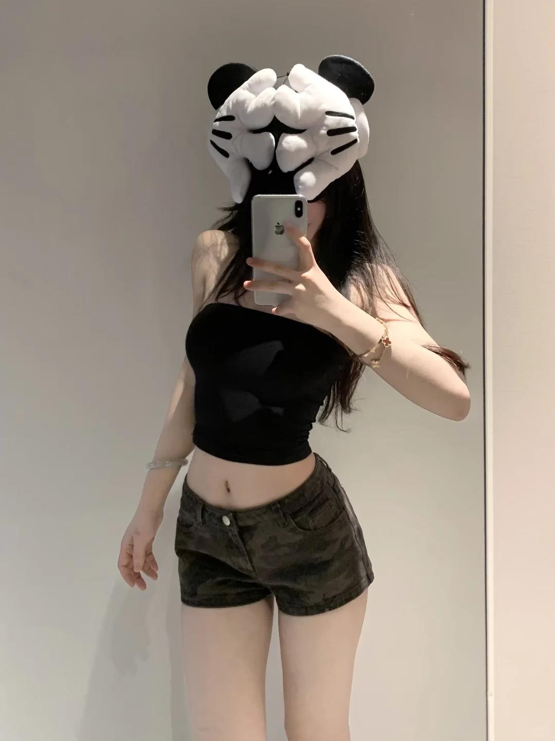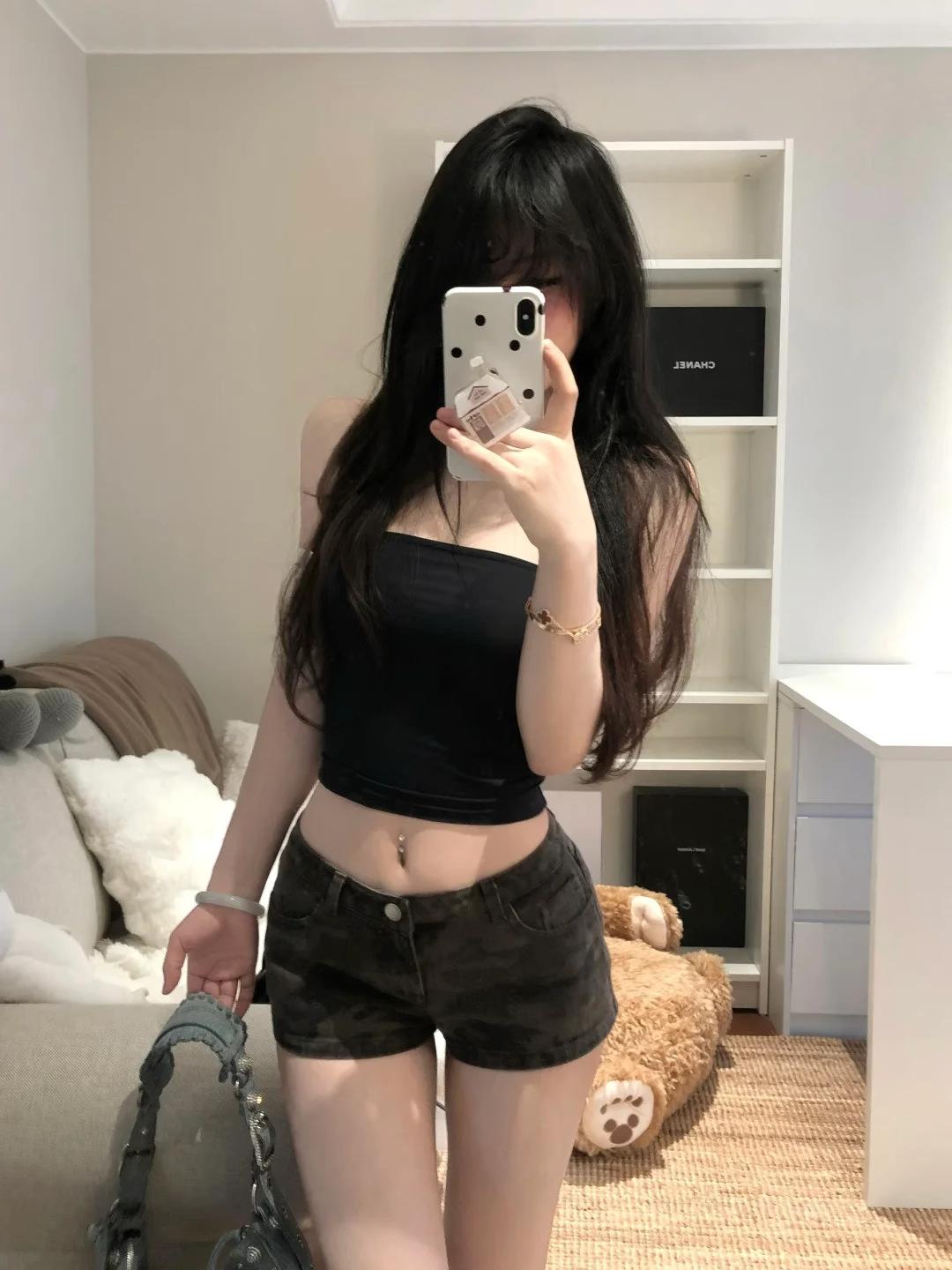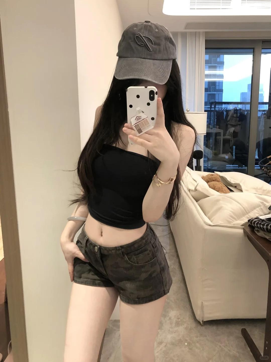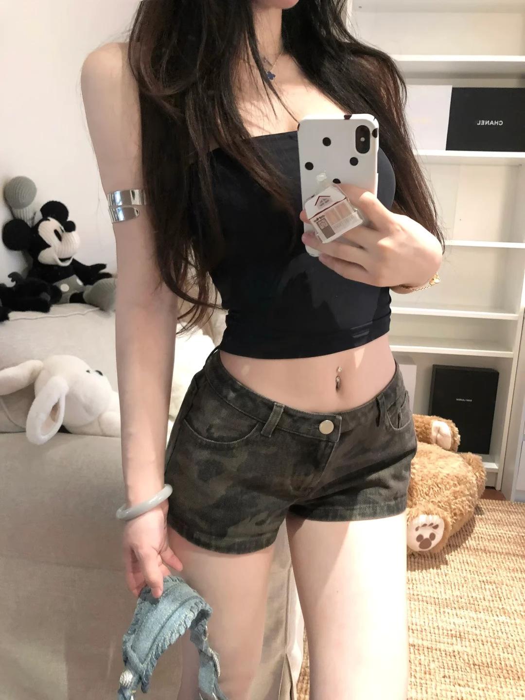 Shorts de mezclilla de camuflaje de tiro bajo para chica sexy, de verano para mujer, look adelgazante, elásticos, que cubren la cadera, rectos, versátiles, casuales, súper cortos