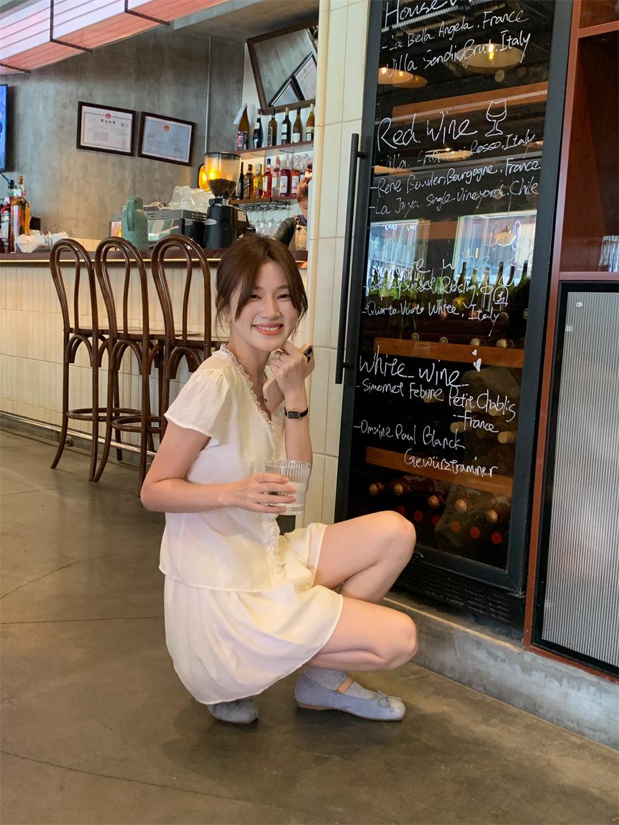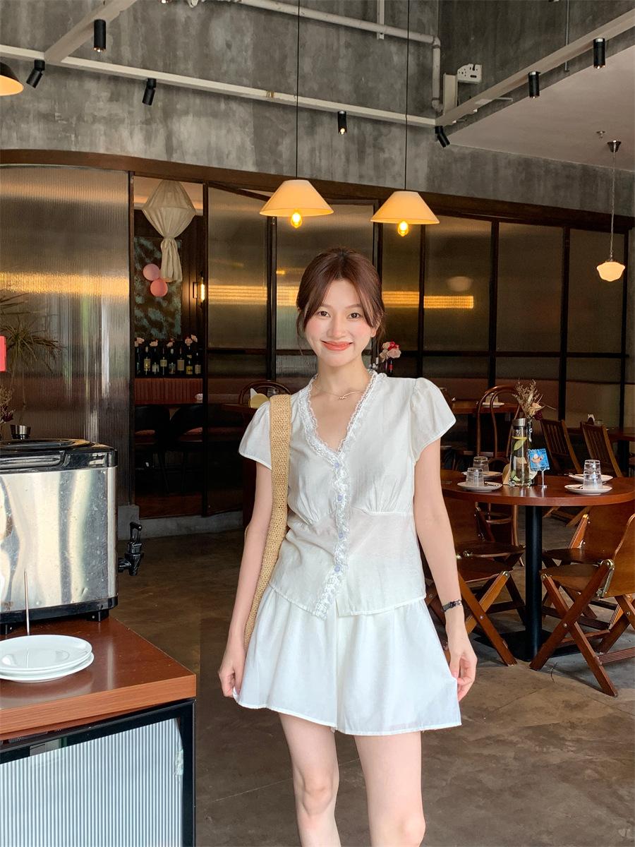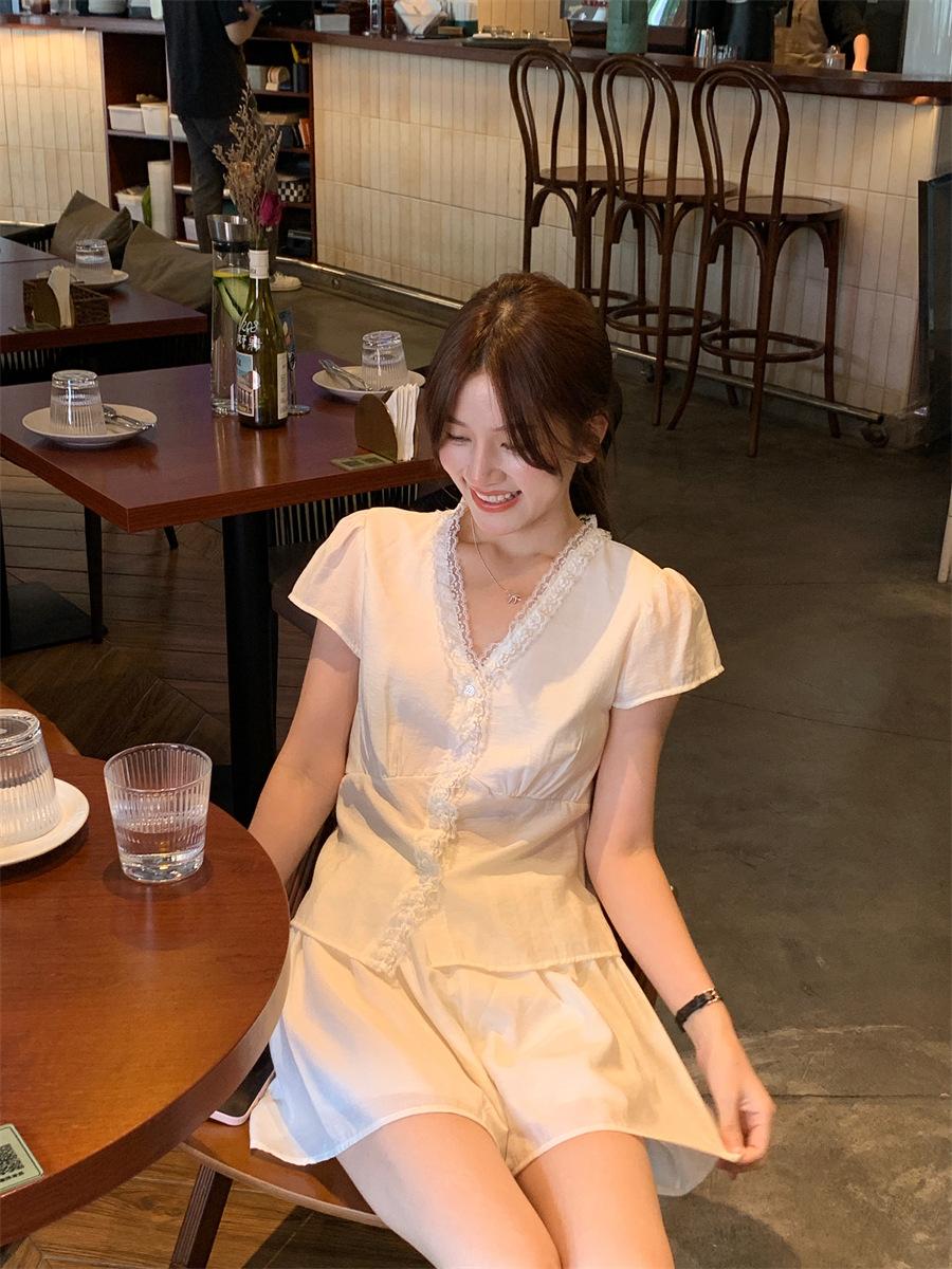 Foto real verano 2025 diseño estilo coreano nicho encaje costuras manga corta top traje corto para mujer conjunto de dos piezas