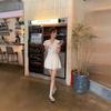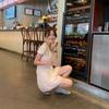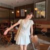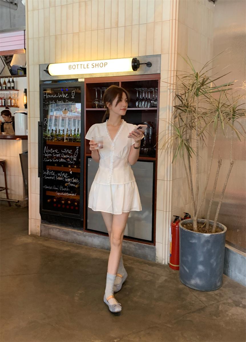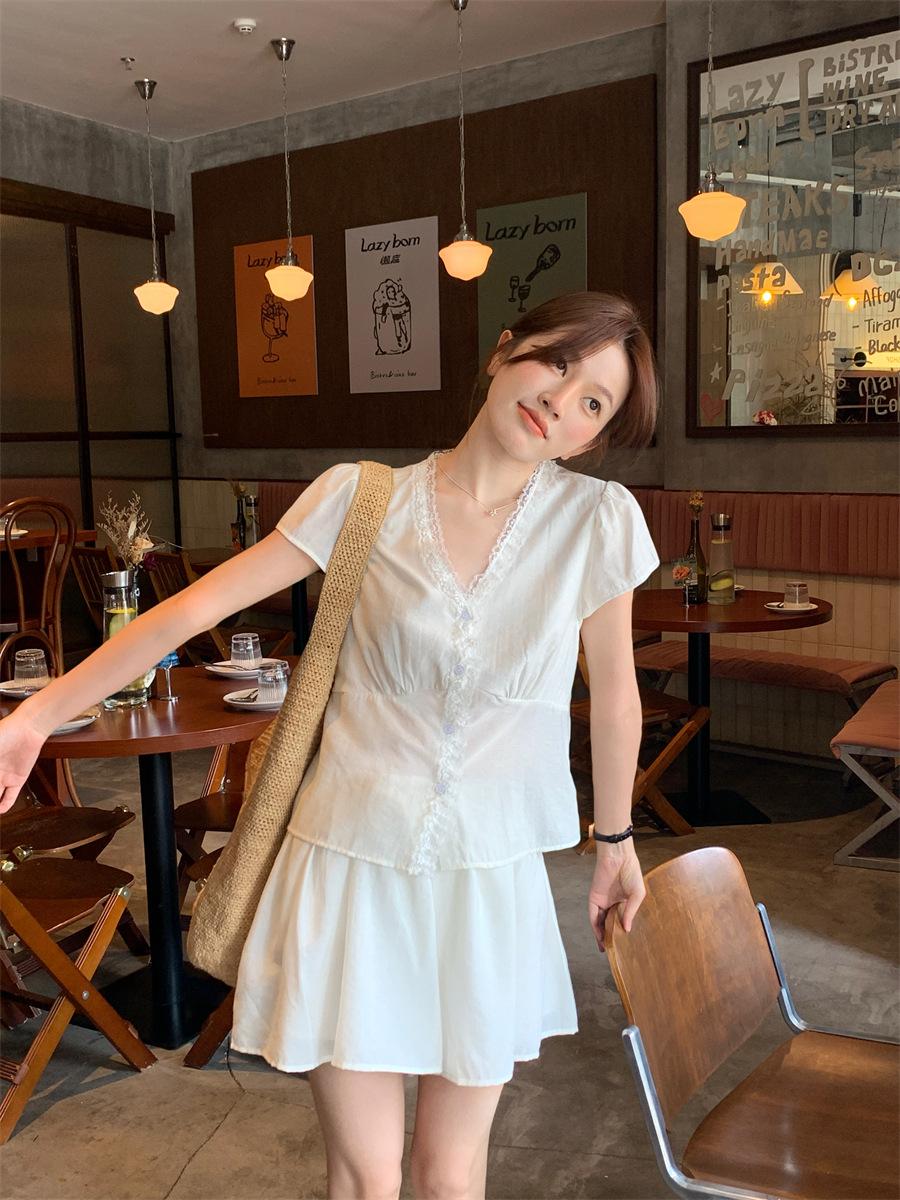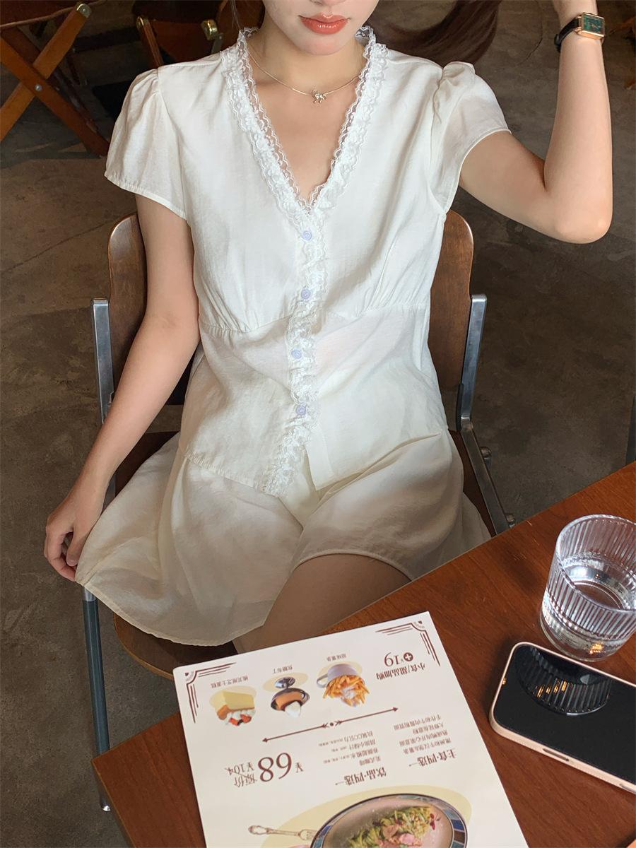 Foto real verano 2025 diseño estilo coreano nicho encaje costuras manga corta top traje corto para mujer conjunto de dos piezas
