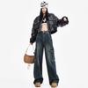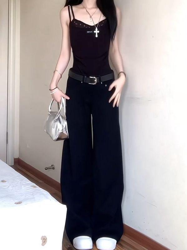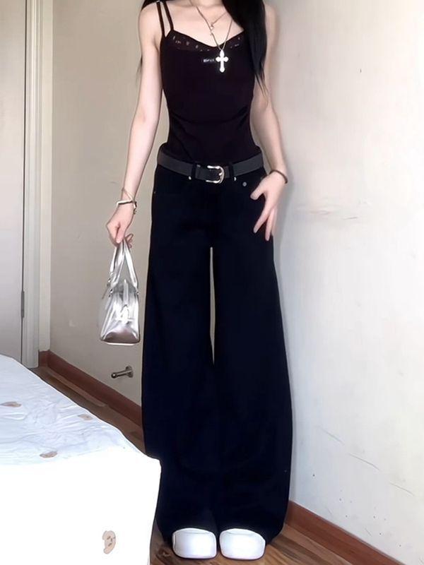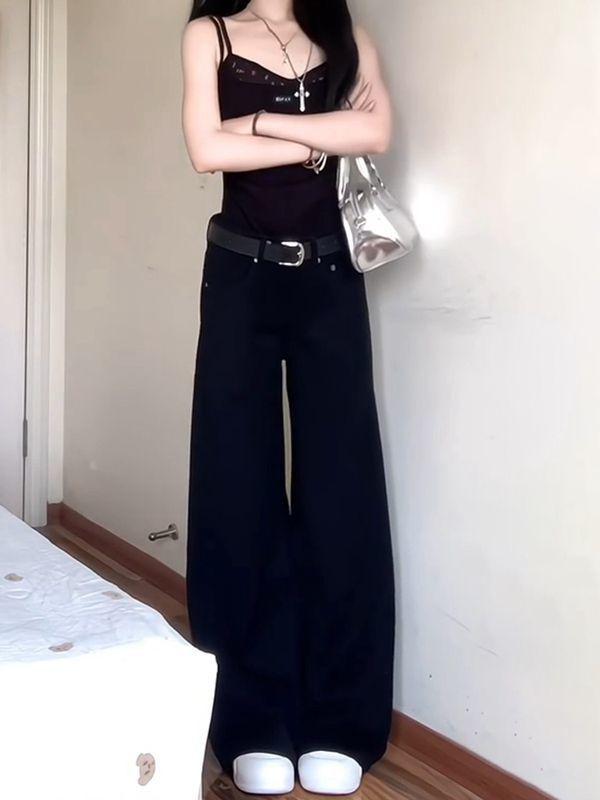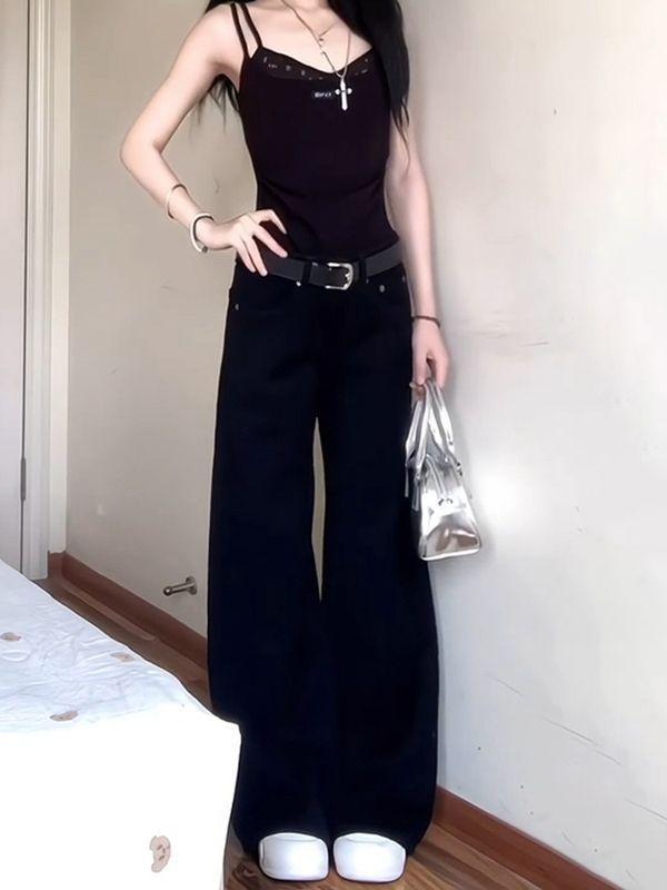 Jeans Retro de Estilo Americano Negros de Cintura Baja Casuales de Pierna Ancha para Mujer Verano de Gama Alta Ajustados