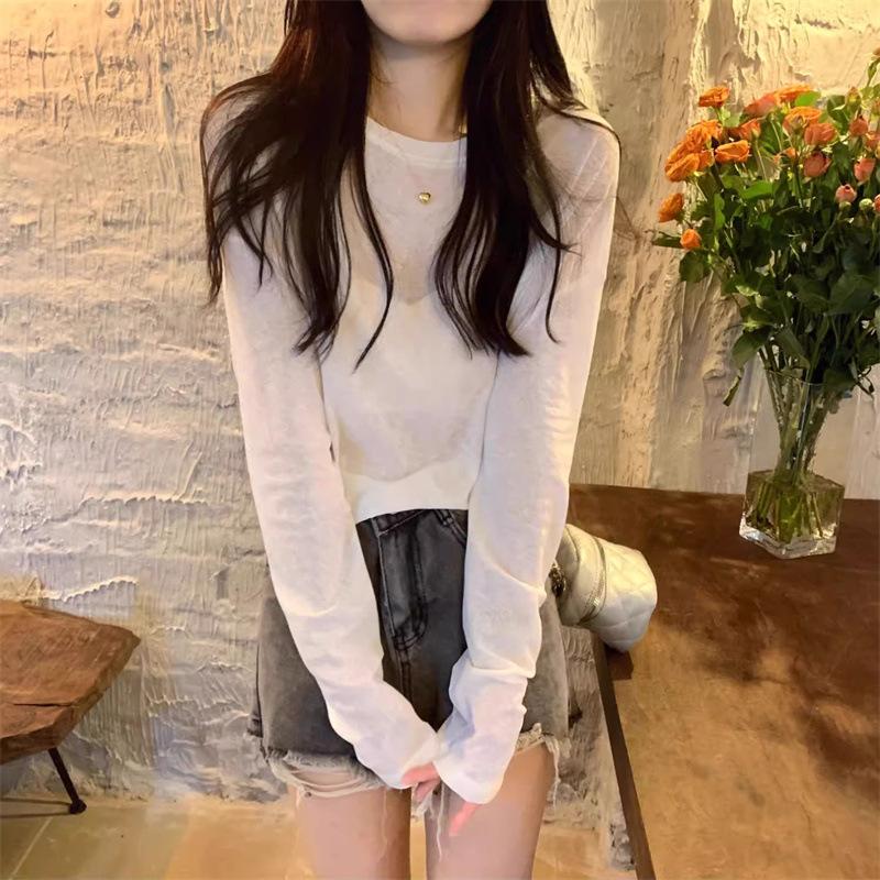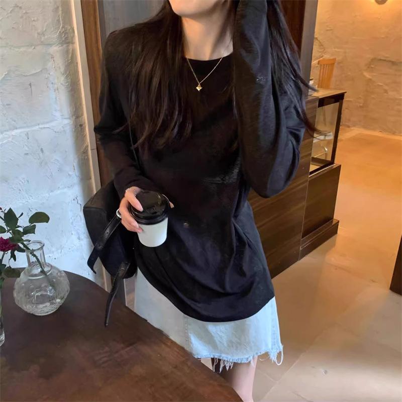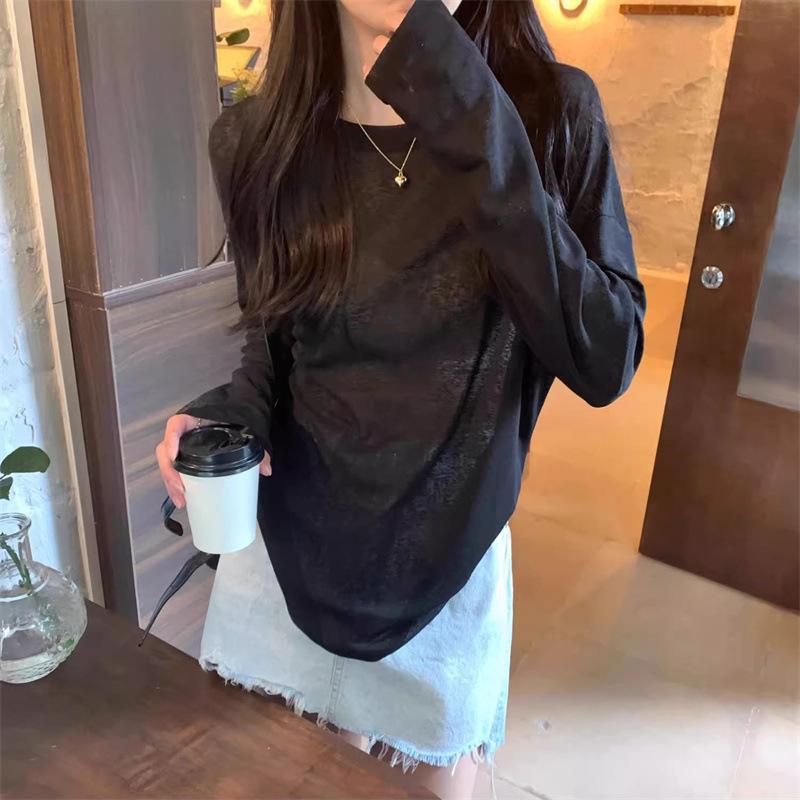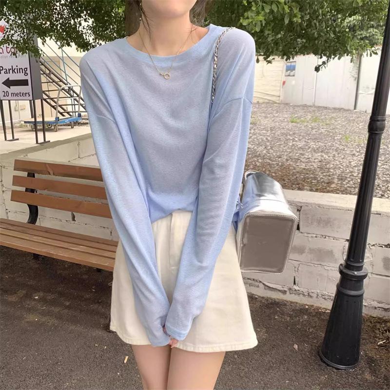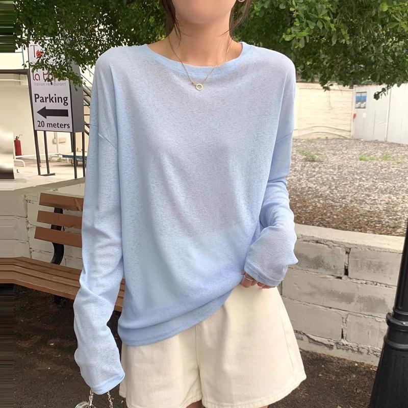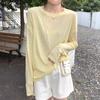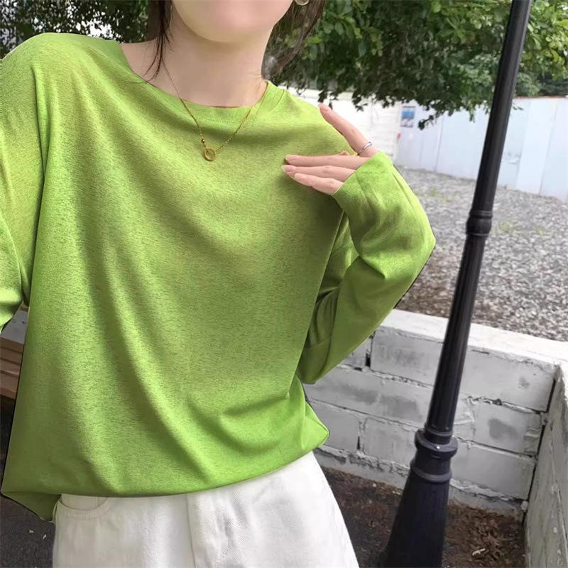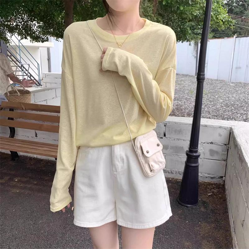 Camiseta de manga larga con protección solar color caramelo para comercio exterior para mujer, foto real, verano, nueva, delgada, holgada, coreana, color sólido, blusa top