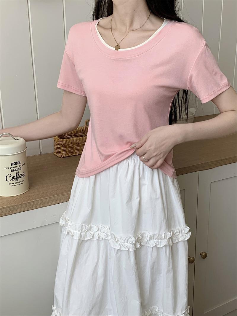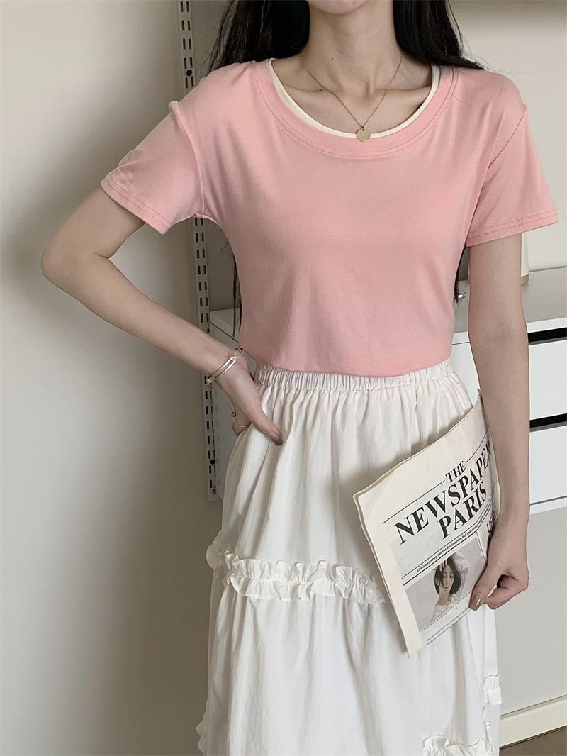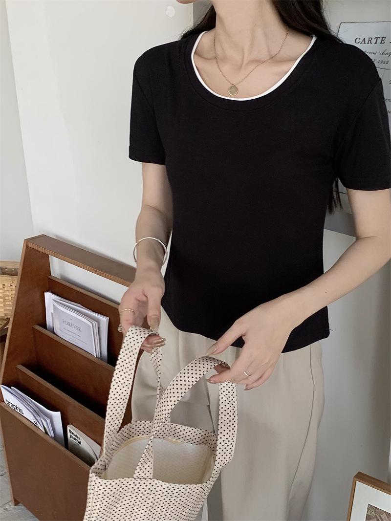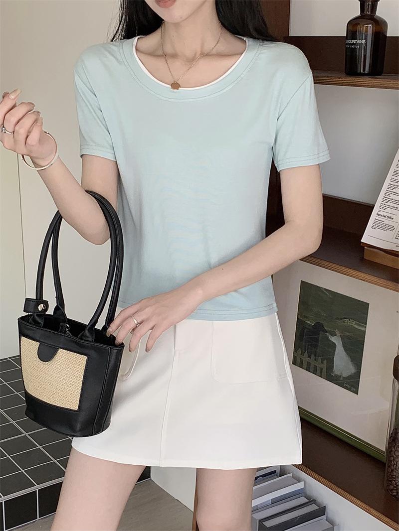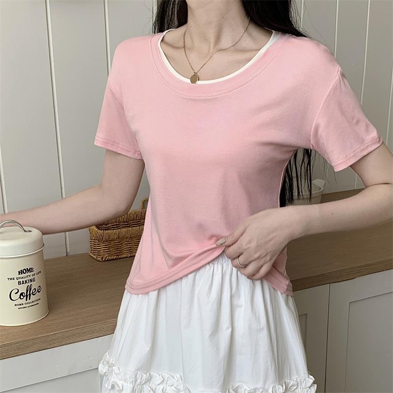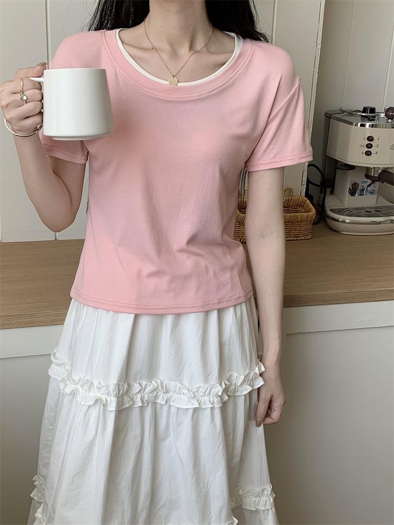 Nueva Camisa Casual de Color Contrastante Puro de Hombro con Manga Corta Falsa de Dos Piezas Ajustada Muestra Todo Combinable Top para Mujer