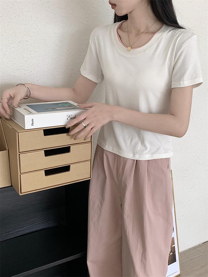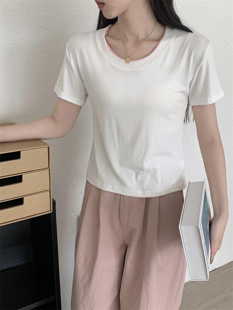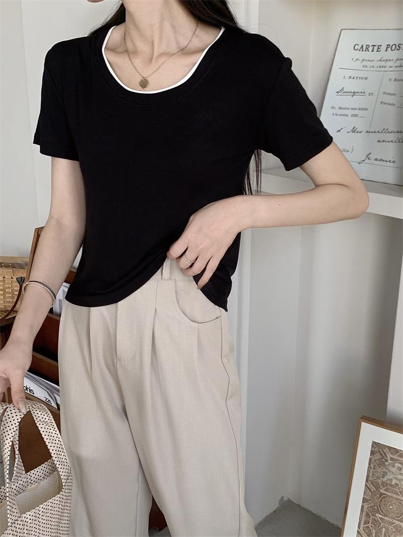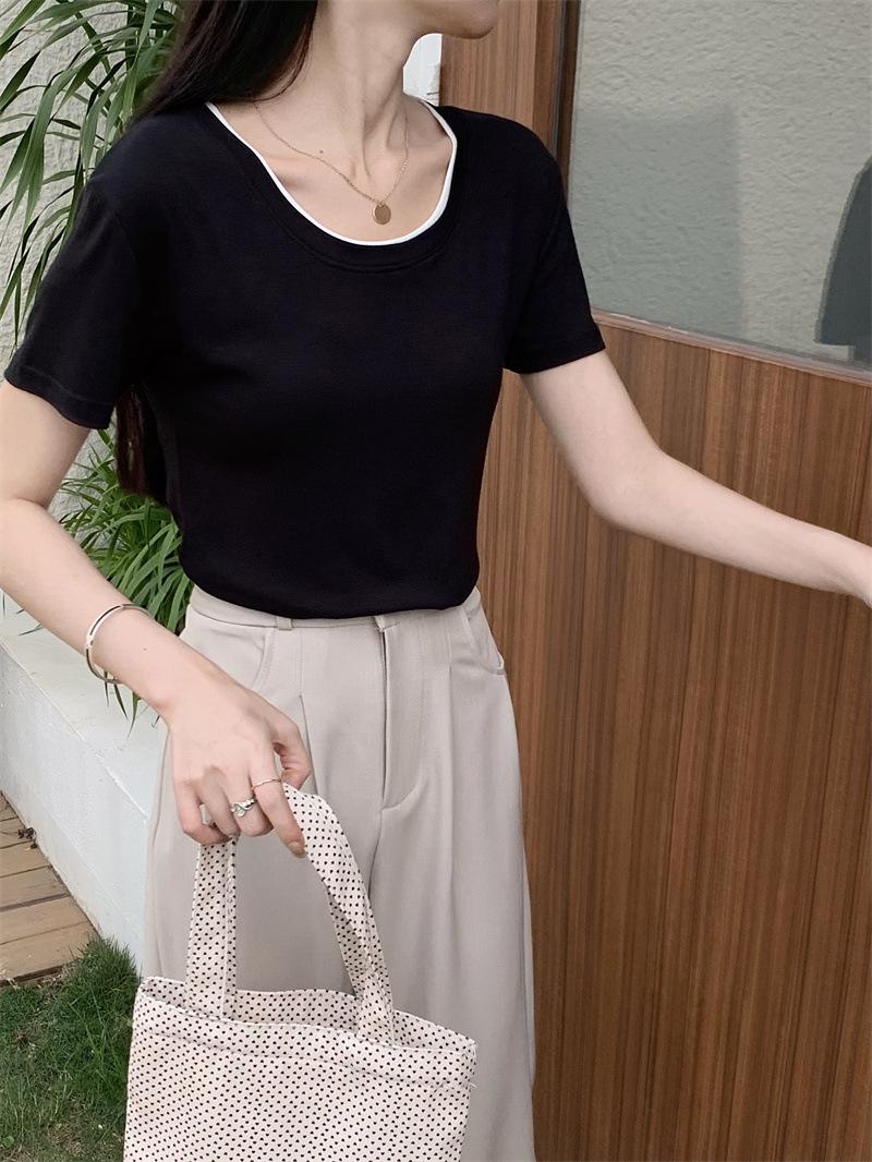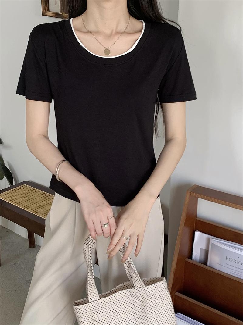 Nueva Camisa Casual de Color Contrastante Puro de Hombro con Manga Corta Falsa de Dos Piezas Ajustada Muestra Todo Combinable Top para Mujer