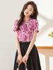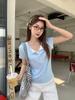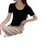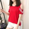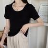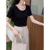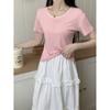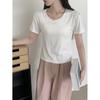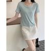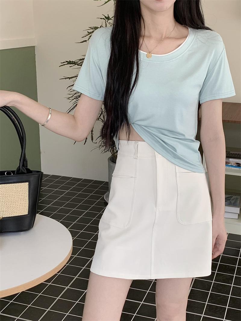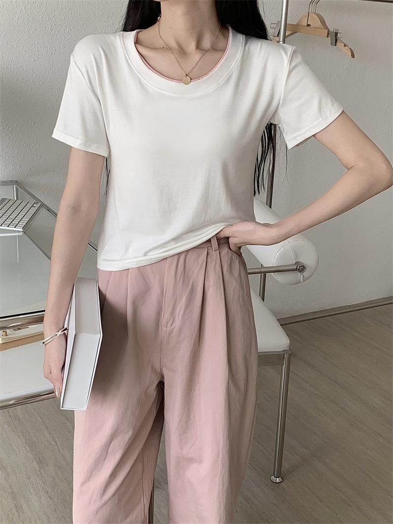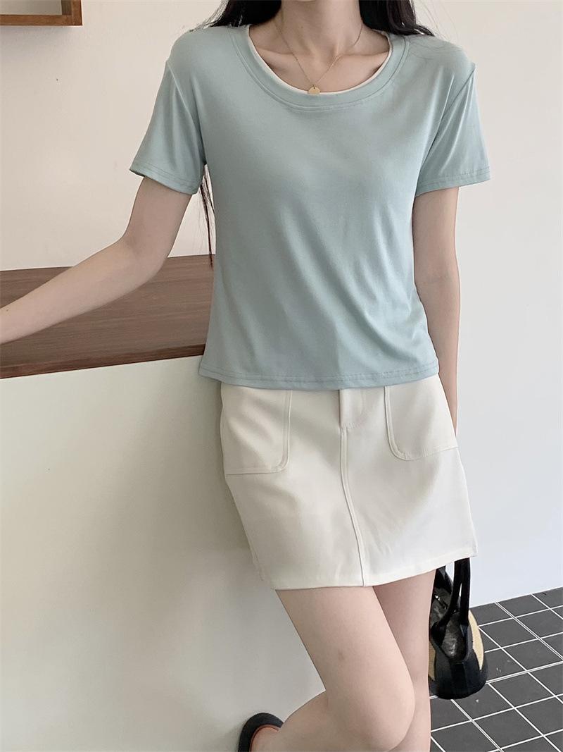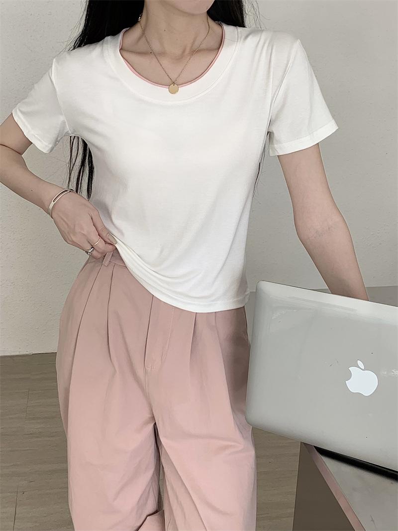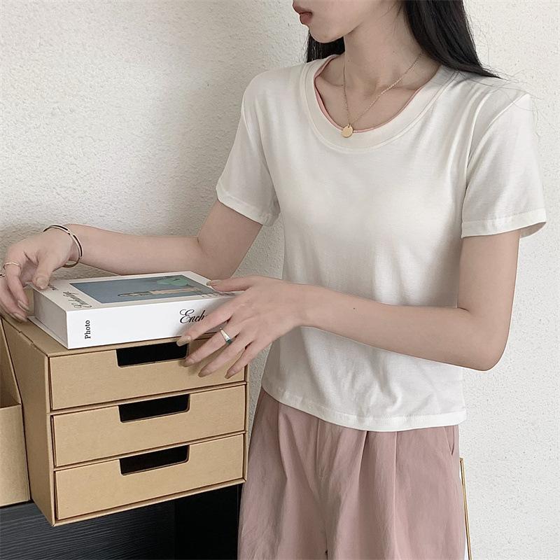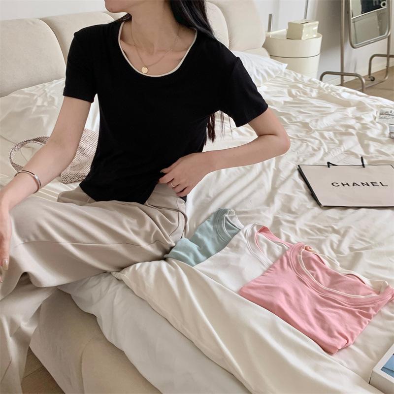 Nueva Camisa Casual de Color Contrastante Puro de Hombro con Manga Corta Falsa de Dos Piezas Ajustada Muestra Todo Combinable Top para Mujer