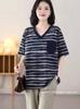 2025 Verano Talla Grande Rayada Elegante Manga Corta Cuello en V Casual Versátil Holgada Adelgazante Elegante Camiseta para Mujer