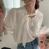 Chic Coreano Verano Francés Streamer Cuello Mao Diseño Reversible Holgado y Versátil Manga Abullonada Camisa Top de Satén