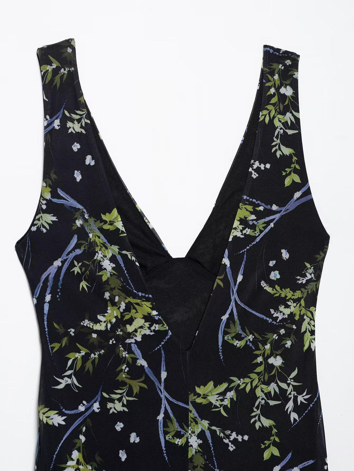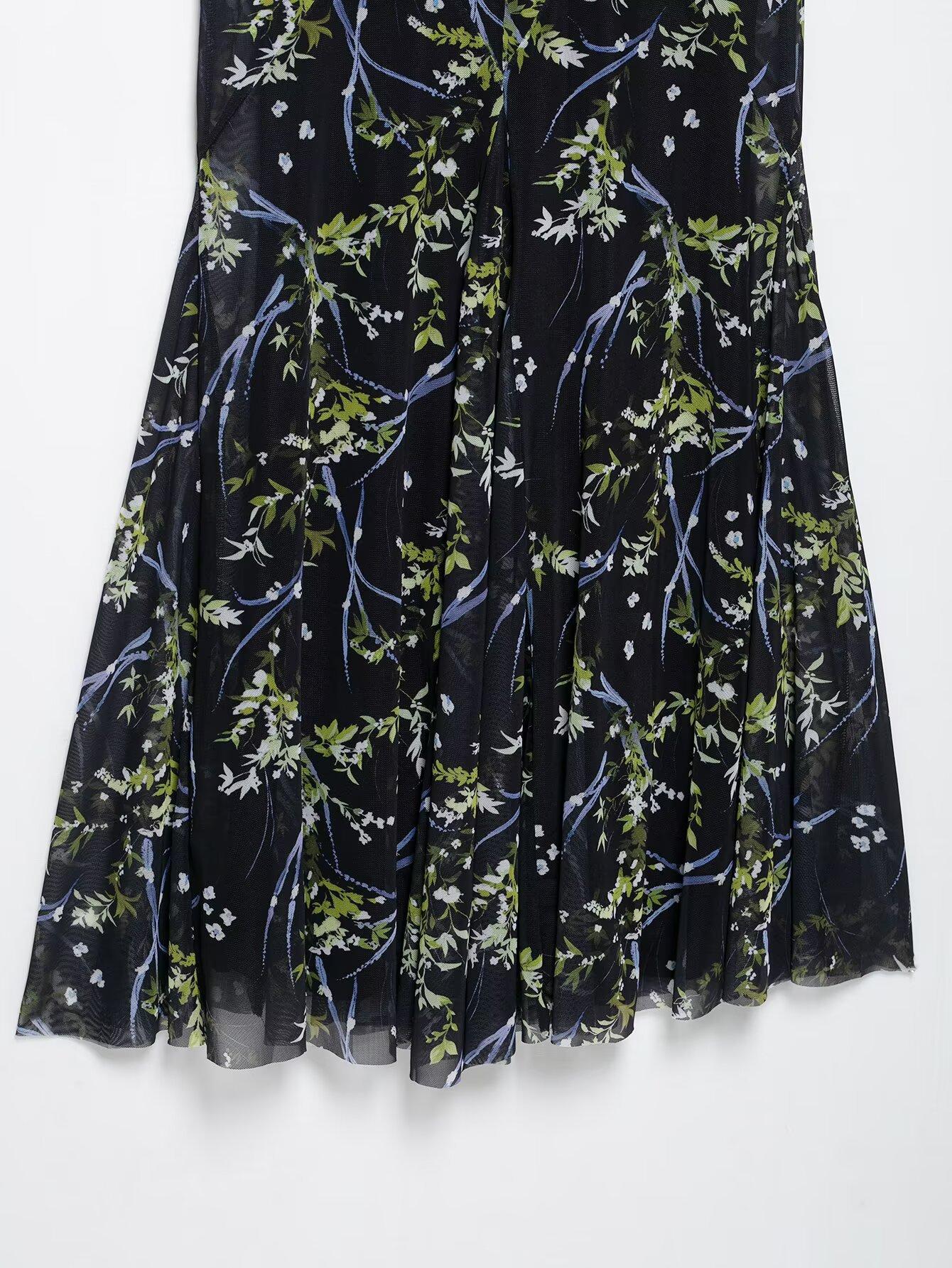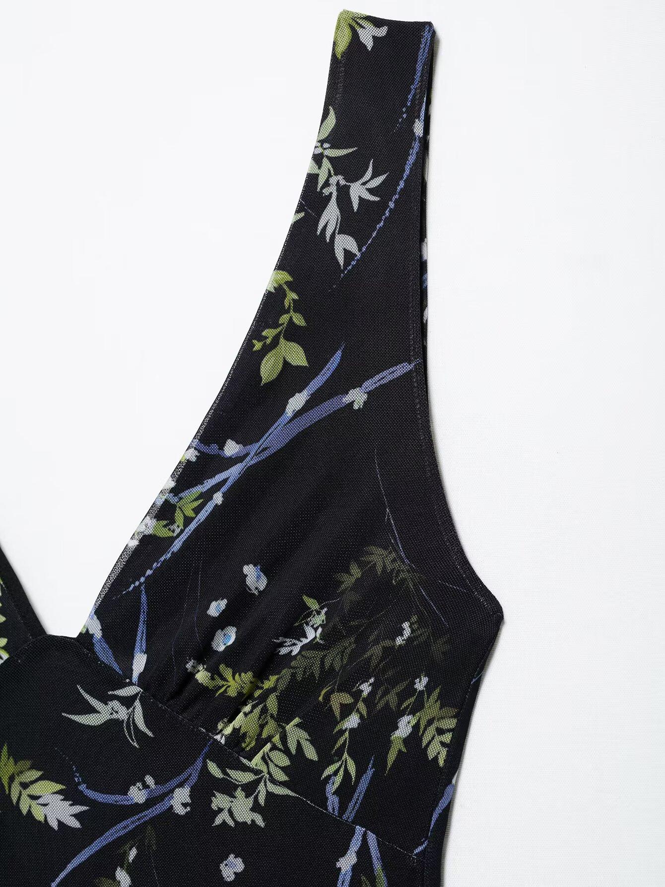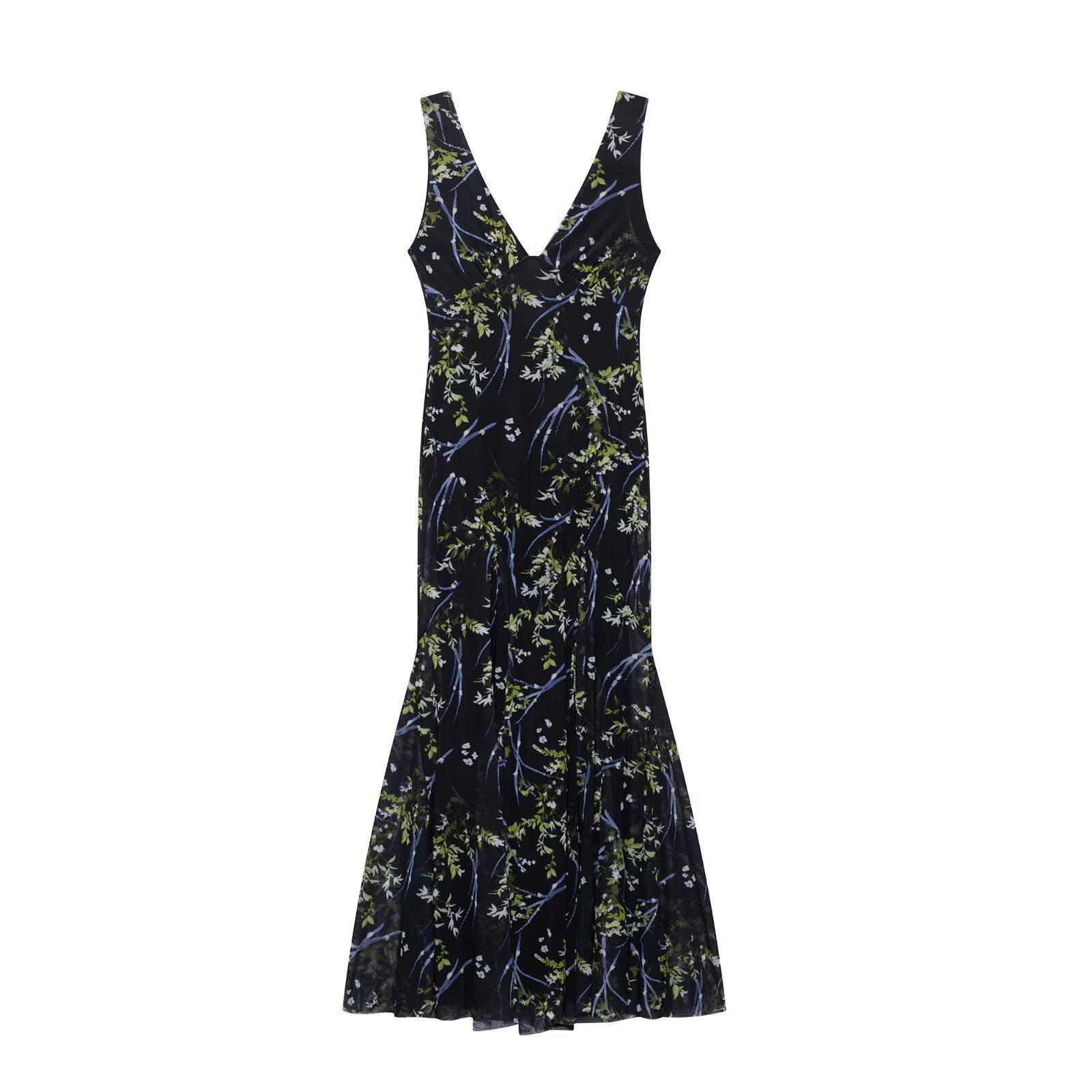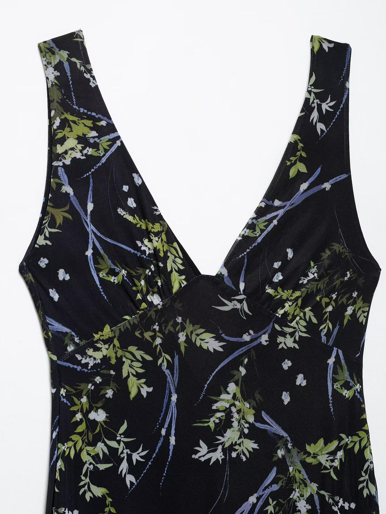 Venta al por mayor de exportación transfronteriza Primavera y verano 2025 Vestido sin mangas de malla de seda con estampado de flores con cuello en V estilo europeo y americano Falda larga