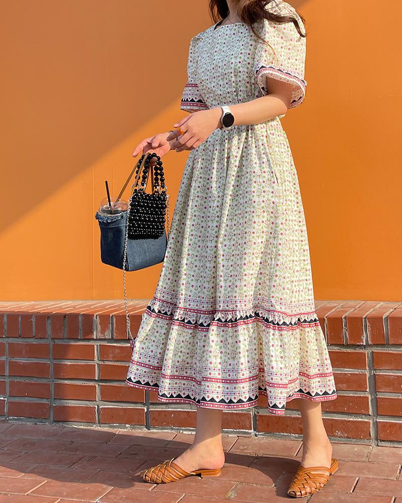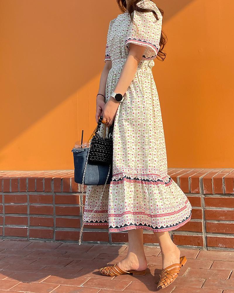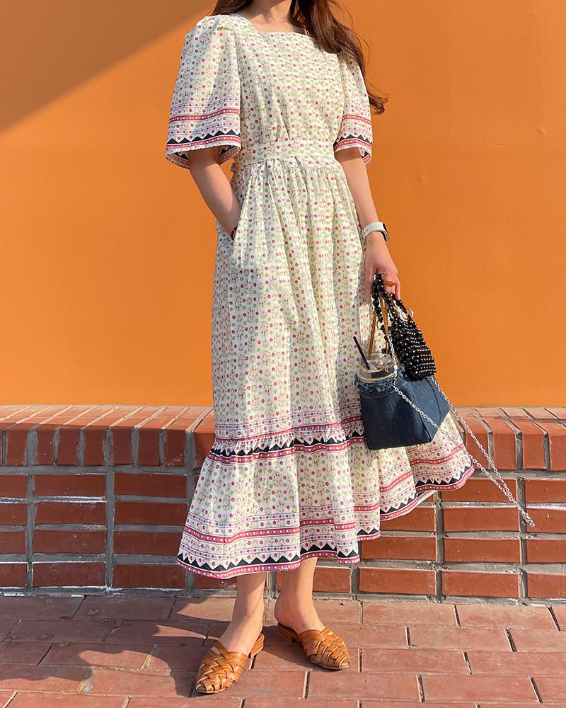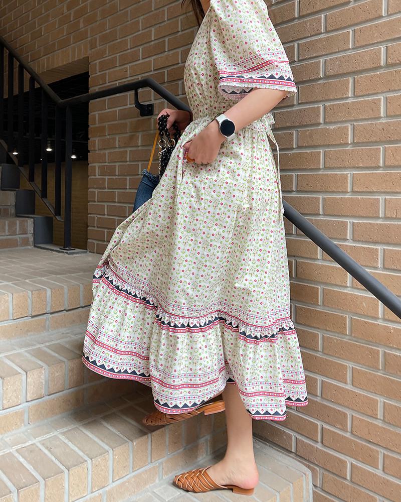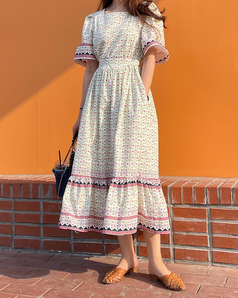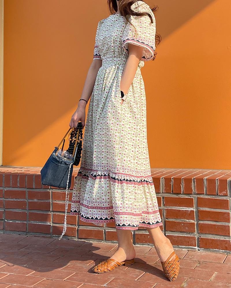 En Stock Vestido Chic Retro Estilo Étnico Floral para Mujer con Cordones en la Cintura Adelgazante Largo Medio Cola de Pez