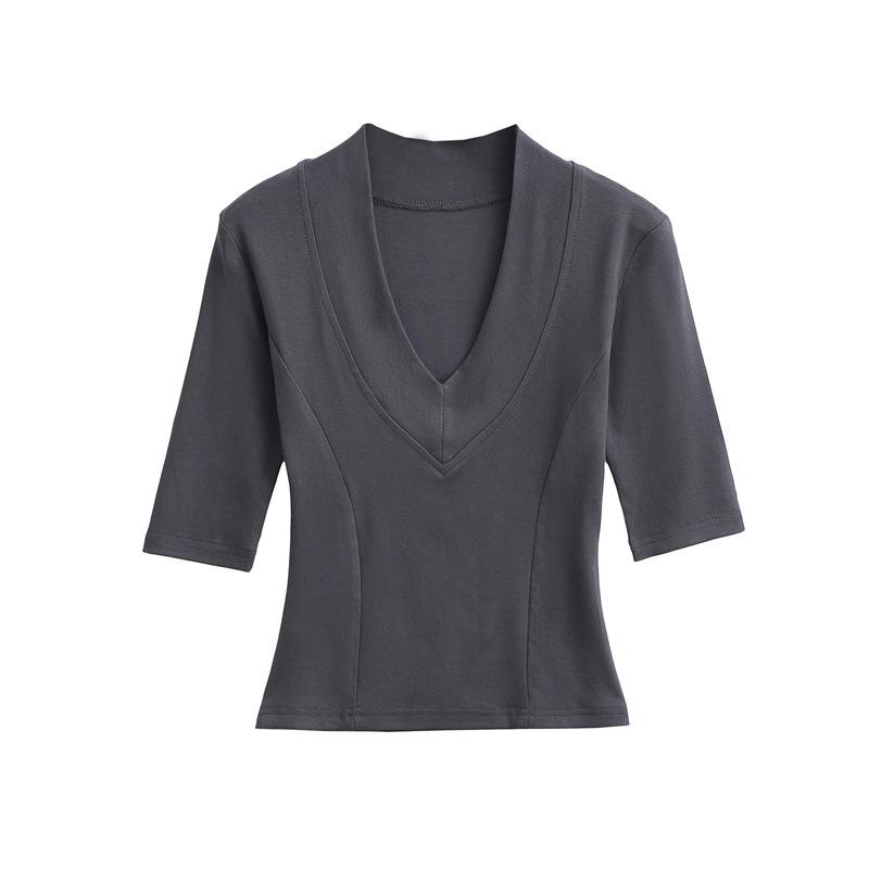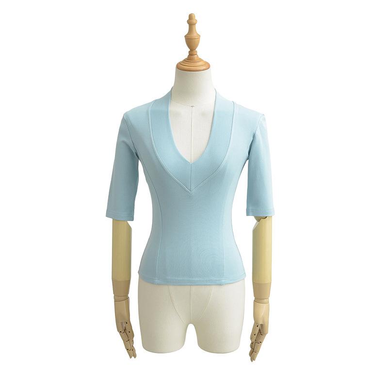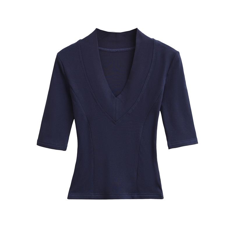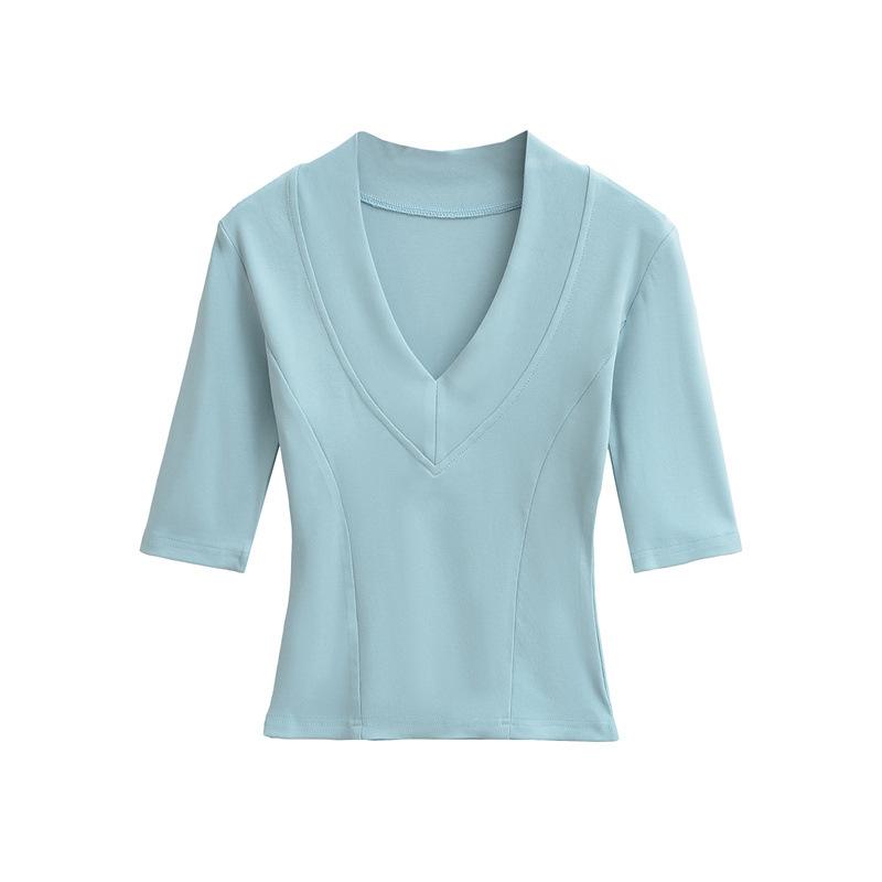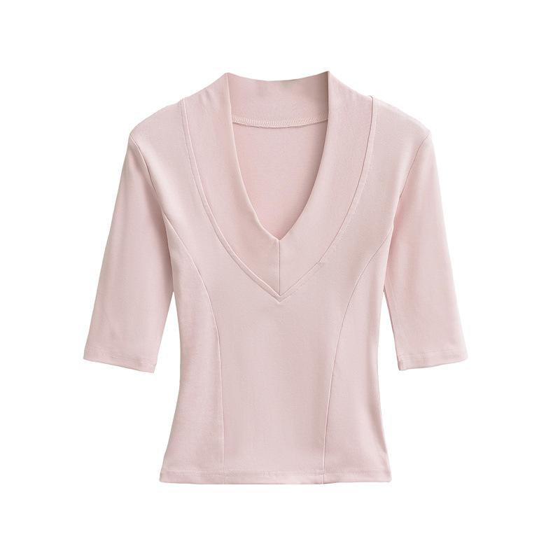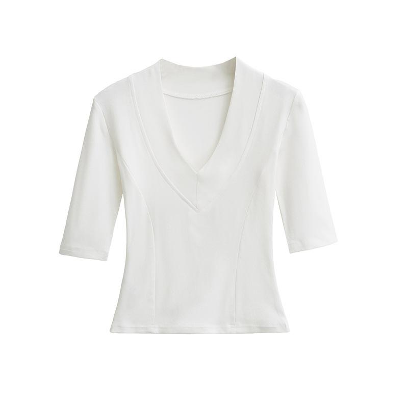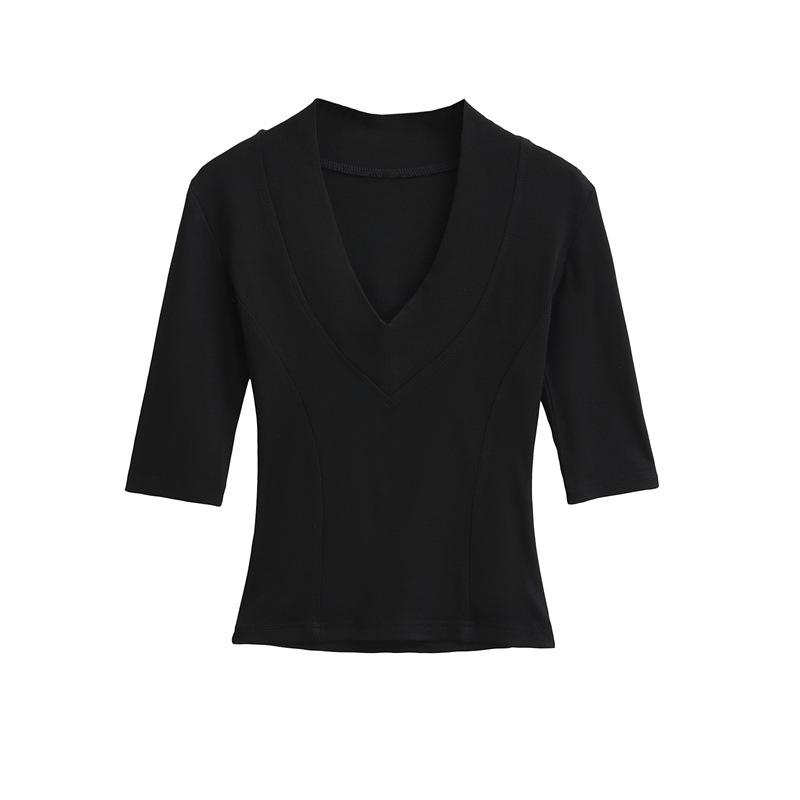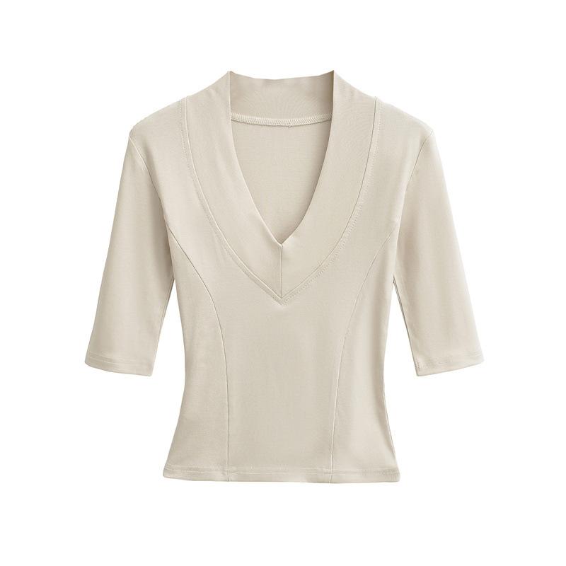 Playera Nueva de Moda para Mujer Primavera/Verano 2025, Cuello en V Profundo, Top de Manga Tres Cuartos, Camiseta Básica Corta Ajustada Estilo Americano
