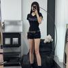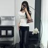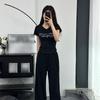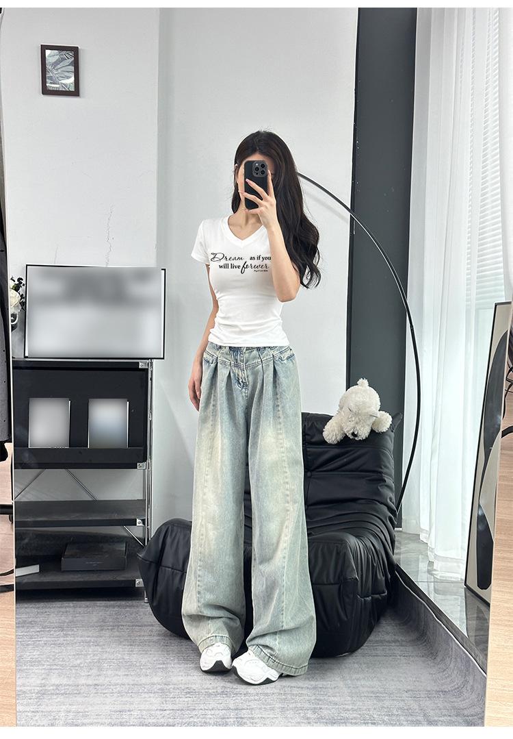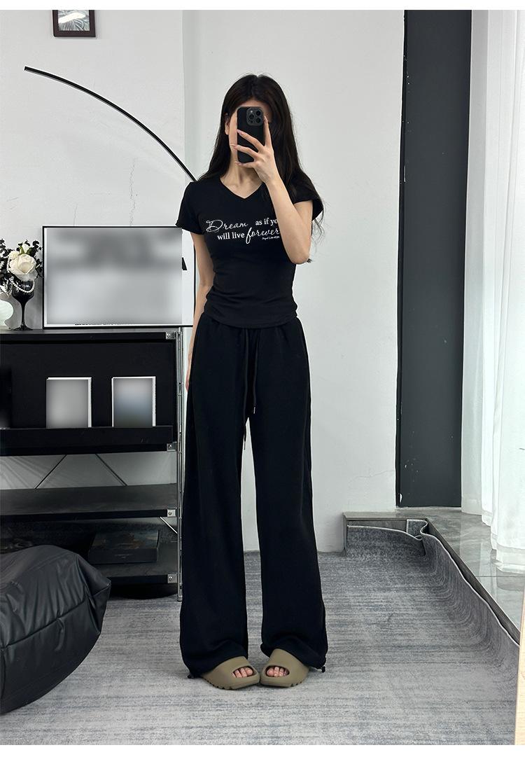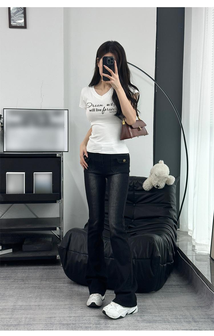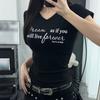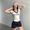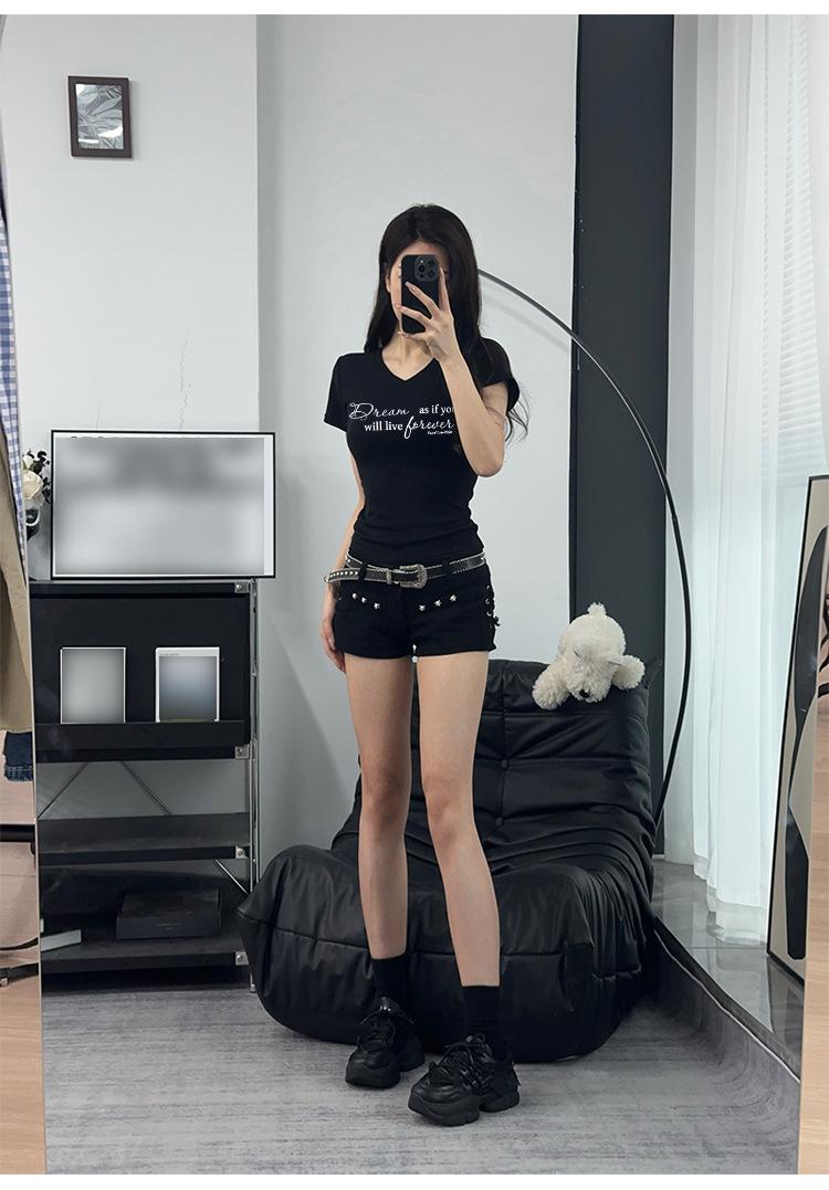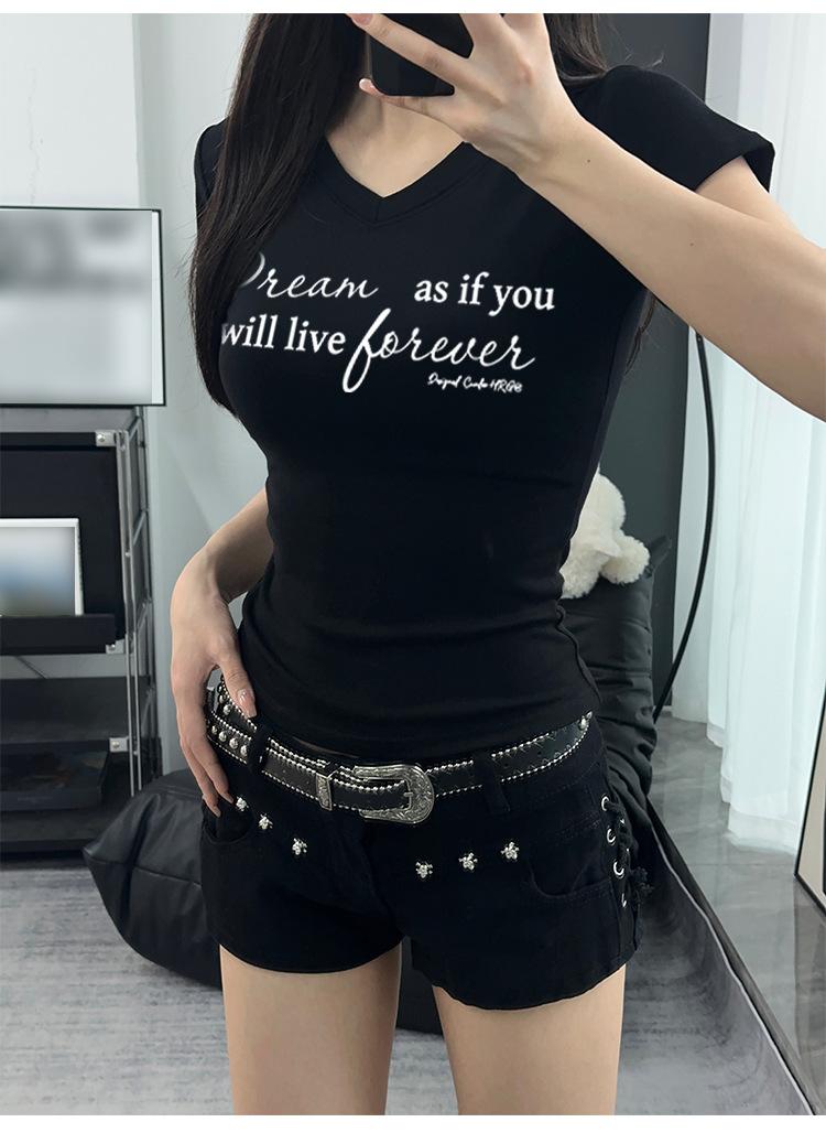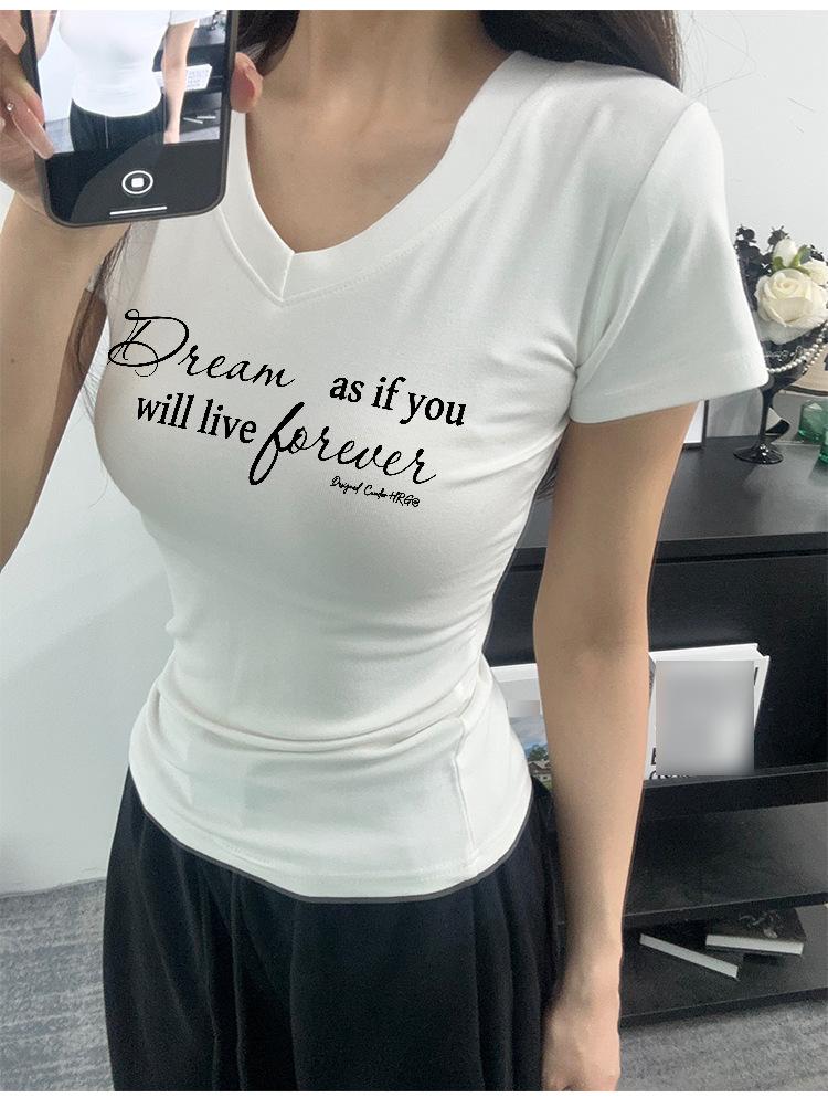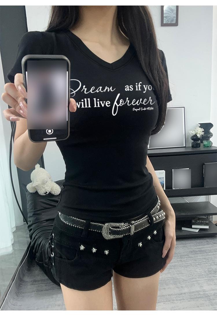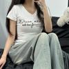 Playera de Manga Corta con Cuello en V y Estampado de Letras de Chica Americana Hot para Mujer 2025 Verano Nueva Deseo Puro Look Adelgazante y Top Elegante