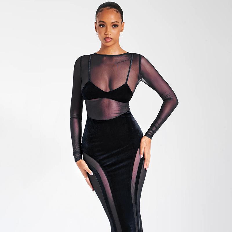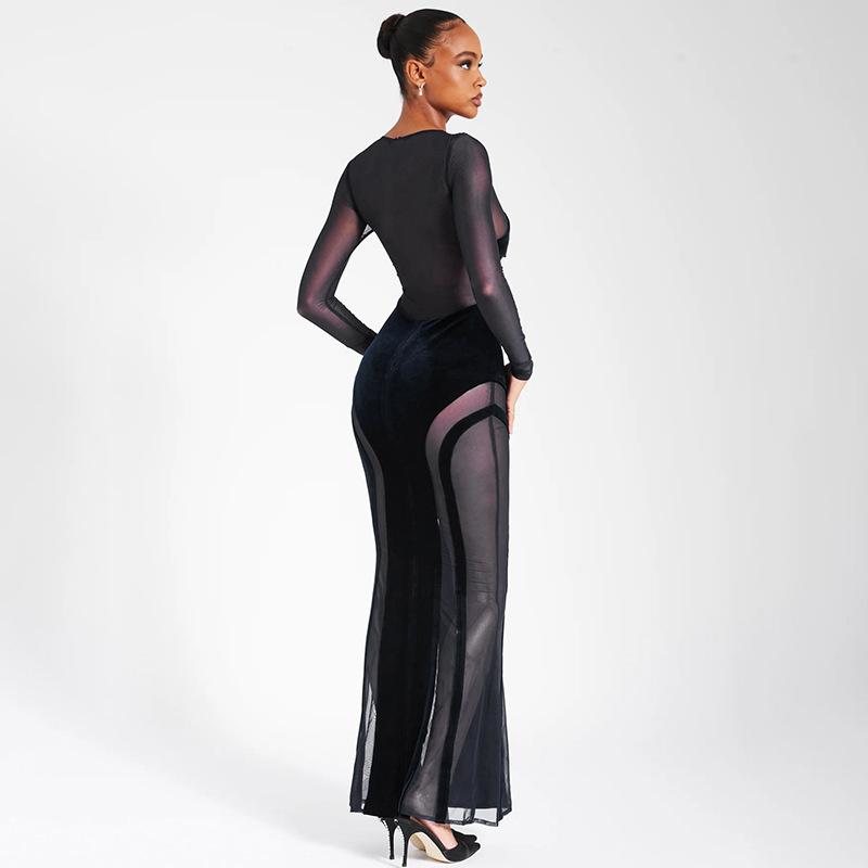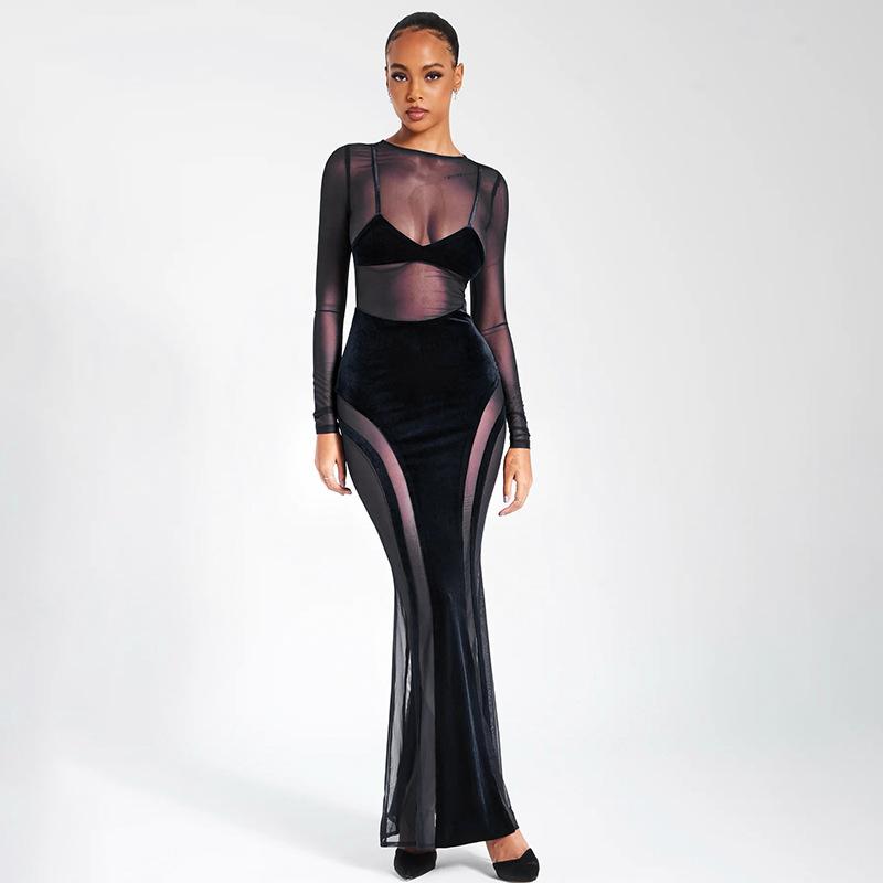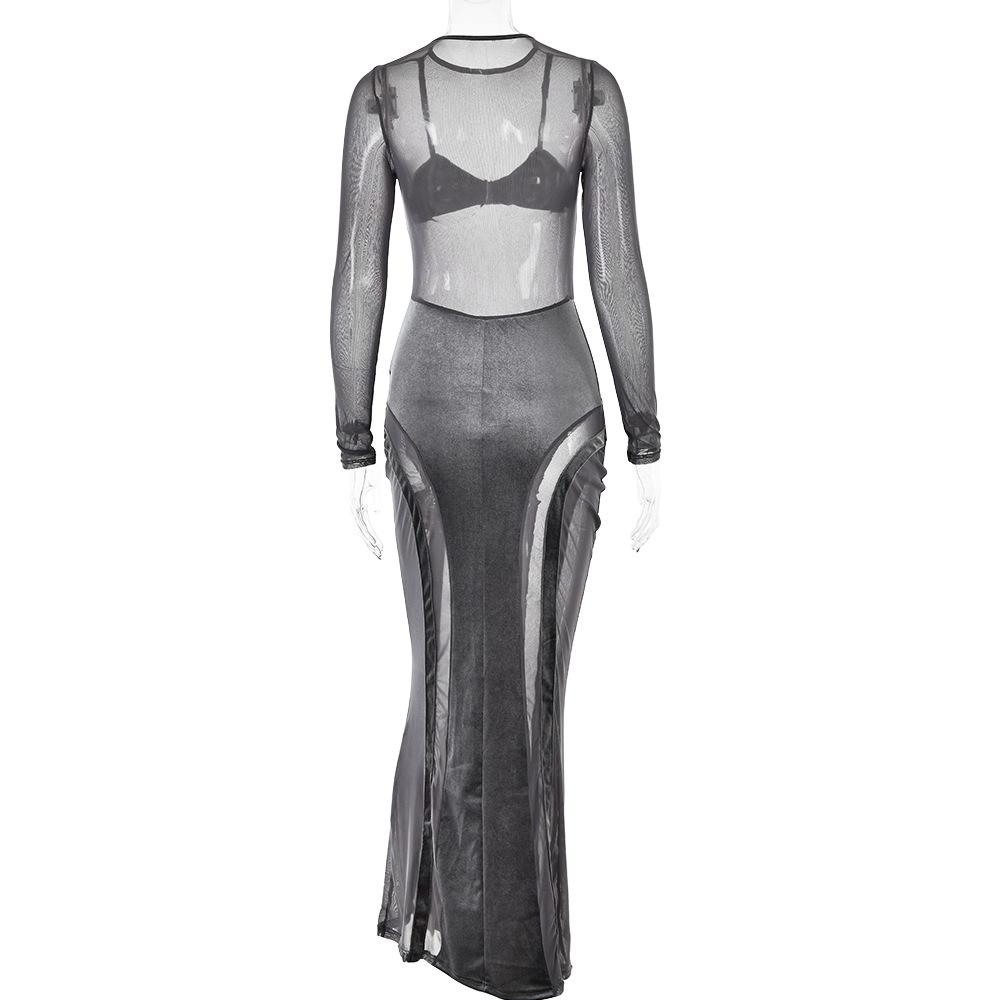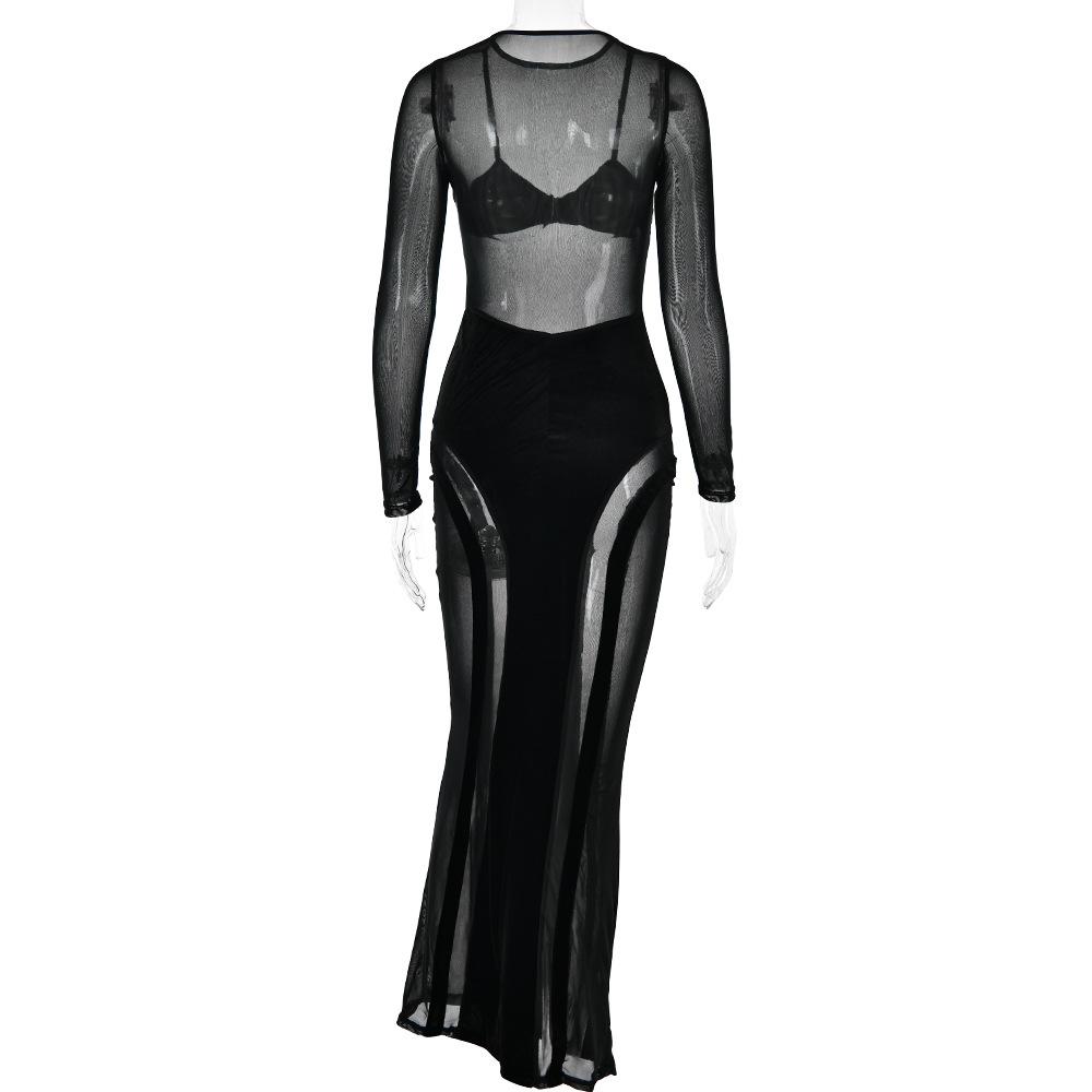 Estilo Europeo y Americano Transfronterizo 2025 Nuevo Vestido Moderno Sexy Ajustado Manga Larga Empalme de Malla Transparente Falda Larga Cubre Caderas
