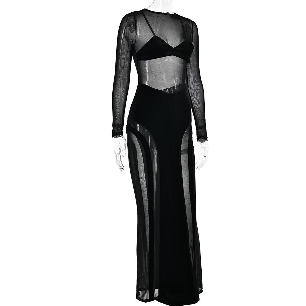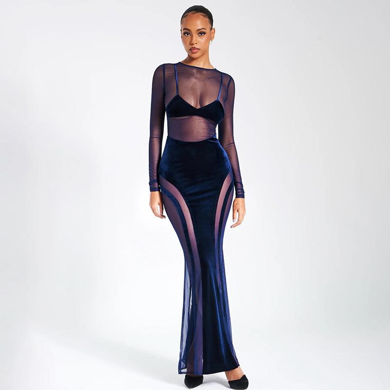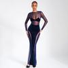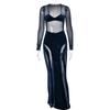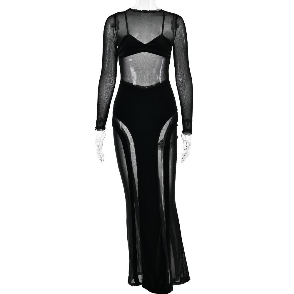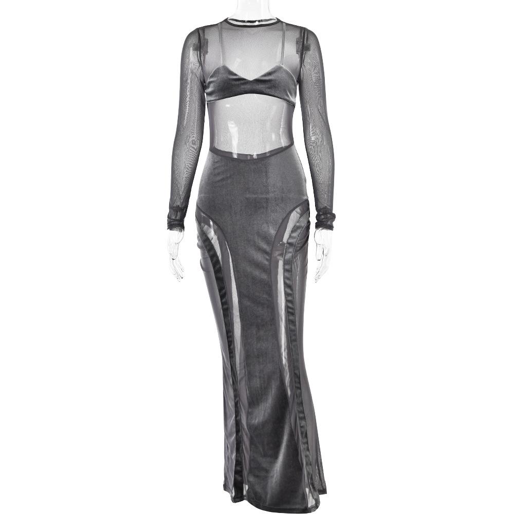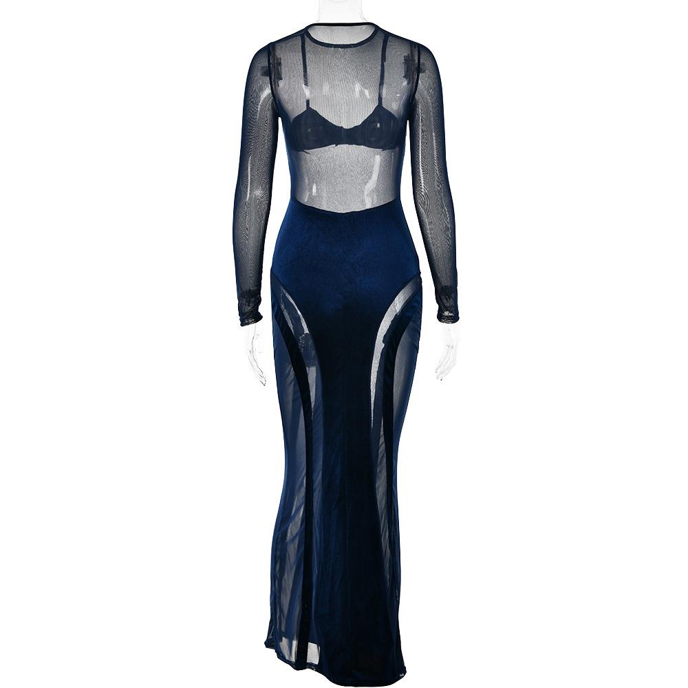 Estilo Europeo y Americano Transfronterizo 2025 Nuevo Vestido Moderno Sexy Ajustado Manga Larga Empalme de Malla Transparente Falda Larga Cubre Caderas