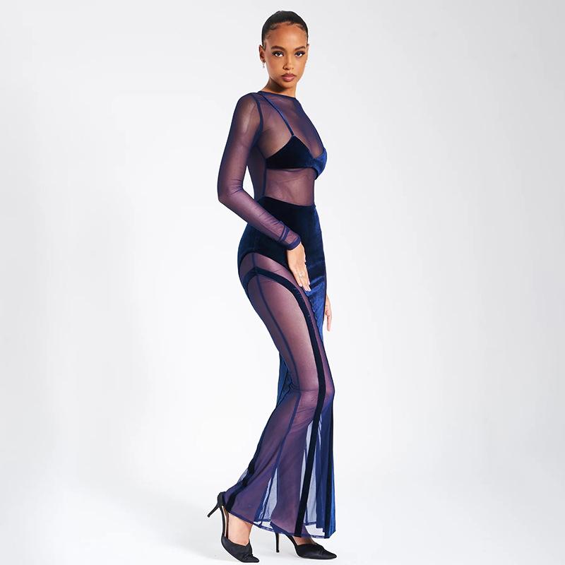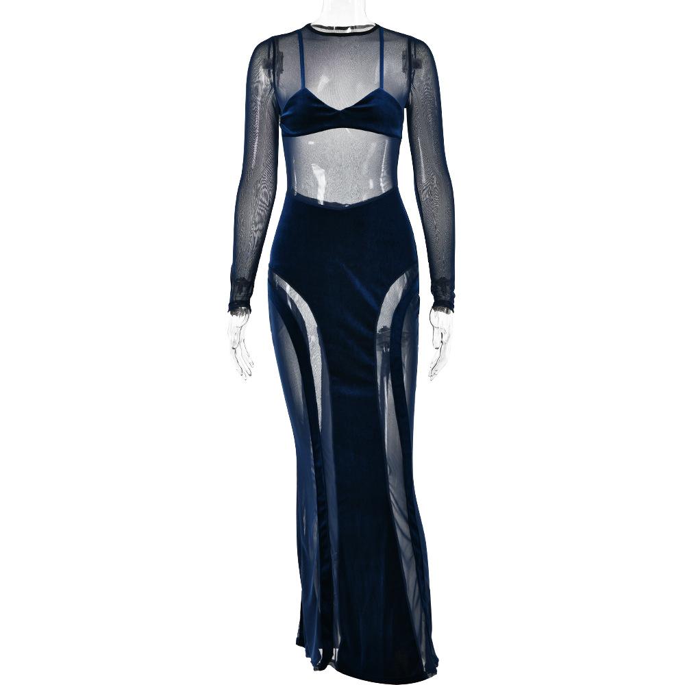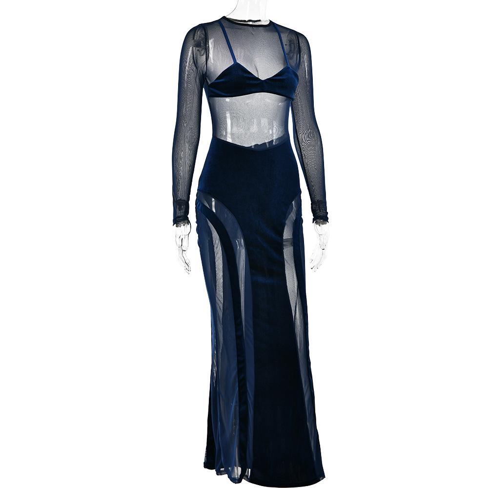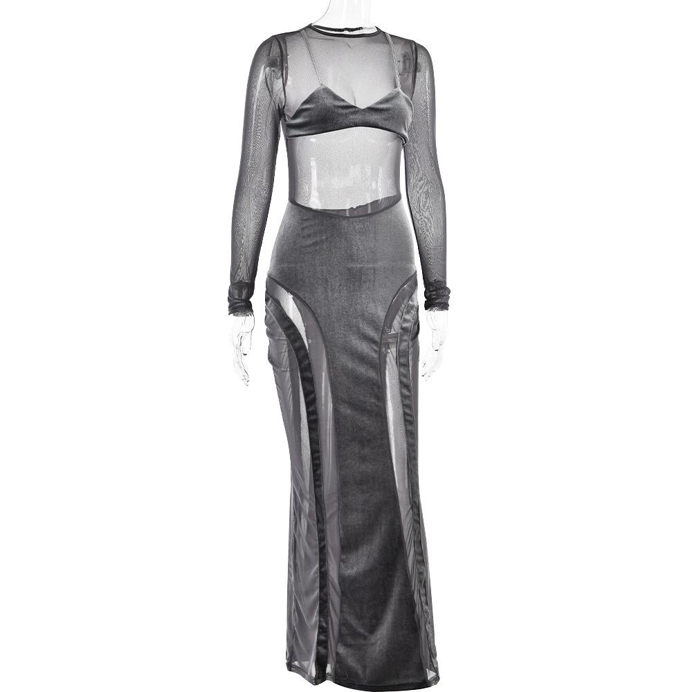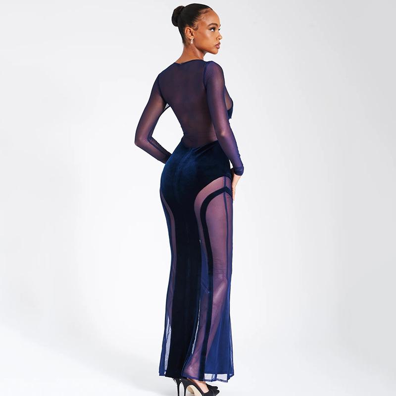 Estilo Europeo y Americano Transfronterizo 2025 Nuevo Vestido Moderno Sexy Ajustado Manga Larga Empalme de Malla Transparente Falda Larga Cubre Caderas