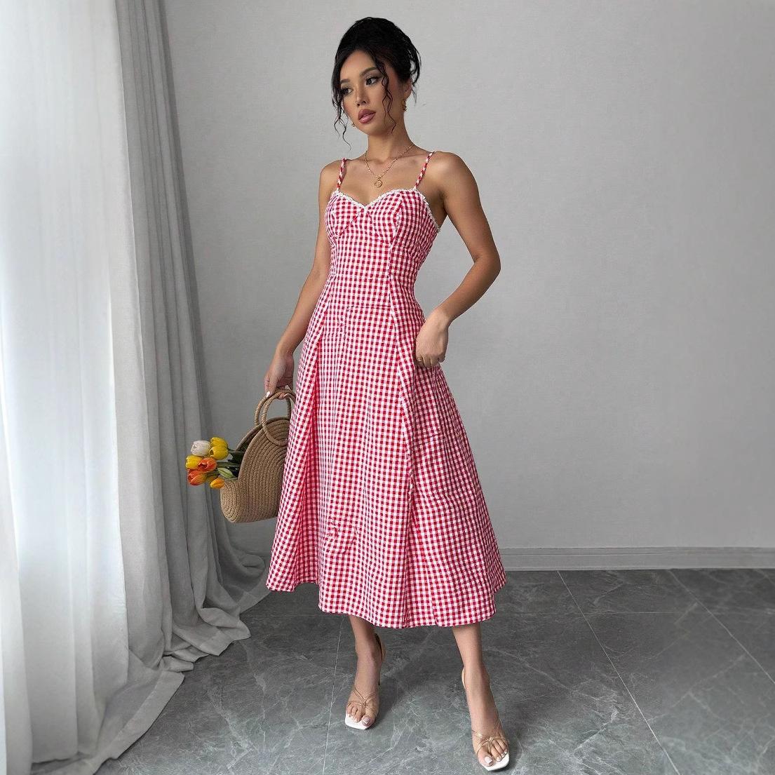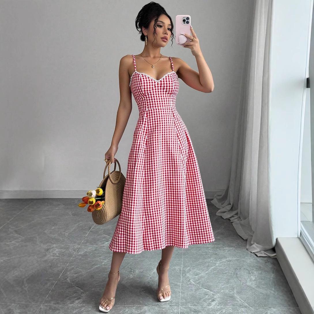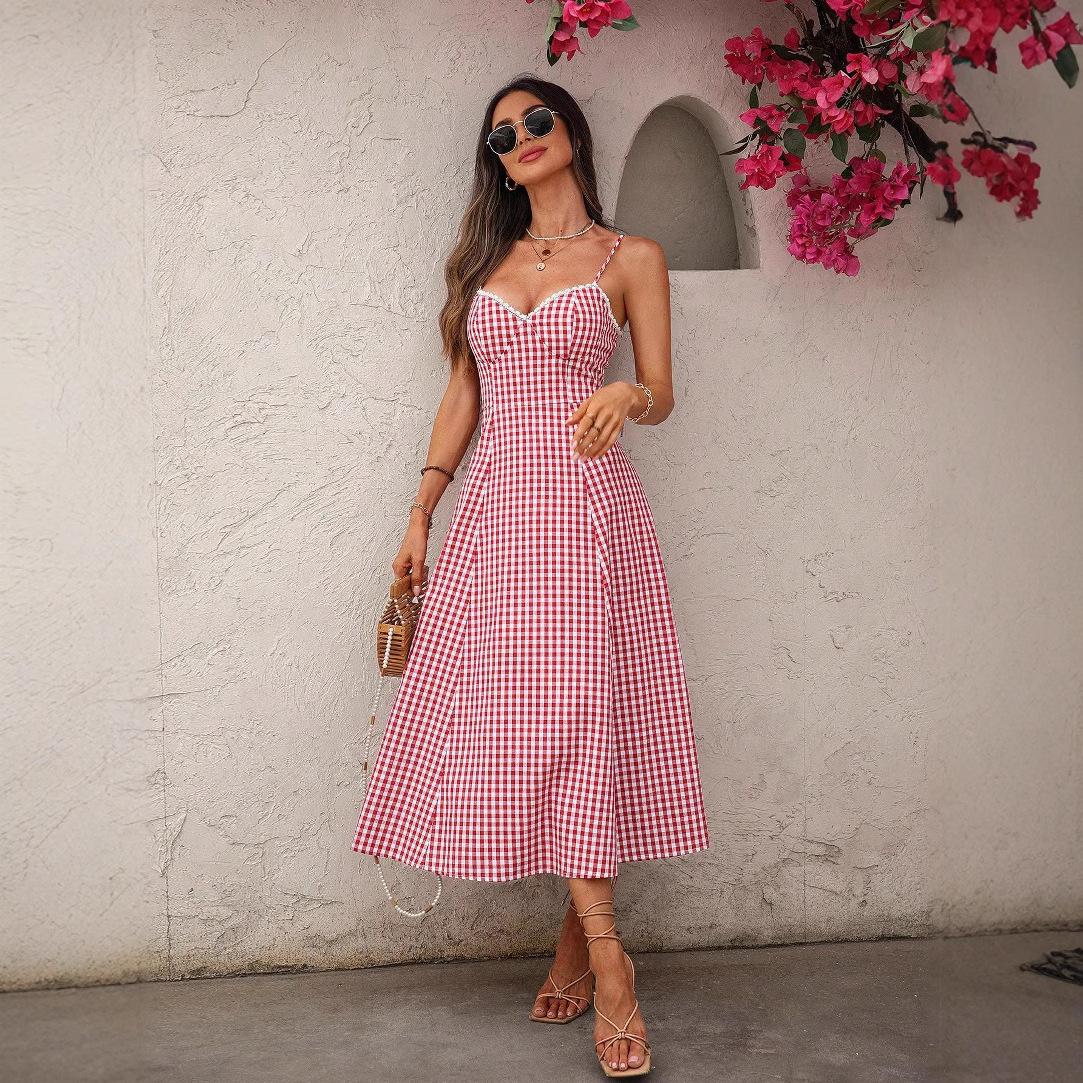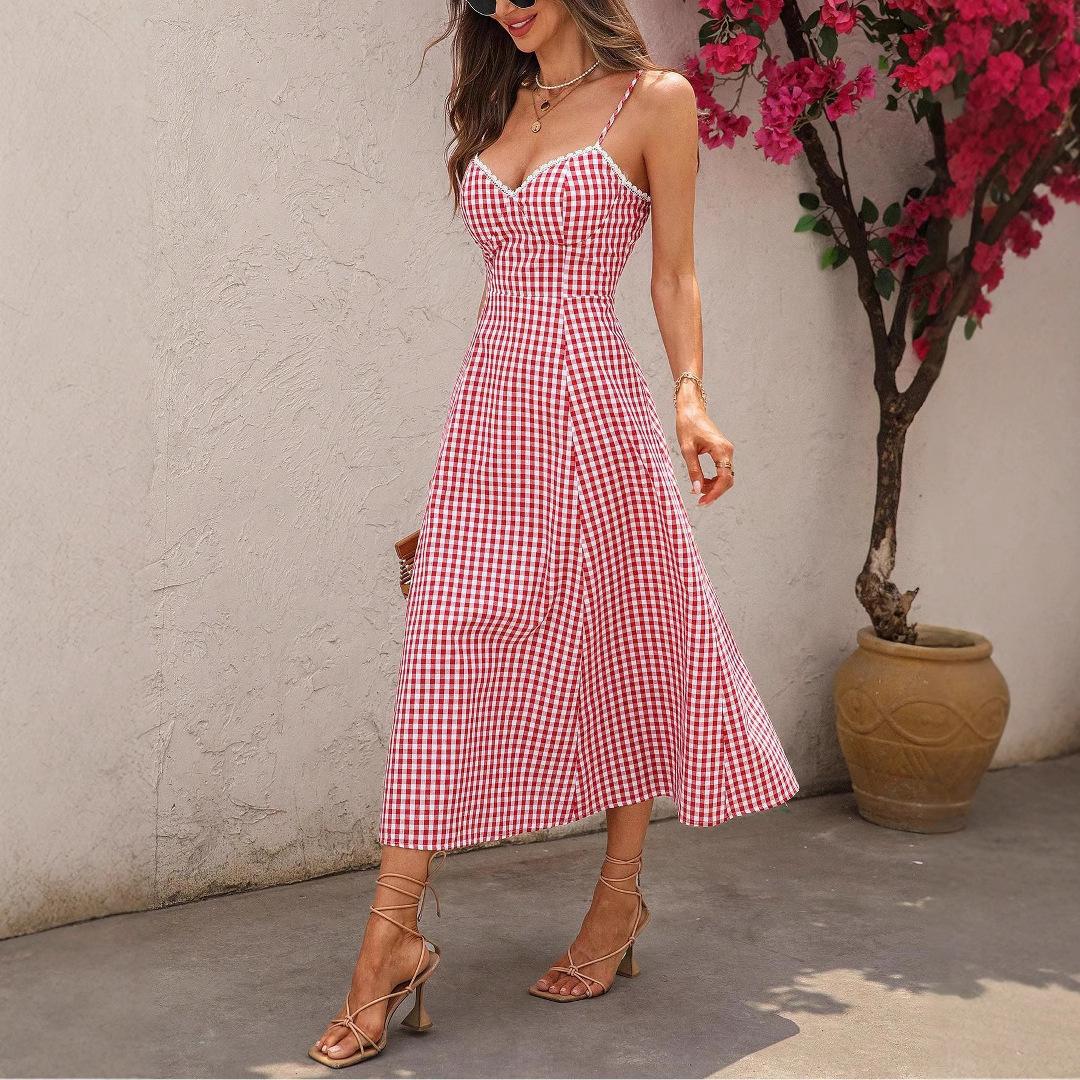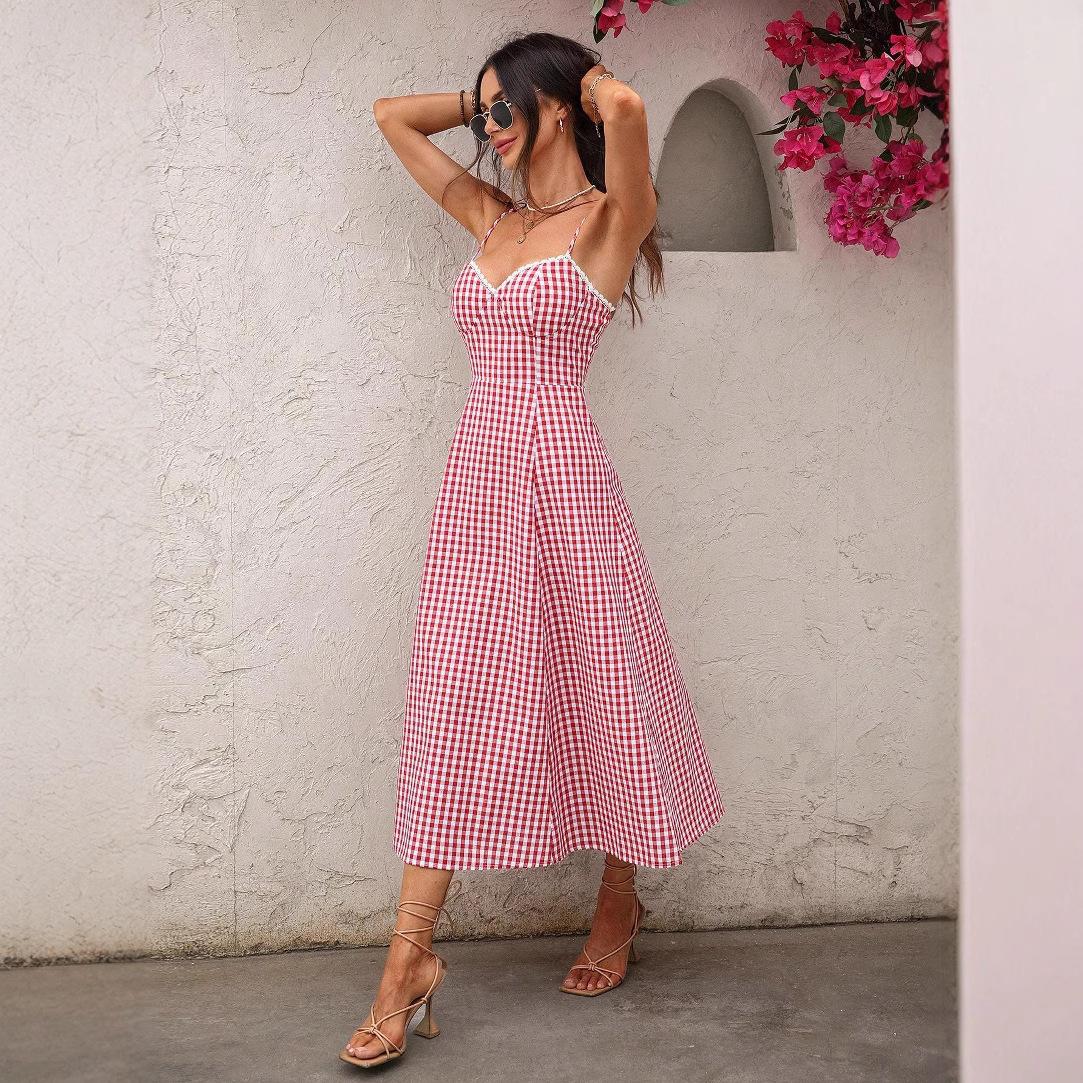 2025 Nuevo Vestido de Tirantes de Cuadros Rojos Franceses Vacaciones en la Playa Falda Larga Adelgazante