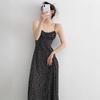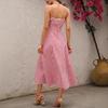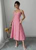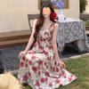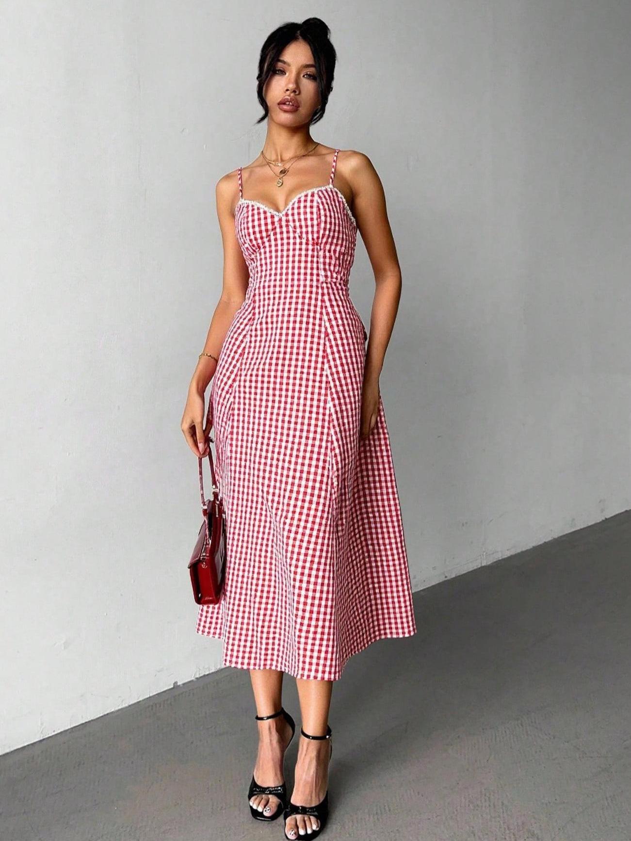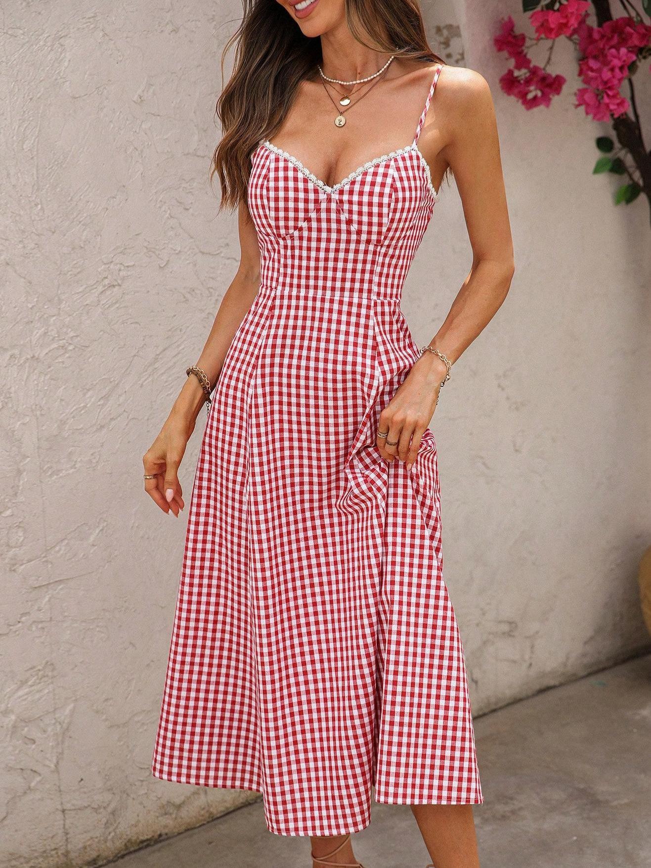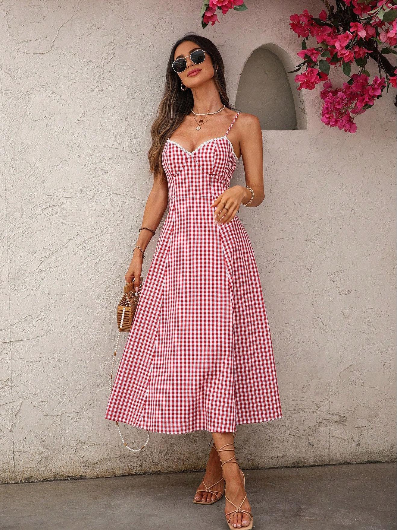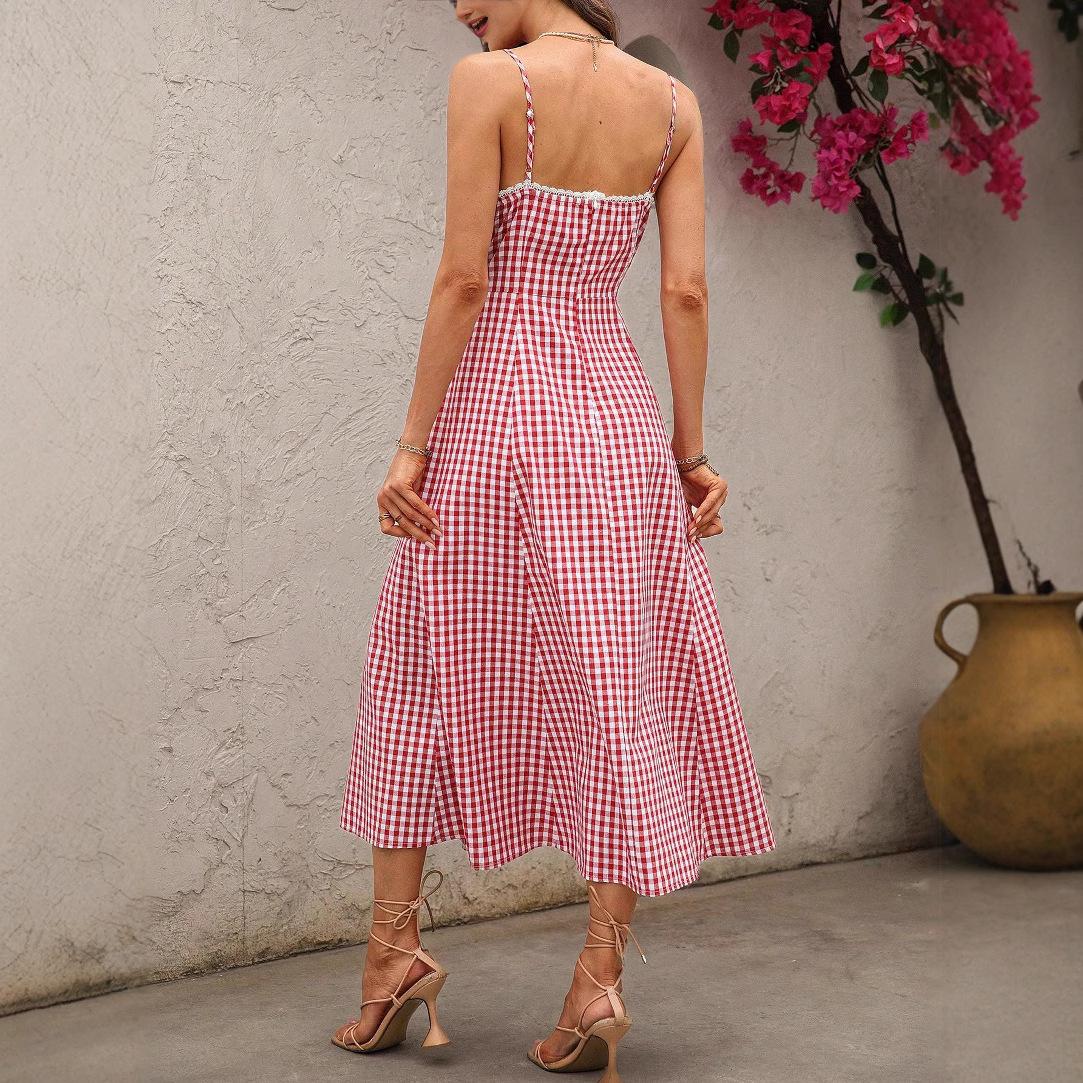 2025 Nuevo Vestido de Tirantes de Cuadros Rojos Franceses Vacaciones en la Playa Falda Larga Adelgazante