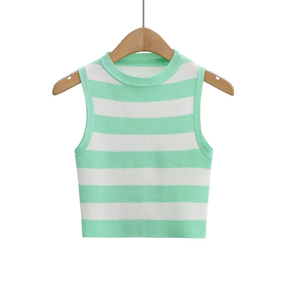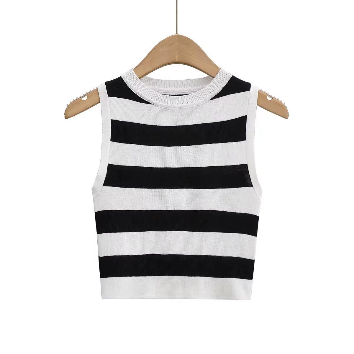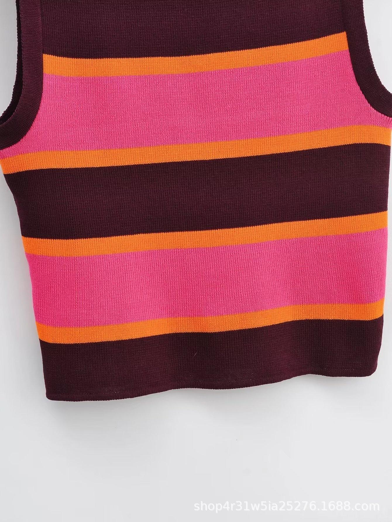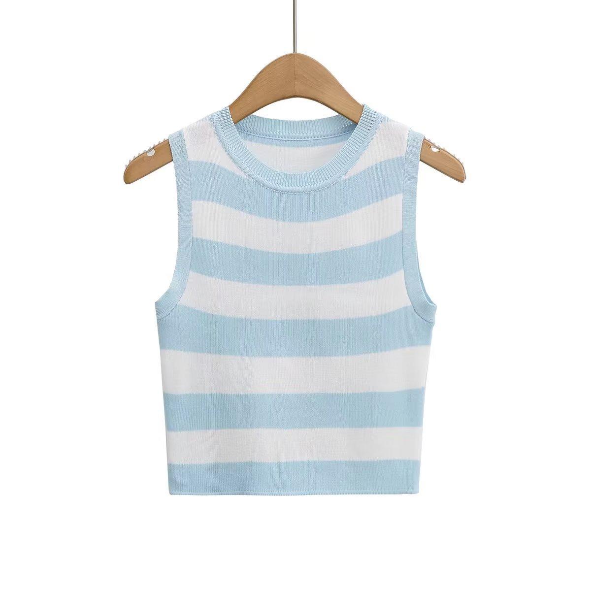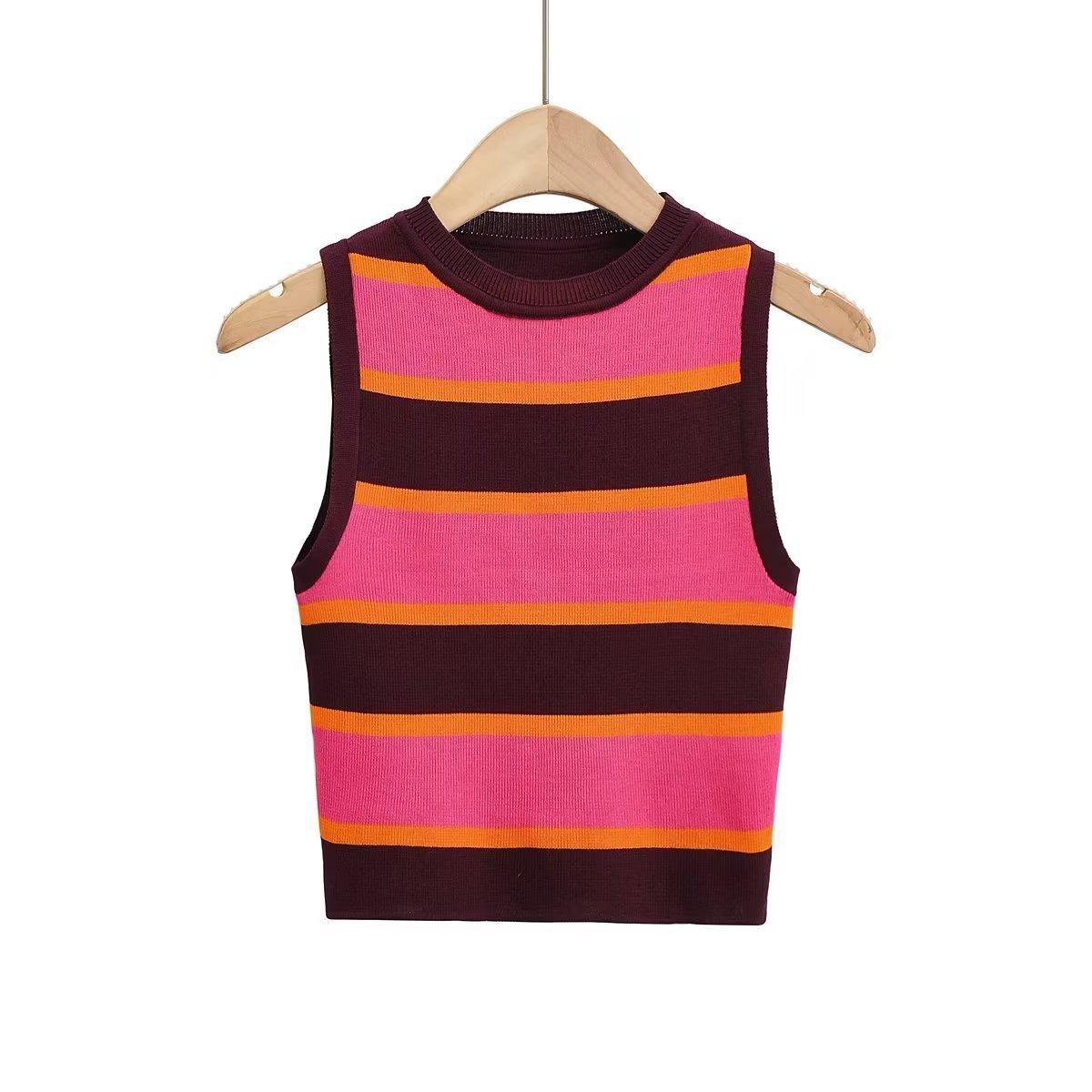 Estilo europeo y americano 2023 Otoño Nuevo delgado ajustado cuello redondo sin mangas rayas tejido pequeño Chaleco para mujer al por mayor