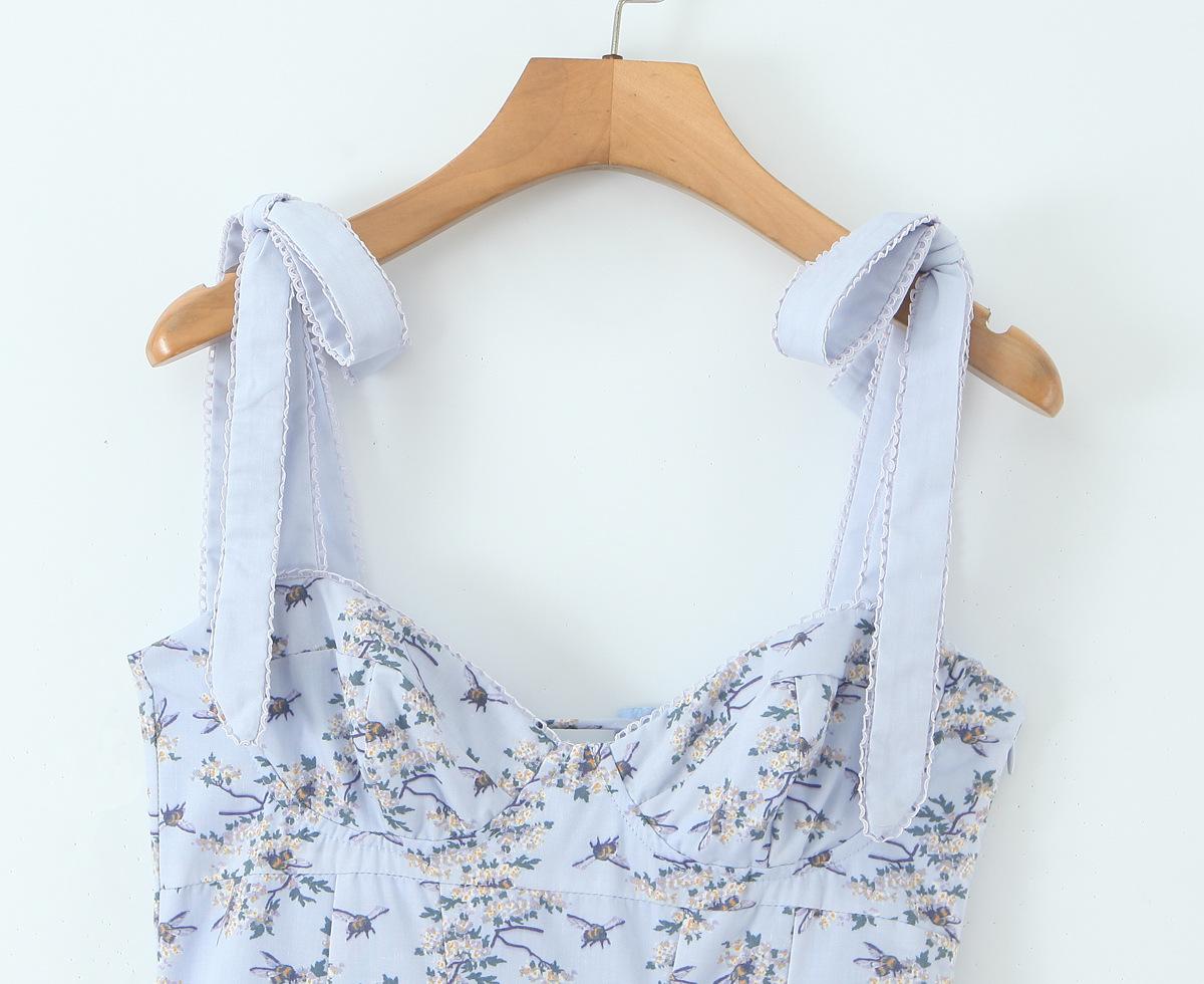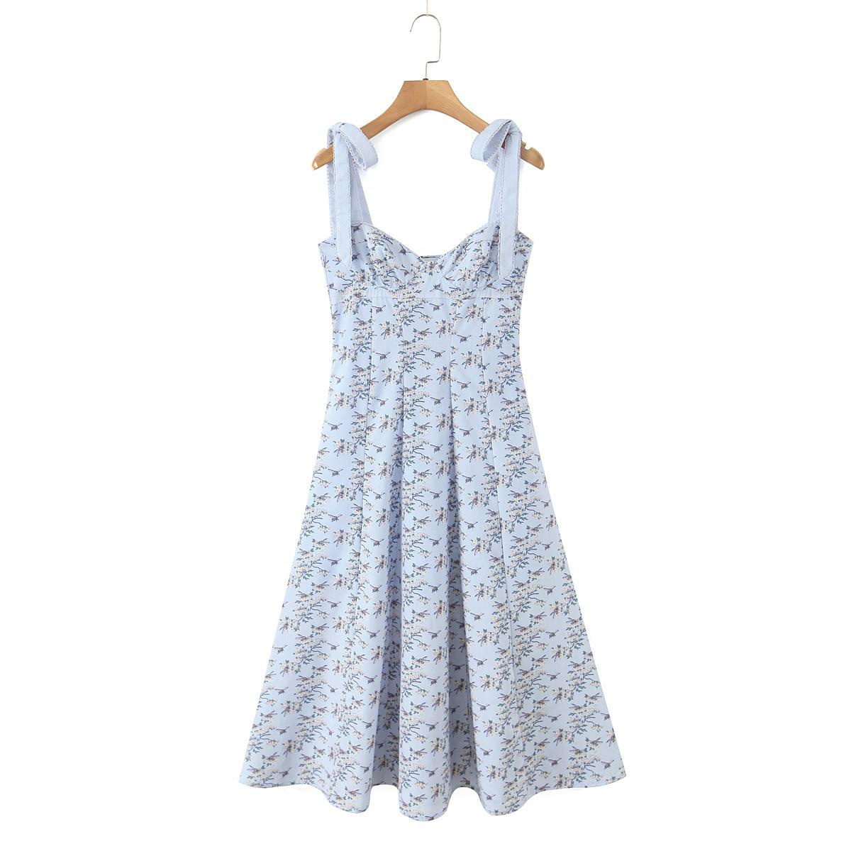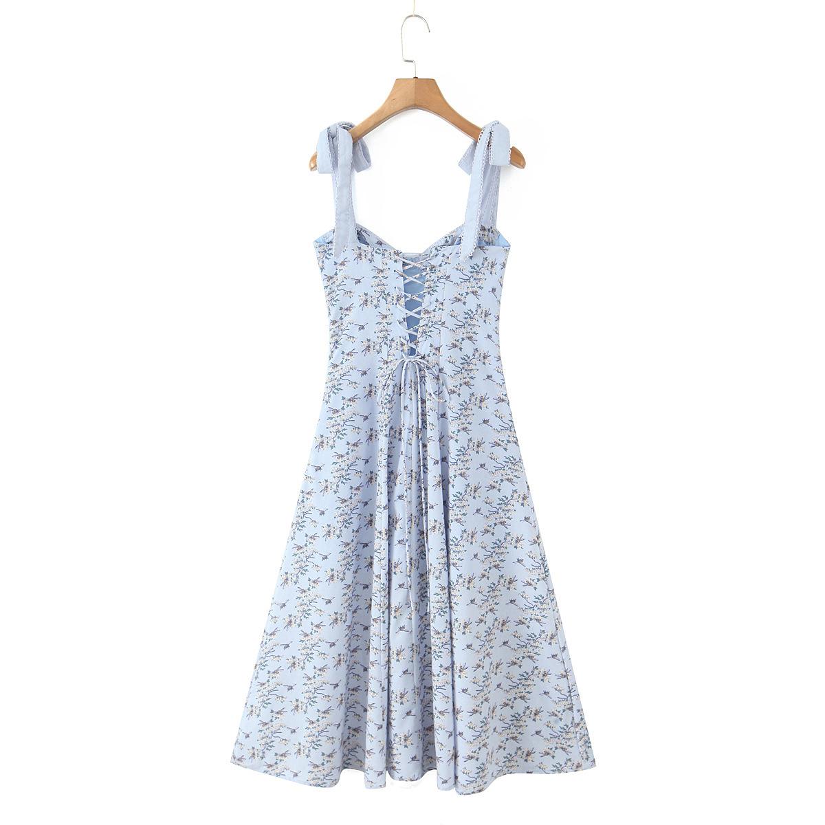 7546-25 Vestido de Verano Azul de Algodón Estampado de Largo Medio con Tirantes y Botones Vestido Largo