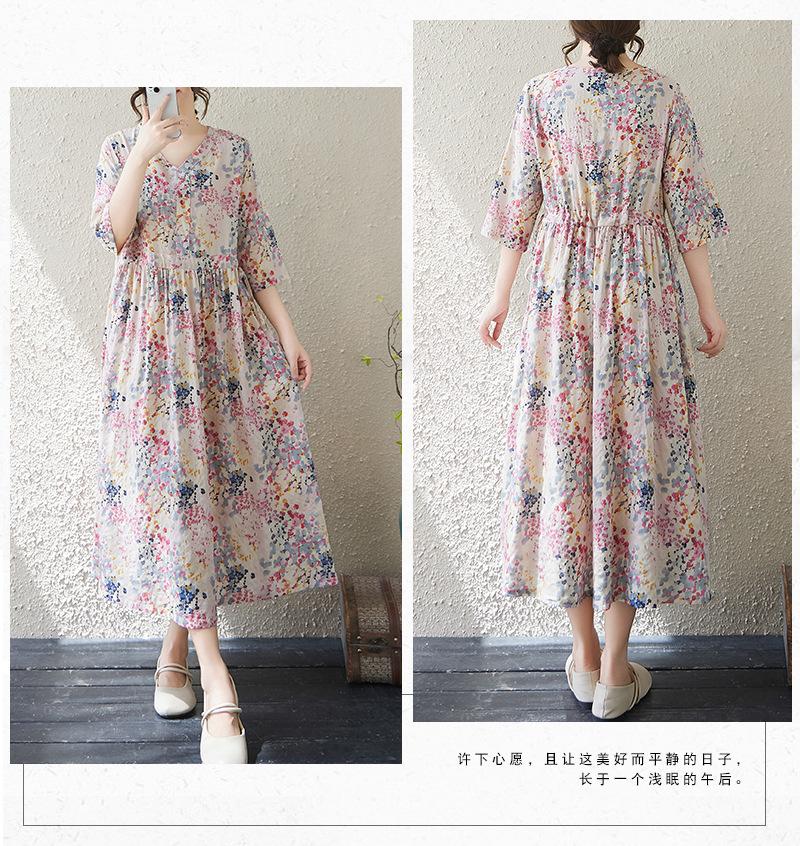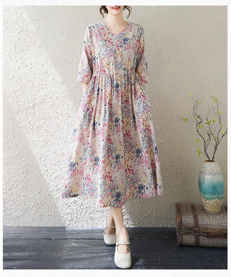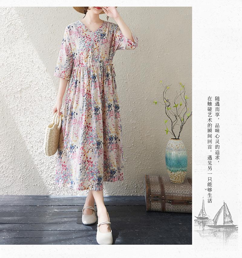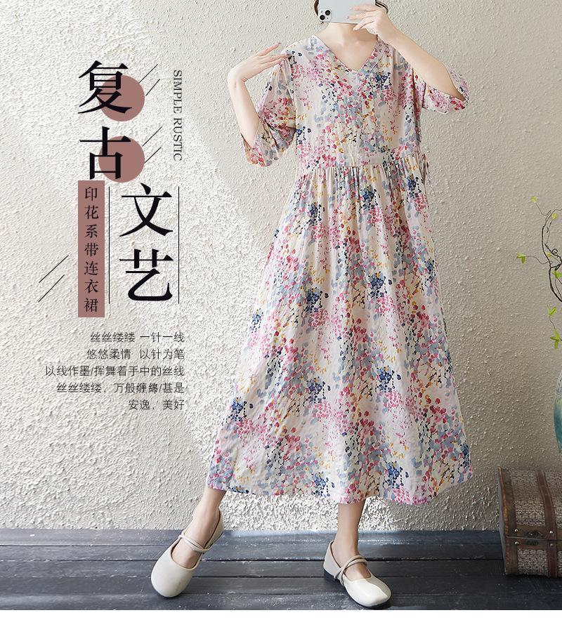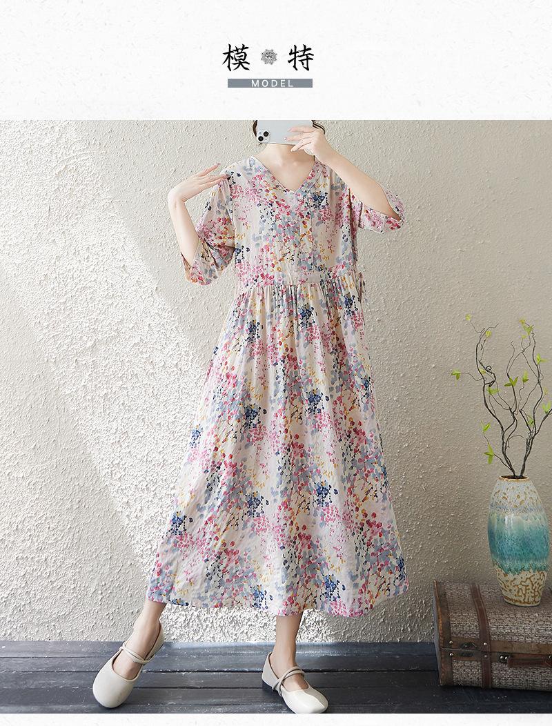 Vestido Retro 2025 para Mujer Cuello en V Cintura Adelgazante Look Falda Versátil Largo Medio Vestido de Té de Verano Bata Estampada Artística