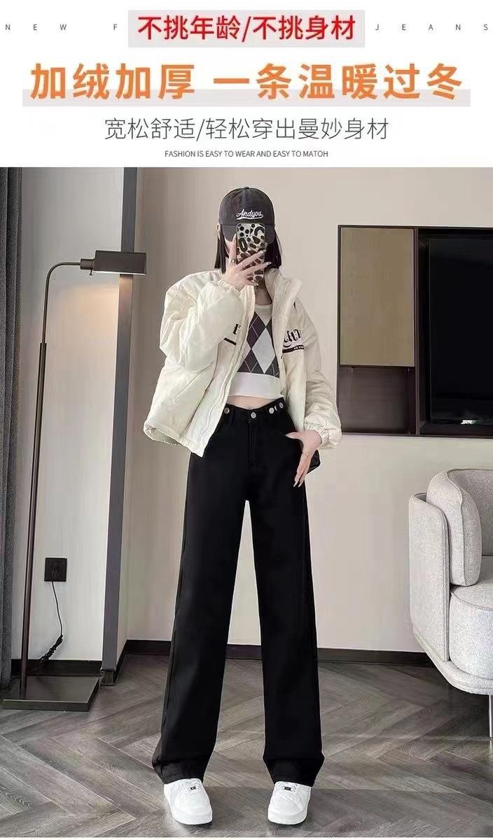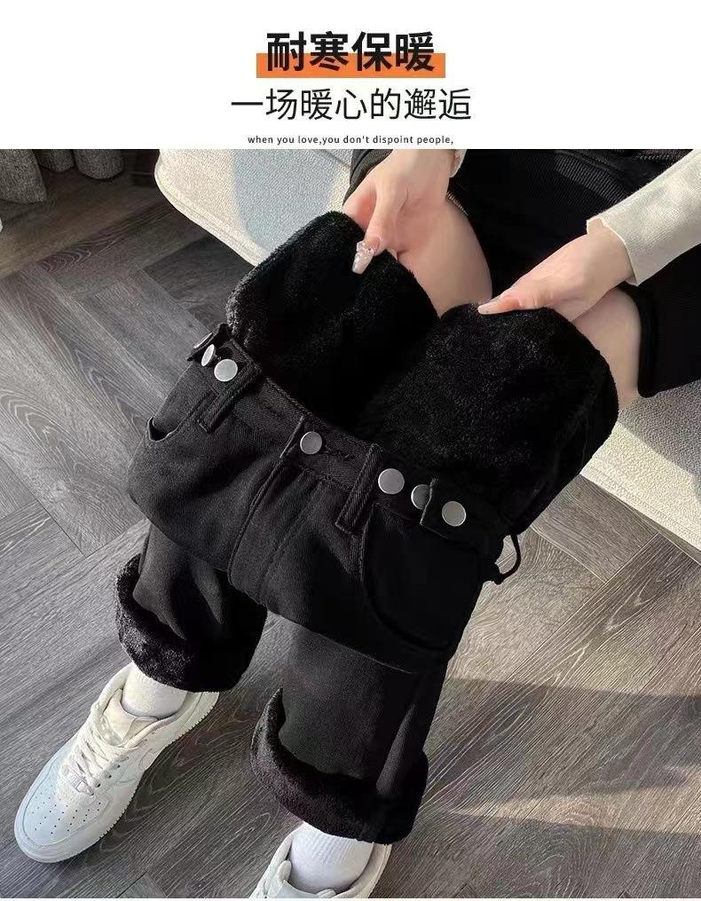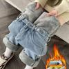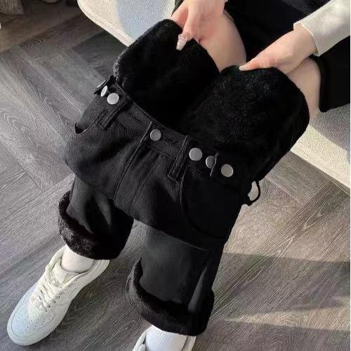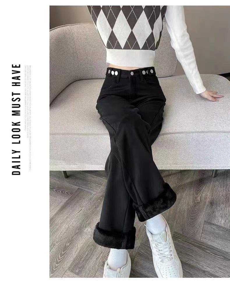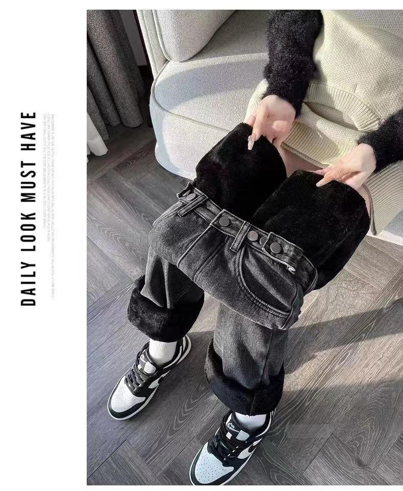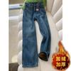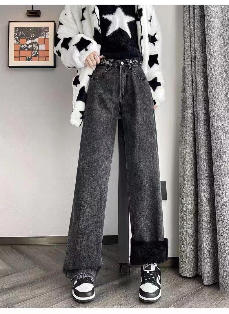 Jeans de Pierna Ancha Gruesos para Mujer de Cintura Alta Holgados Adelgazantes 2024 Invierno Cálidos Pantalones Rectos Pantalones Forrados de Felpa