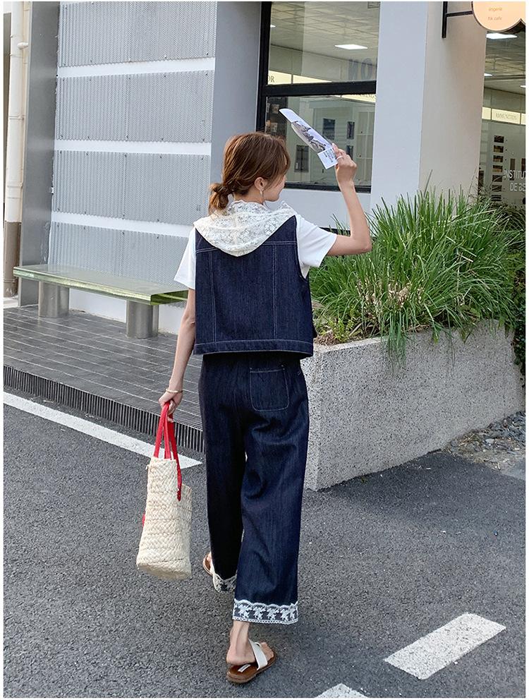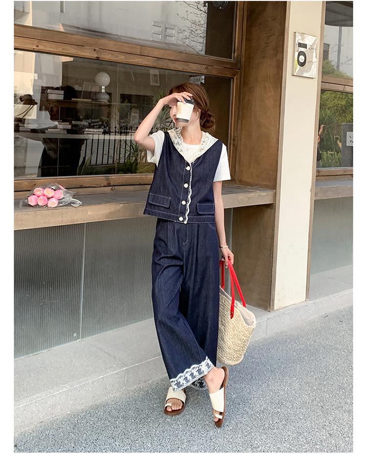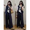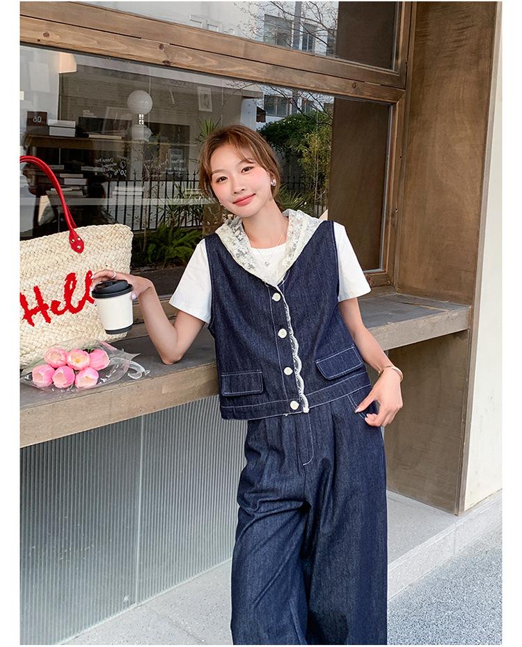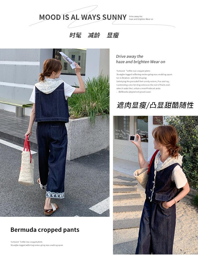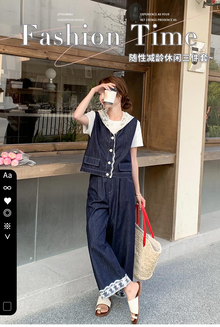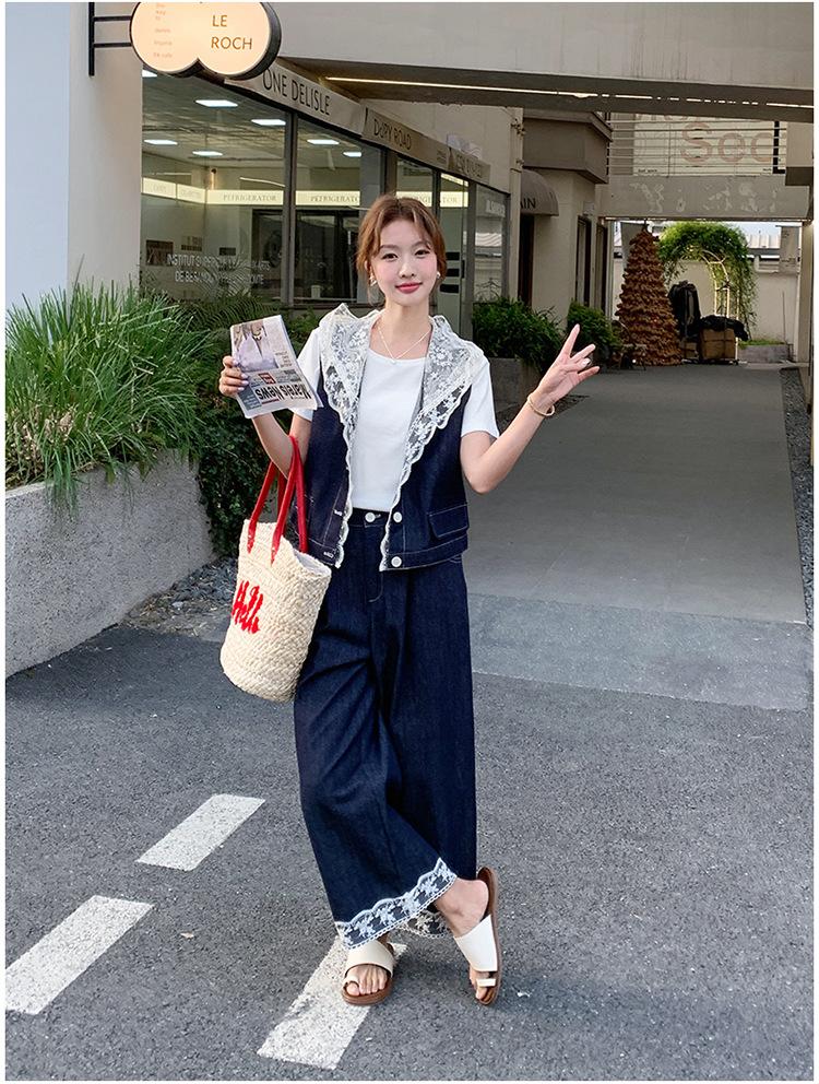 Conjunto de Tres Piezas de Chaleco de Mezclilla con Capucha de Encaje para Mujer Verano 2025, Pantalones de Pierna Ancha, Hermoso Traje de Estilo Coreano a la Moda