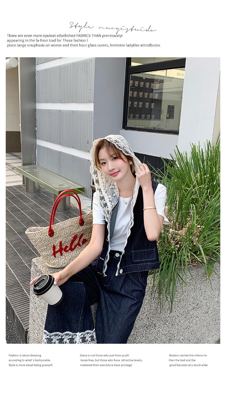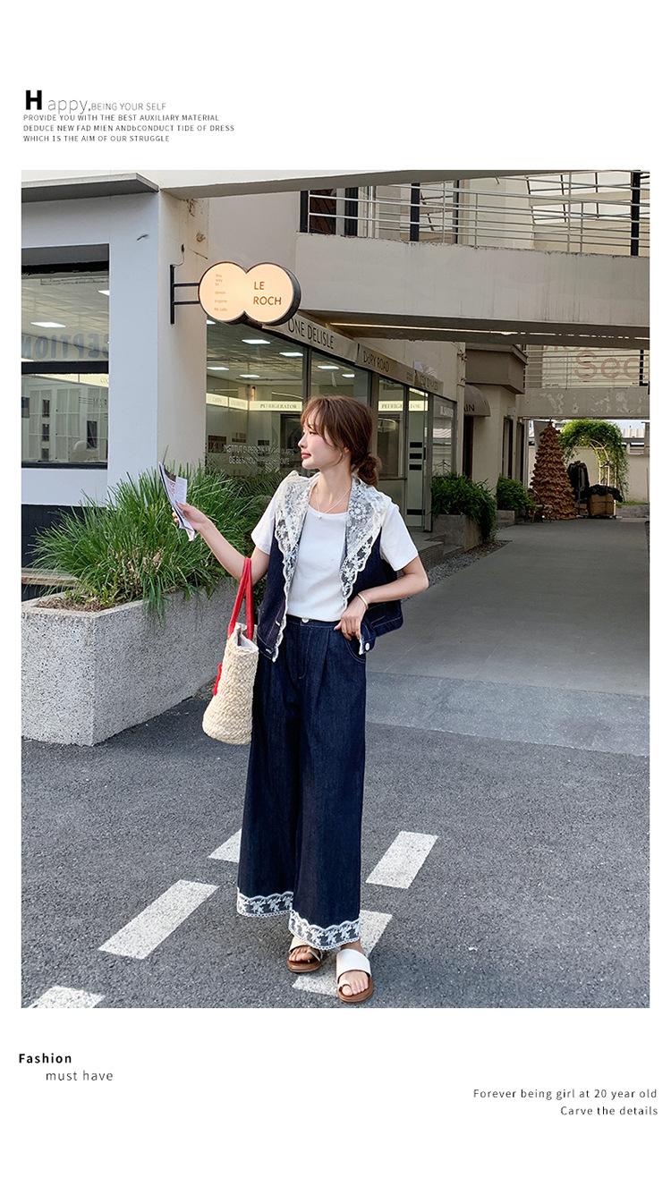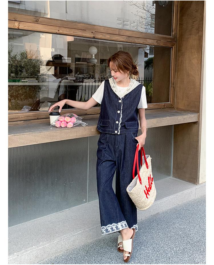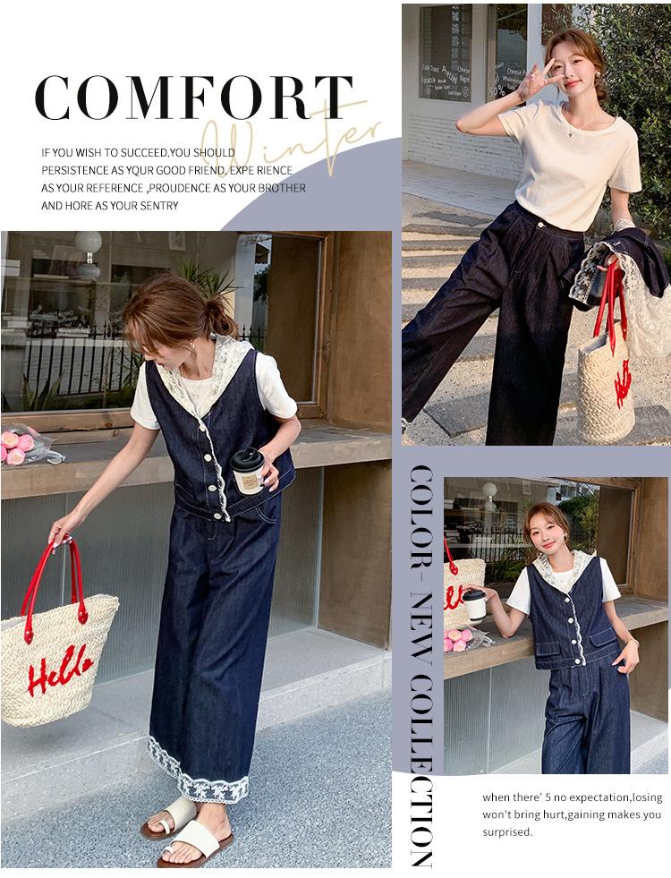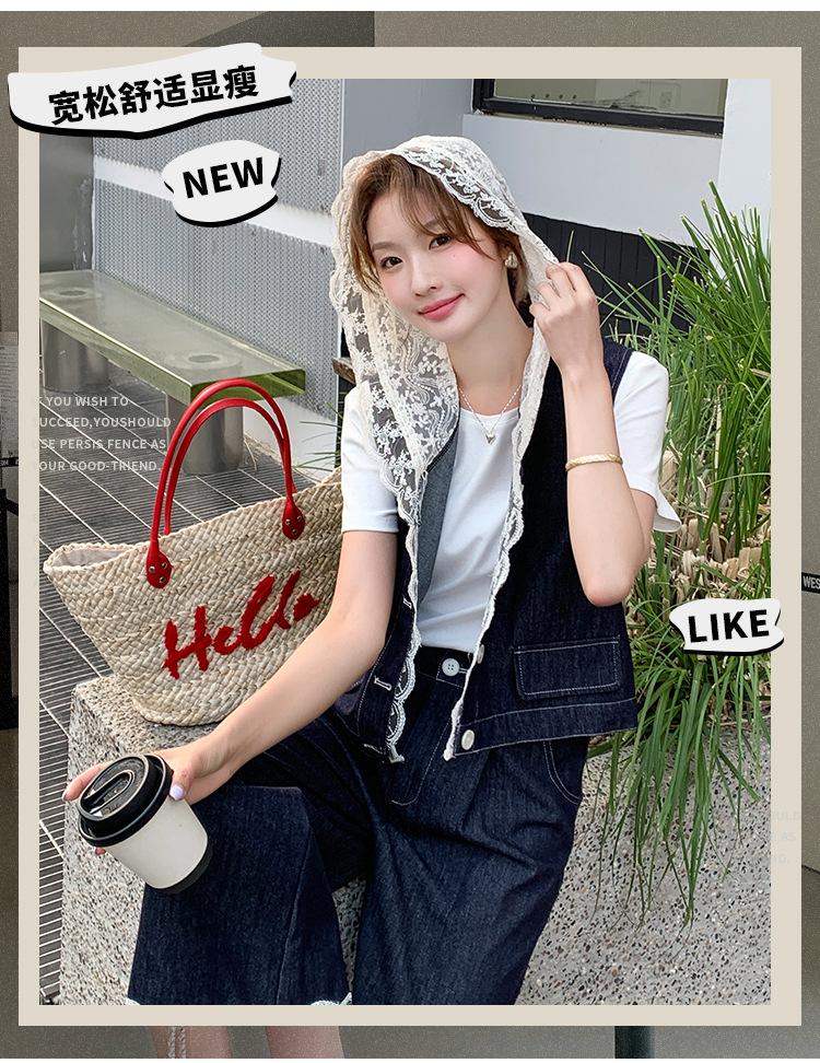 Conjunto de Tres Piezas de Chaleco de Mezclilla con Capucha de Encaje para Mujer Verano 2025, Pantalones de Pierna Ancha, Hermoso Traje de Estilo Coreano a la Moda