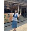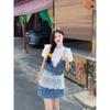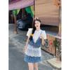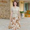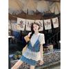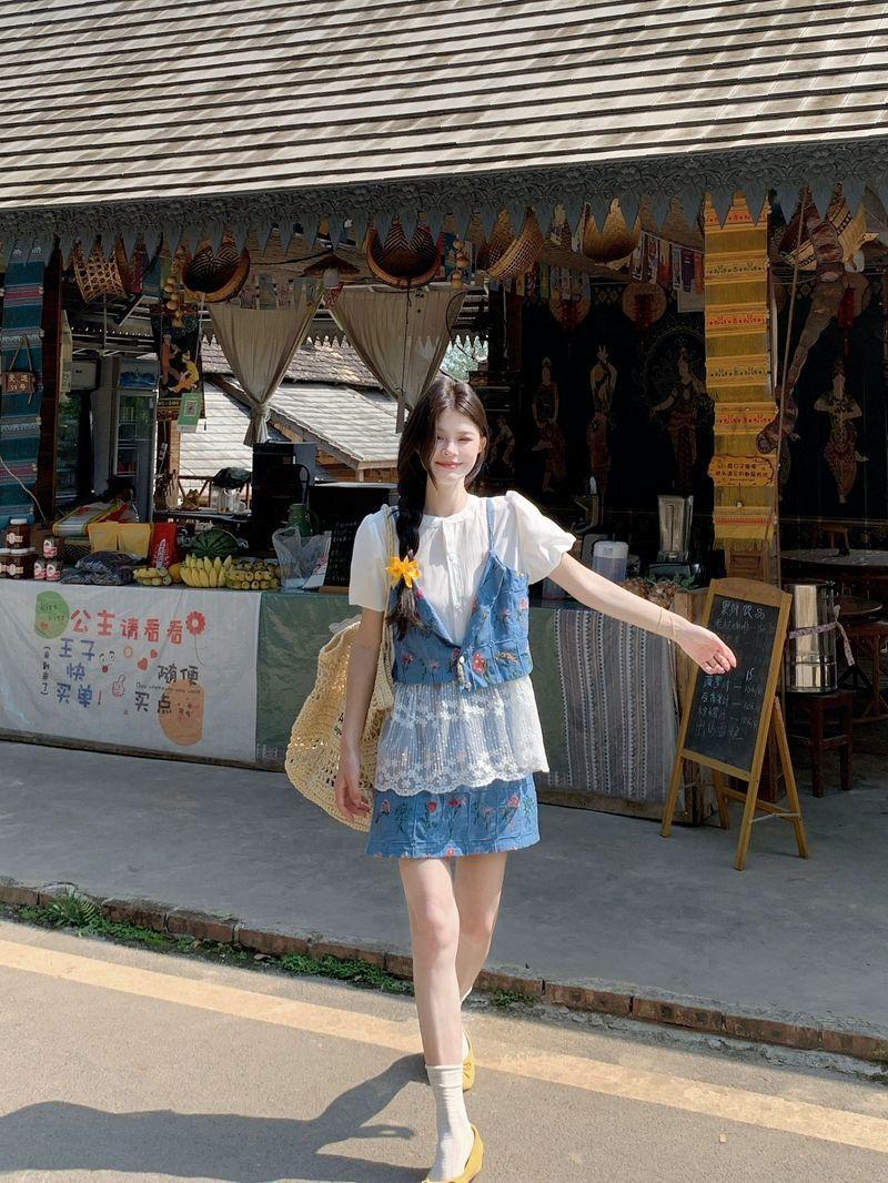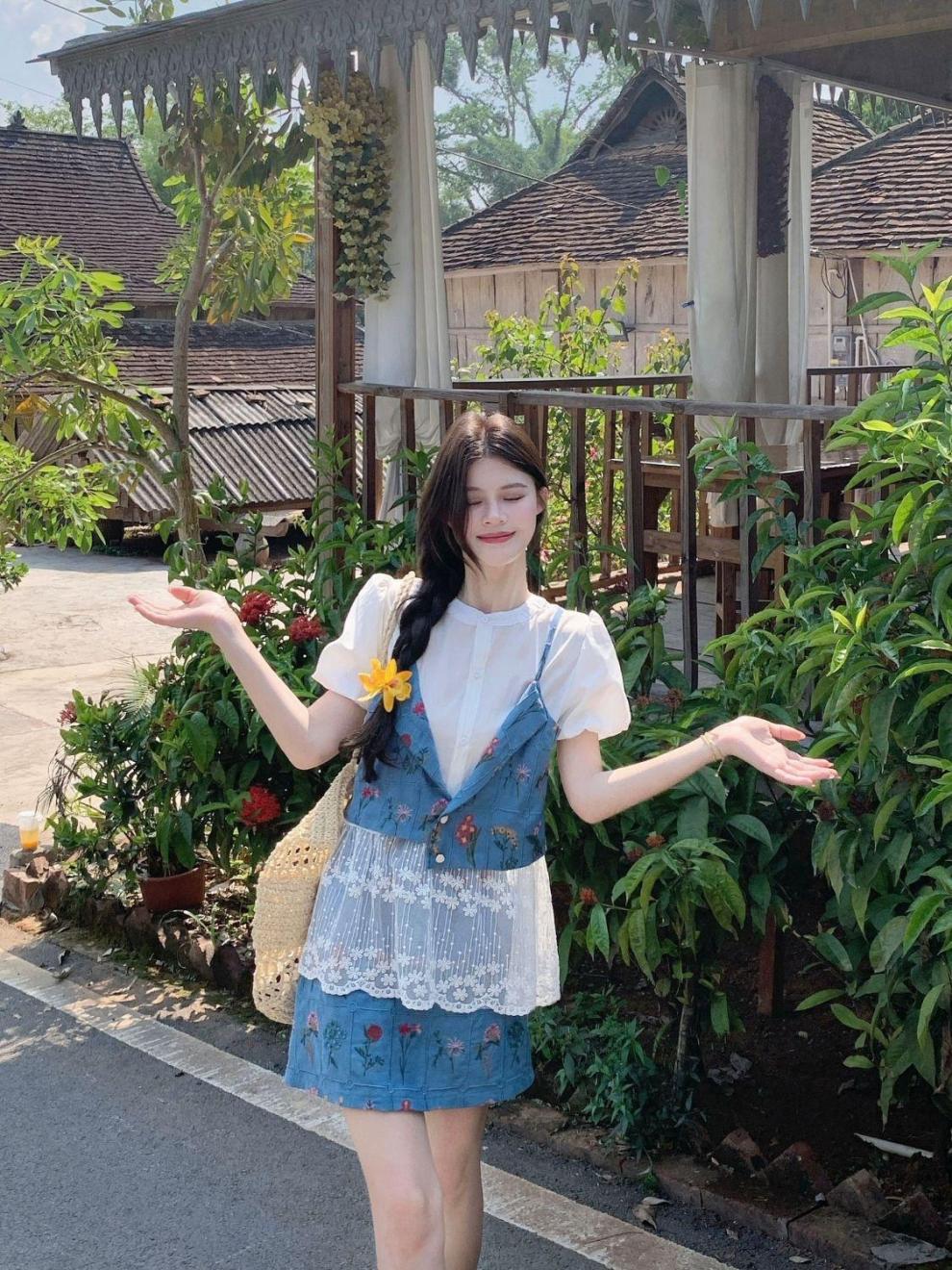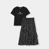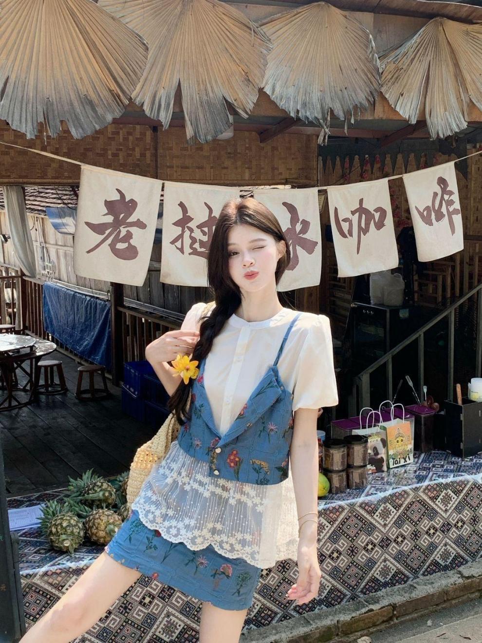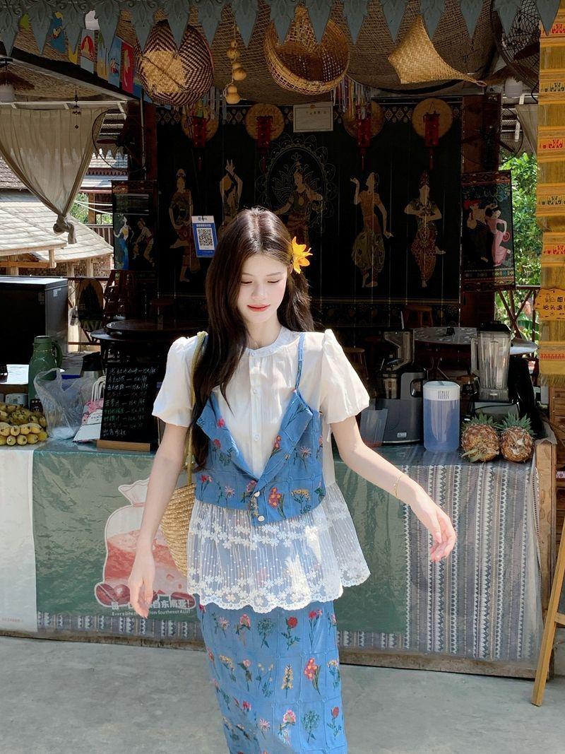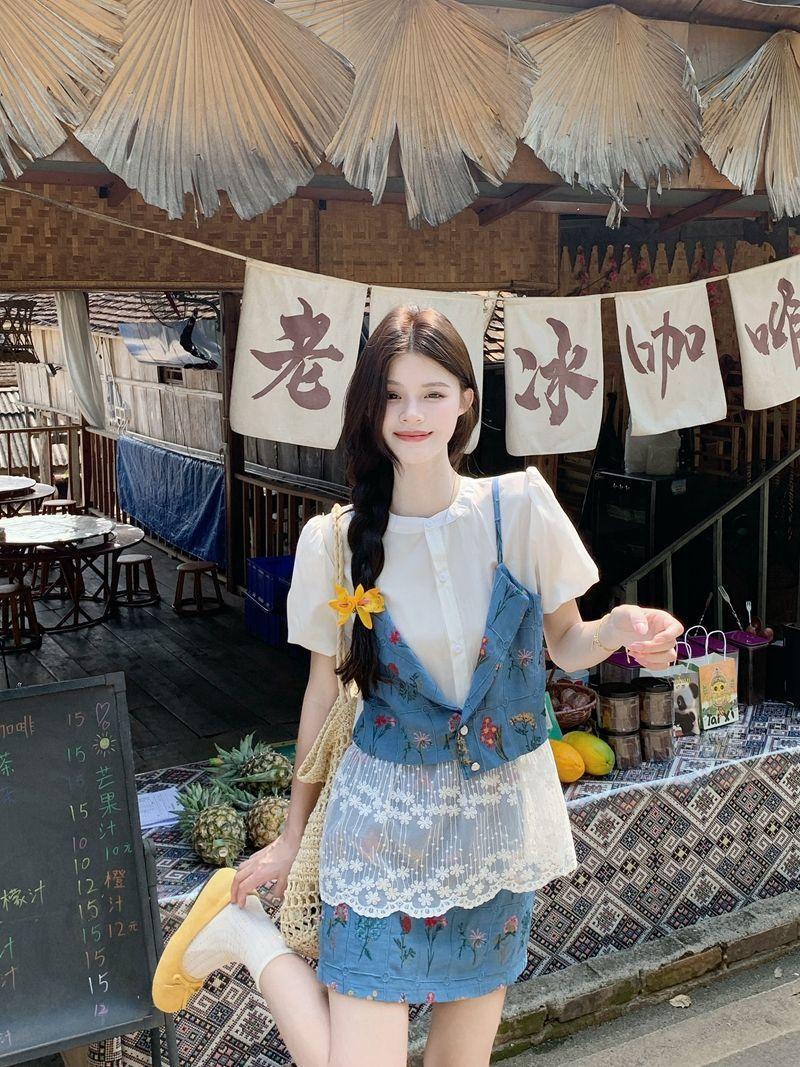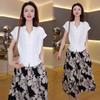 Traje de Moda Encaje Empalmado Camisa de Manga Corta para Mujer 2025 Verano Nuevo Falda Floral Falda A-Line Conjunto de Dos Piezas