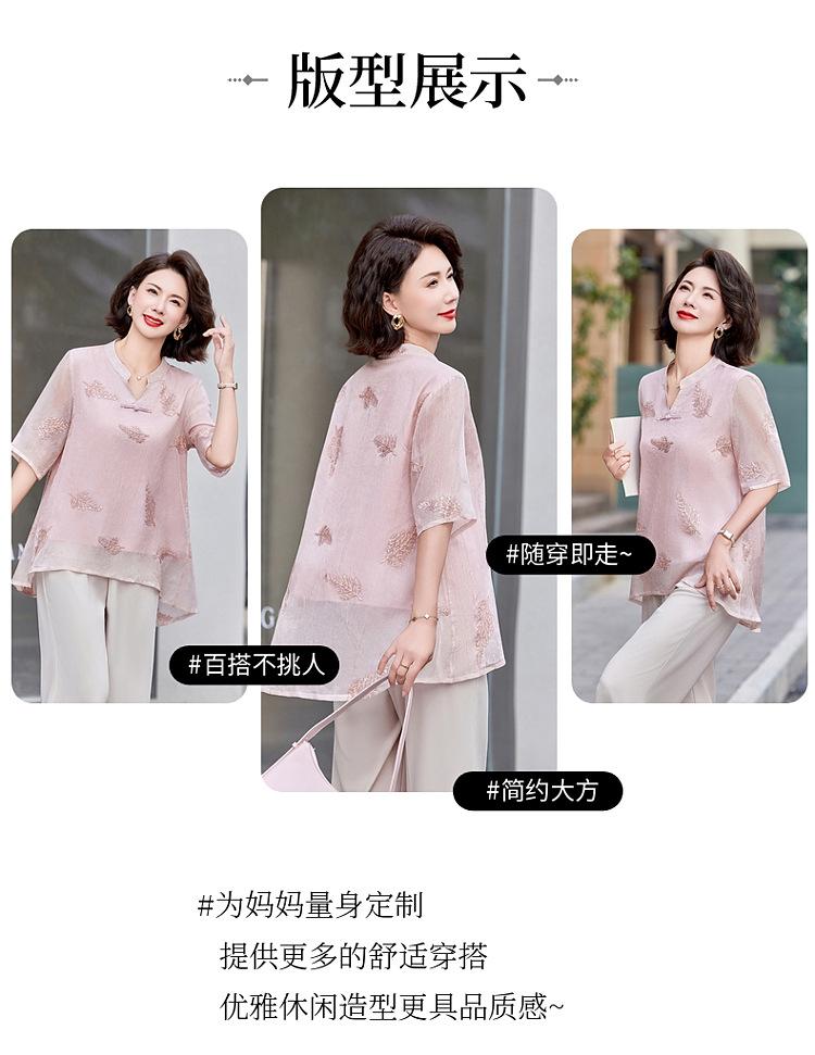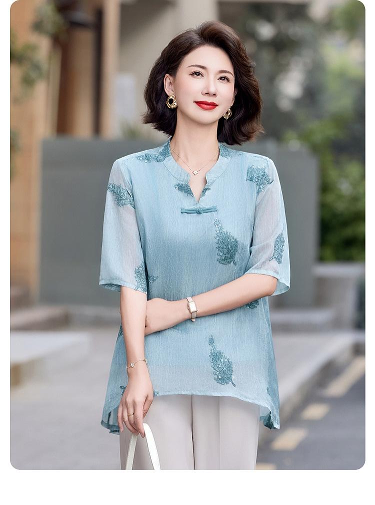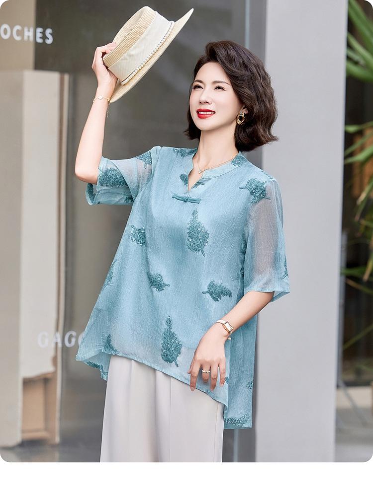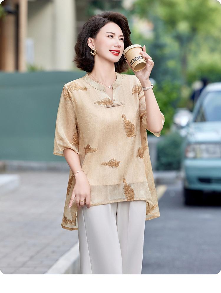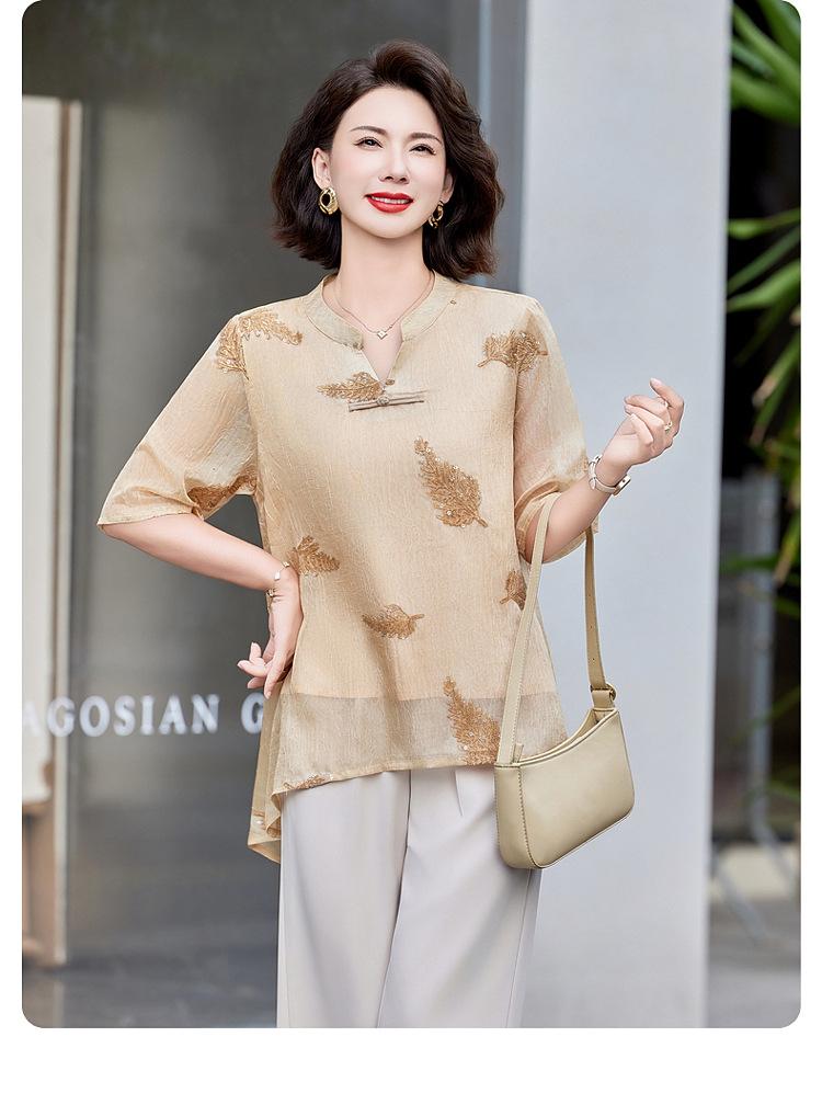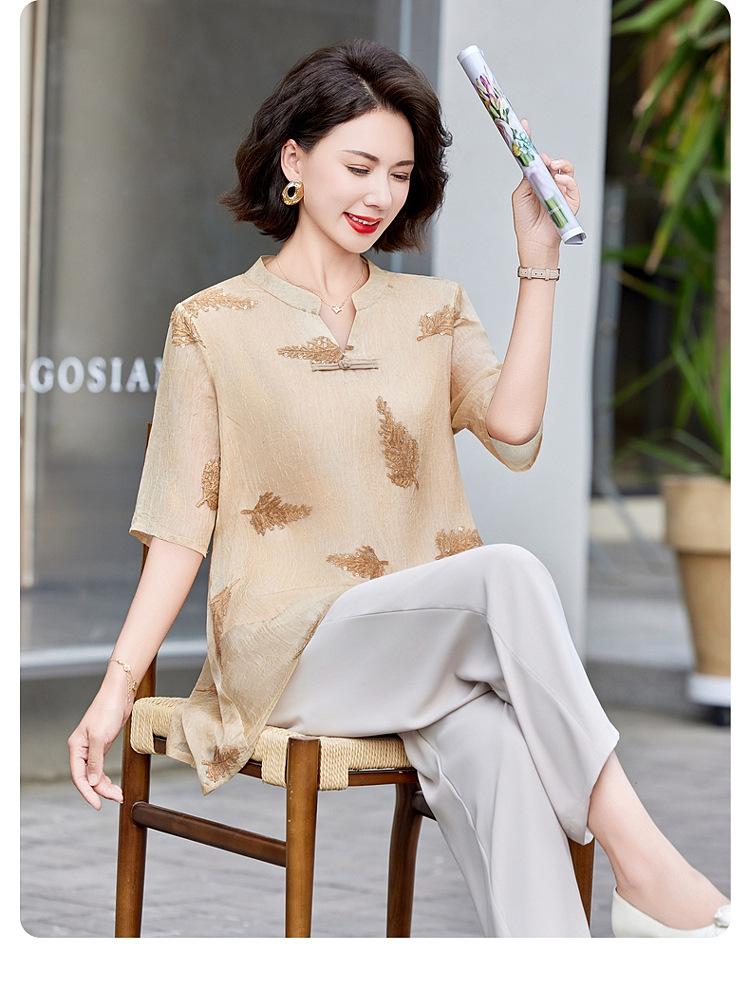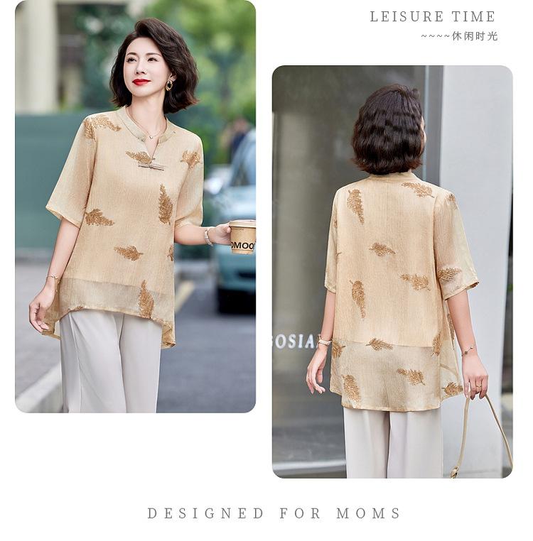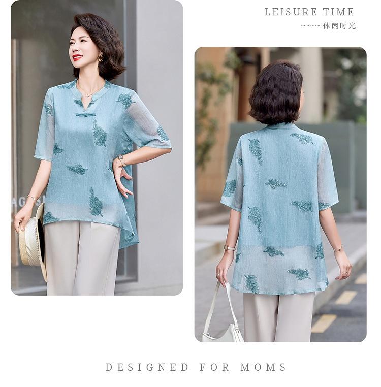 Ropa de Mamá 2025 Nuevos Tops de Verano, Camisetas Elegantes, Camisas de Gasa Sueltas tipo Jersey para Mujeres de Mediana Edad y Mayores