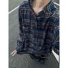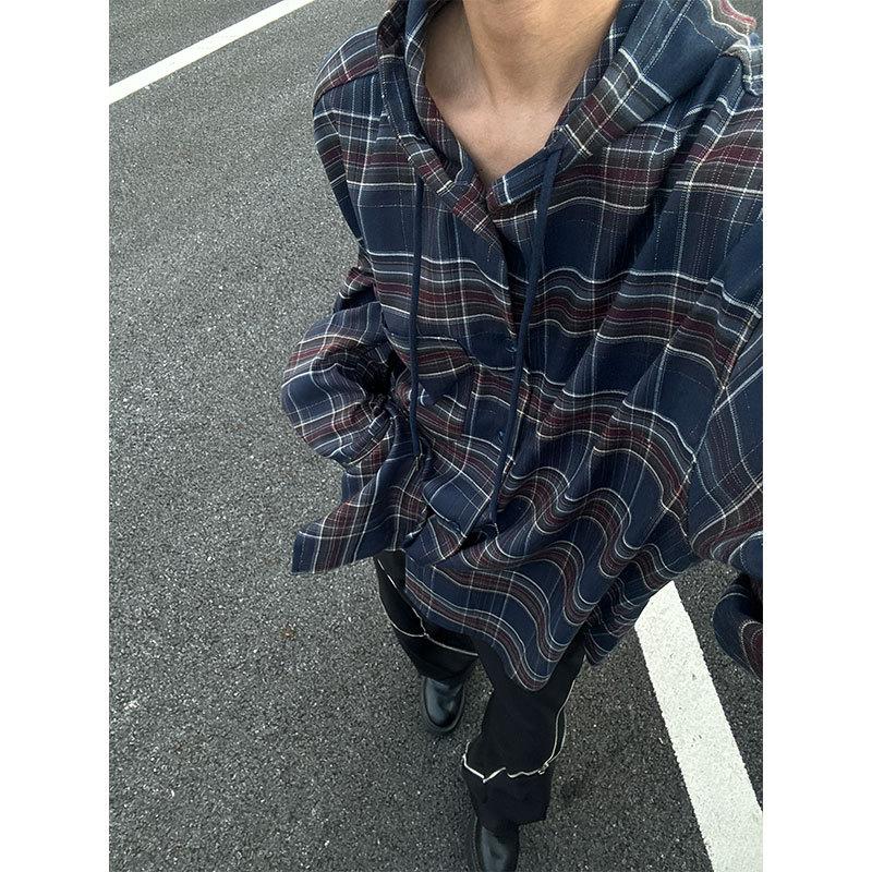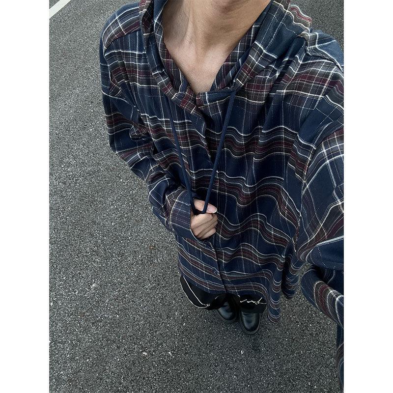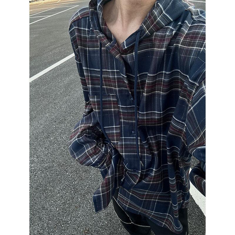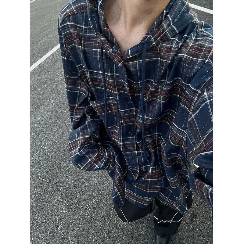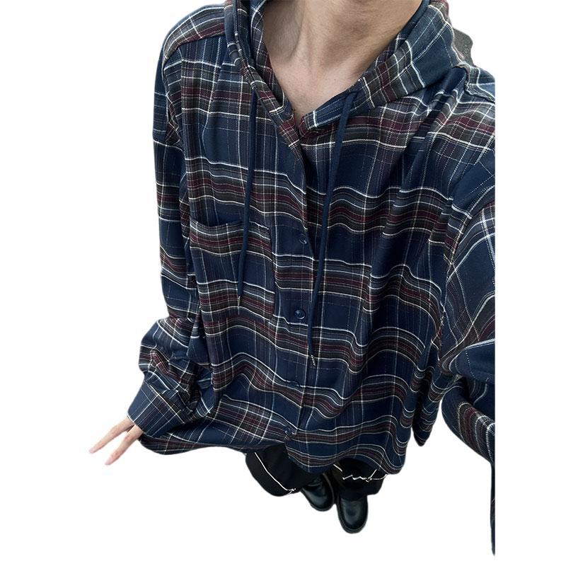 Top Holgado Casual de Manga Larga con Protección Solar para Hombre y Mujer Otoño Nuevo Americano Retro Cuadros Calle Camisa con Capucha Exterior