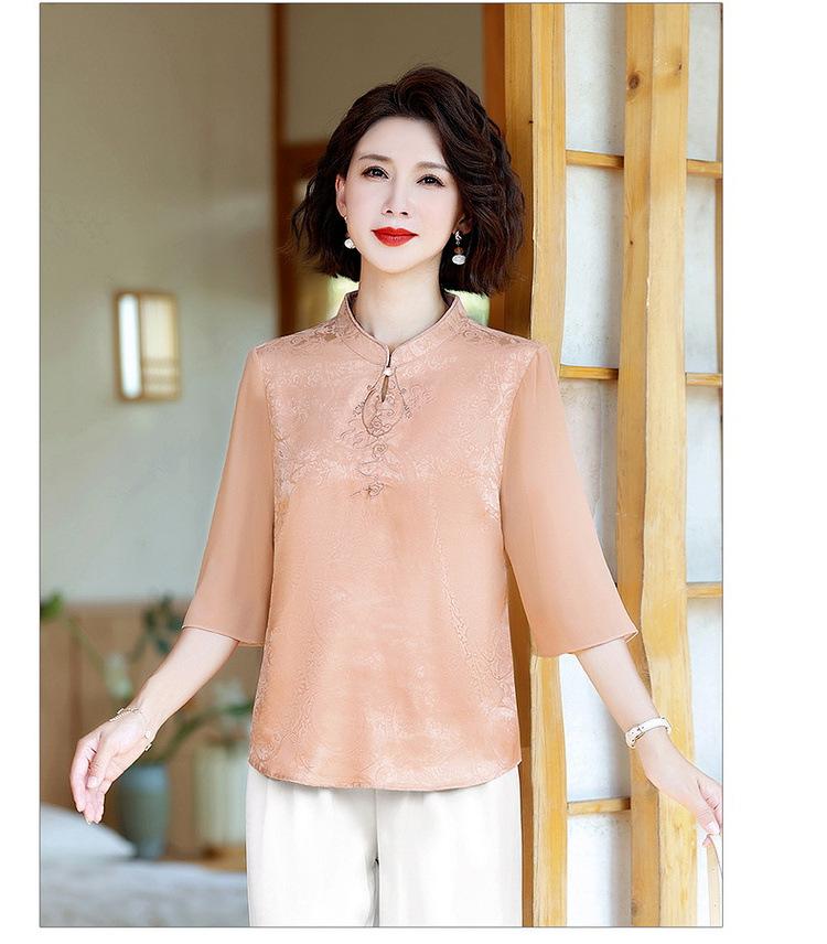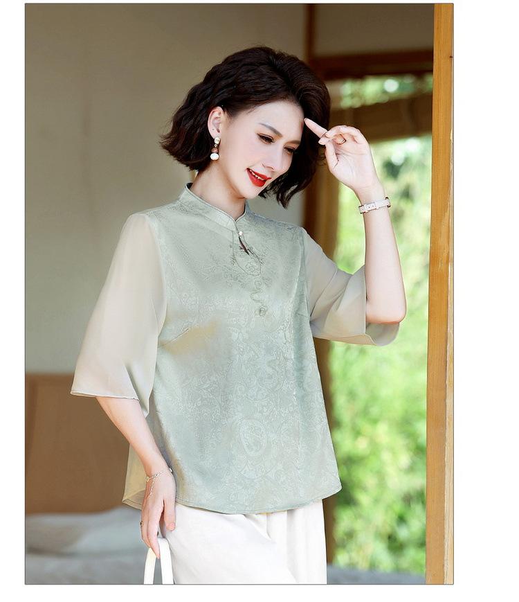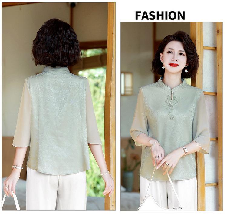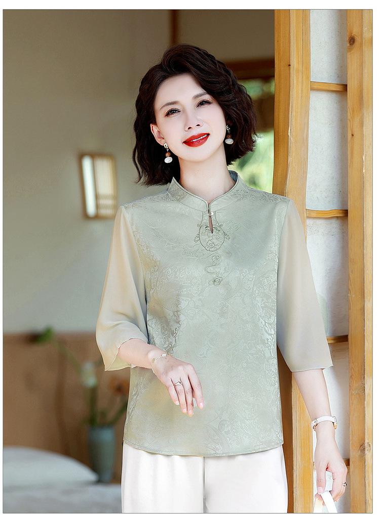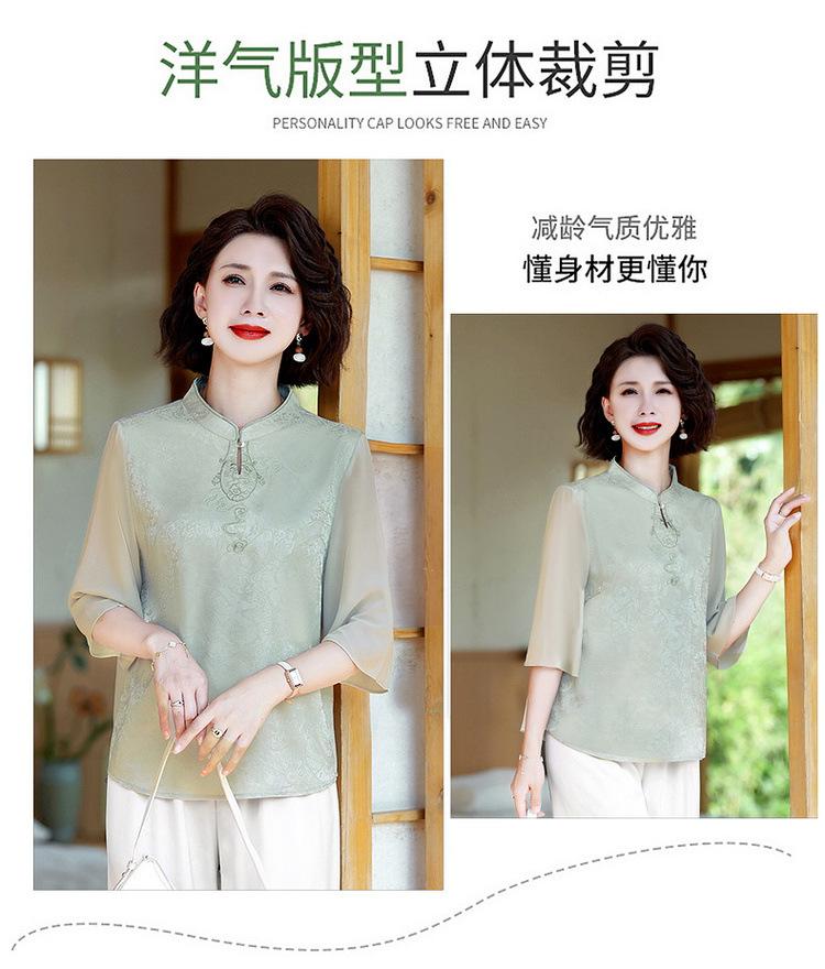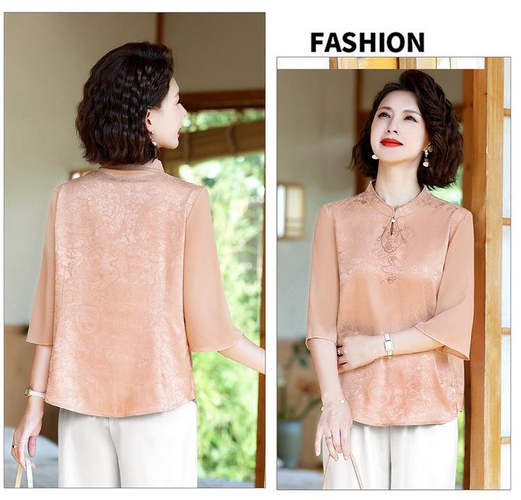 Elegante y Versátil Camisa de Verano Nueva con Cuello Mao para Mamás, Blusa Moderna con Manga Media Empalmada, Camiseta Adelgazante