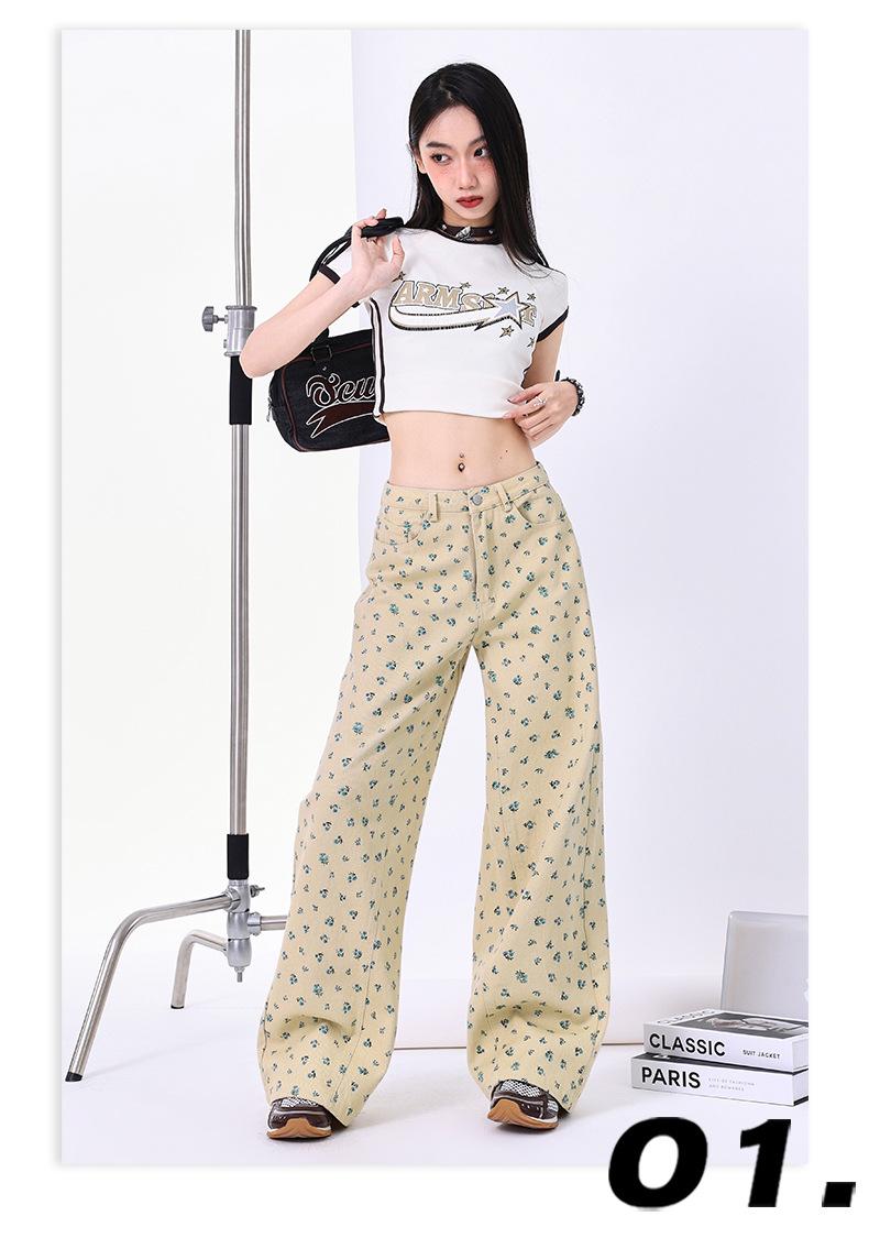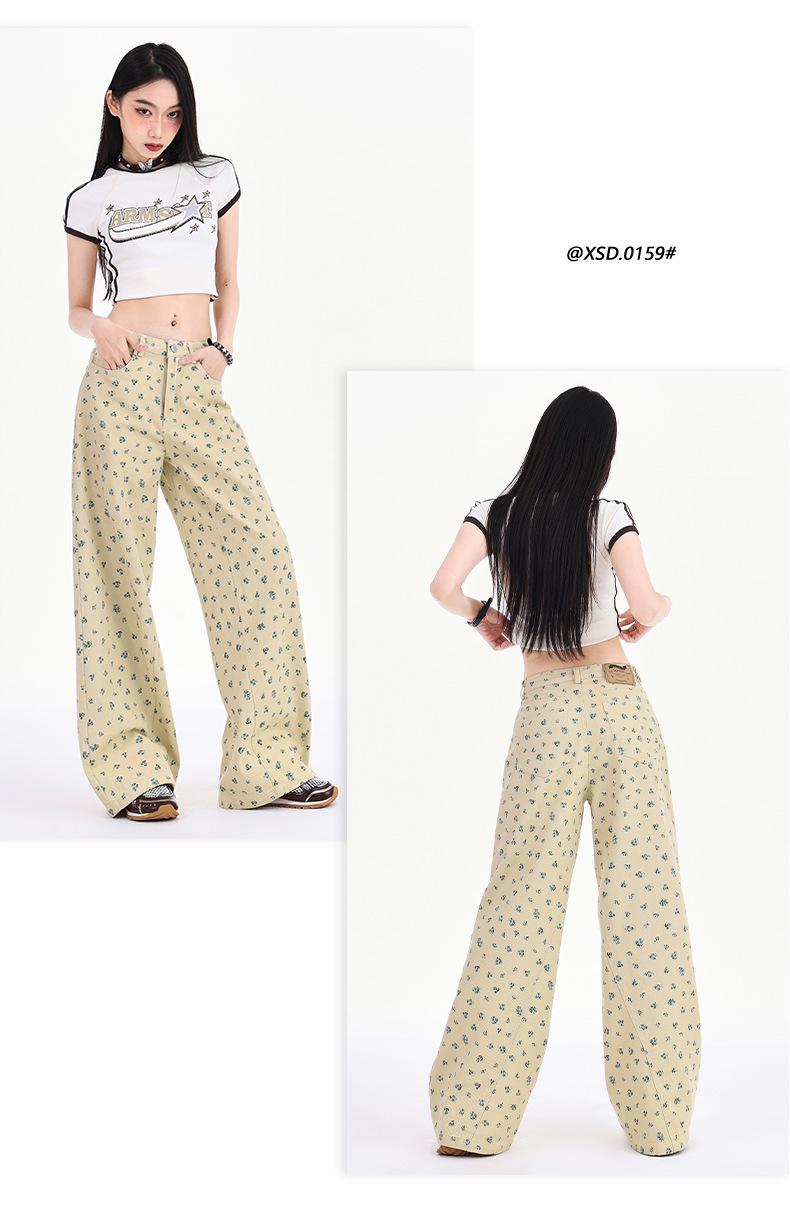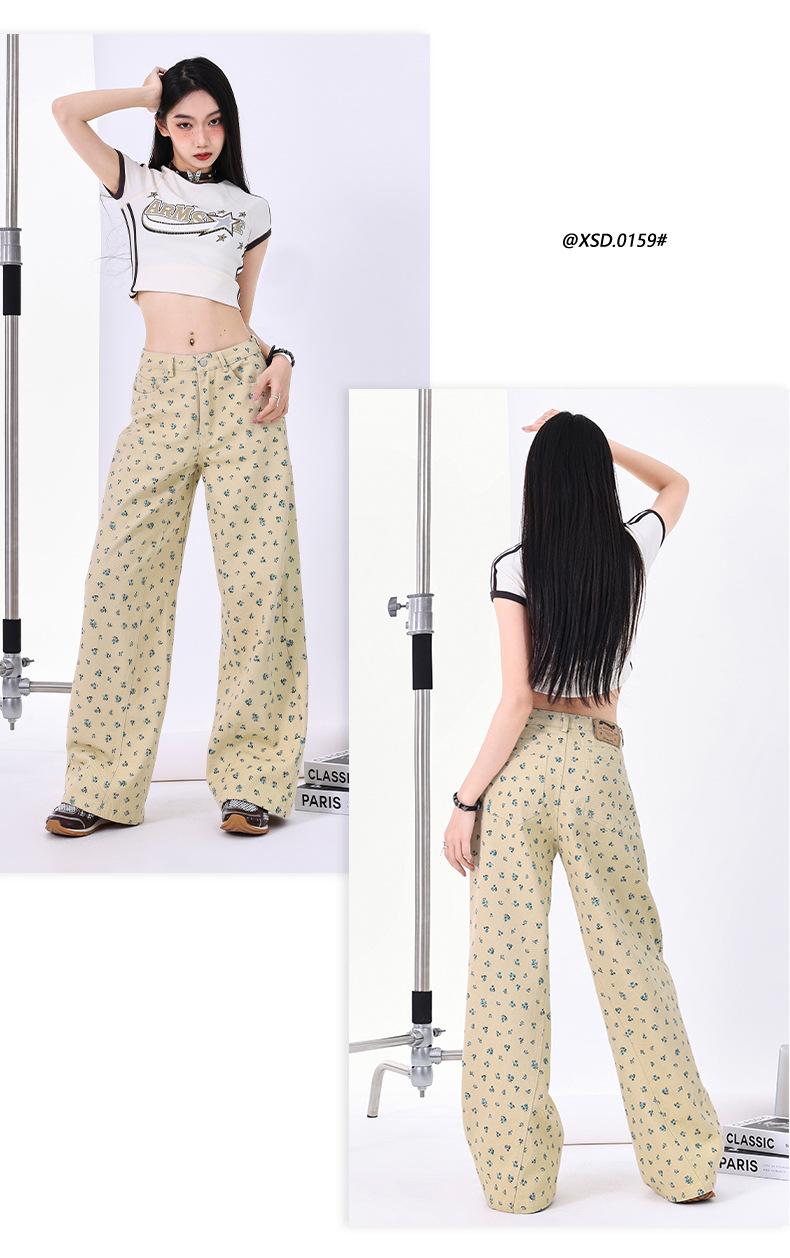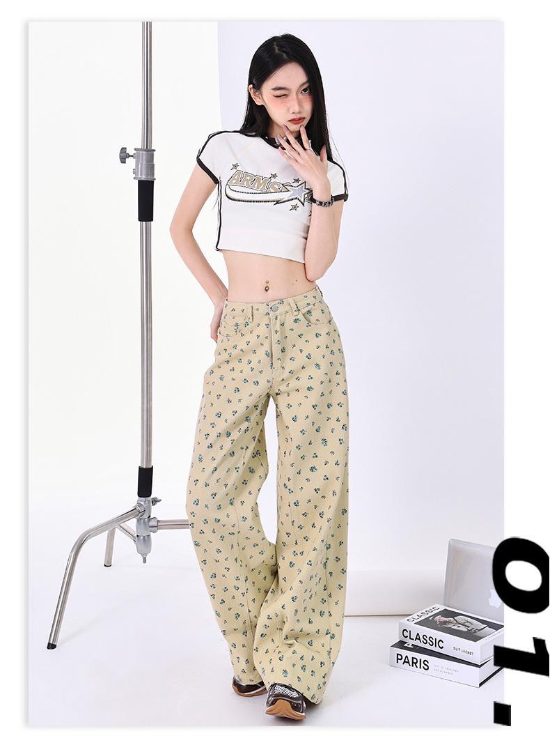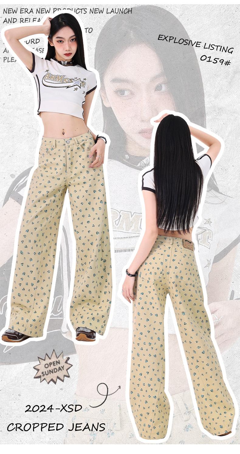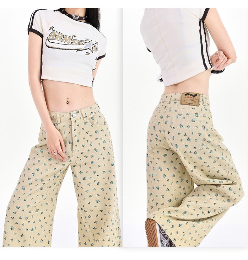 ¡25º cumpleaños! | jeans rectos florales frescos pequeños estilo retro Hong Kong para mujer, pantalones slim sueltos de pierna ancha