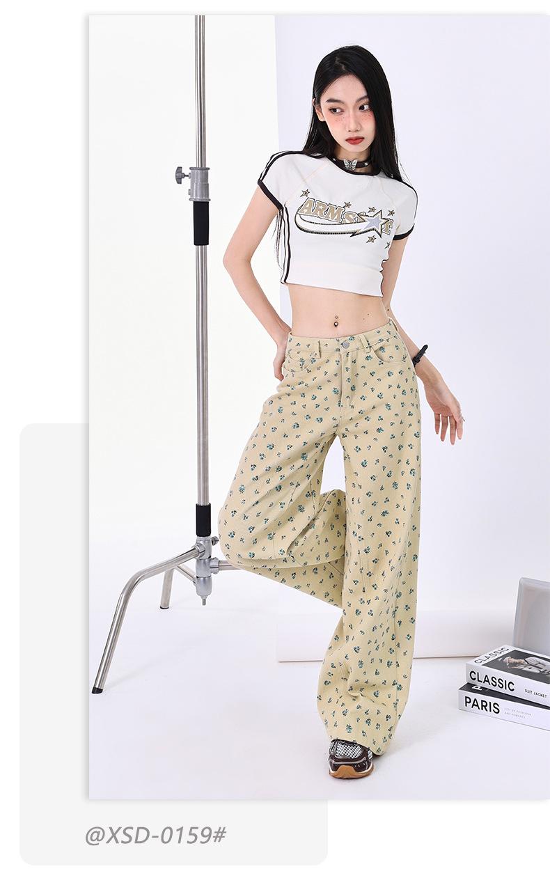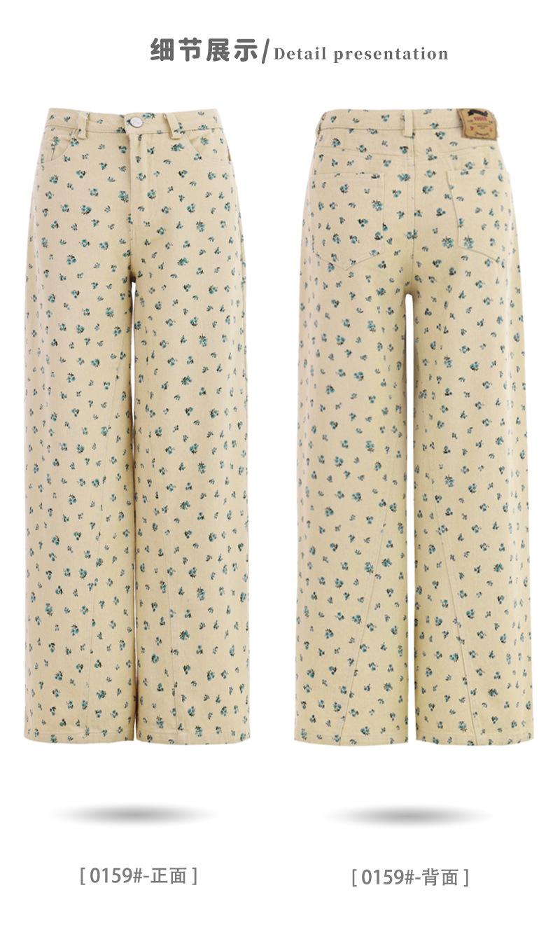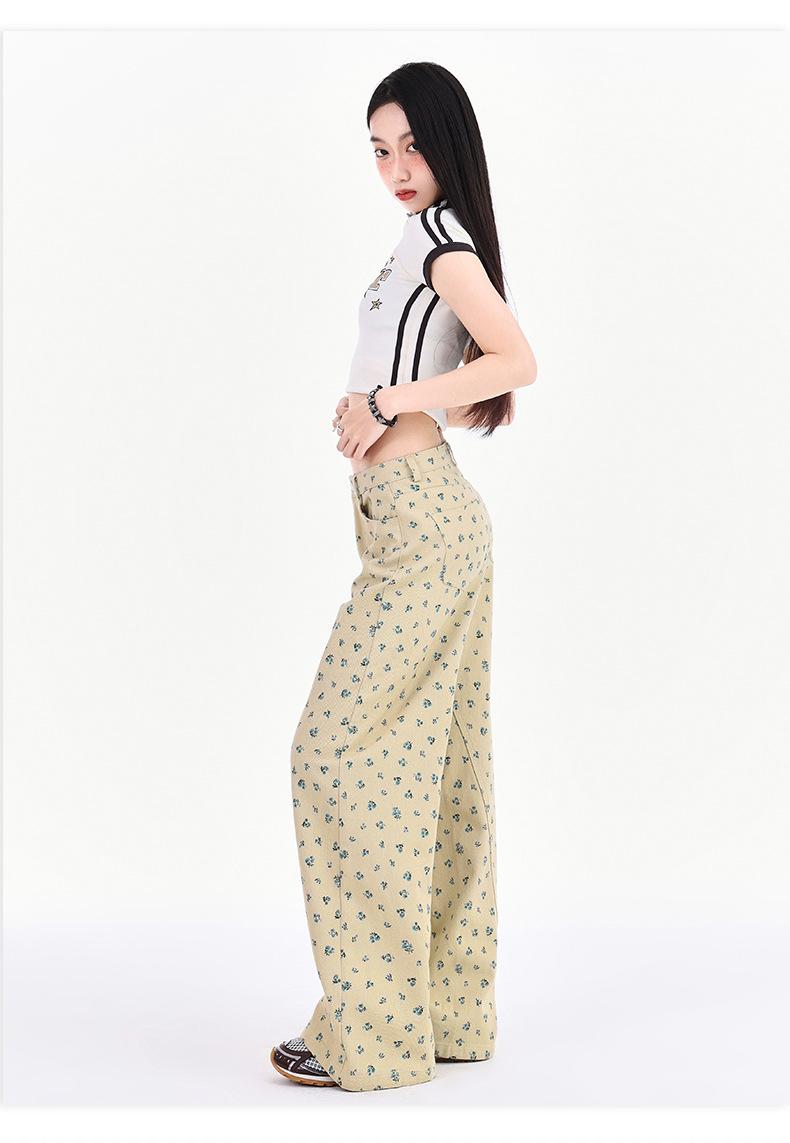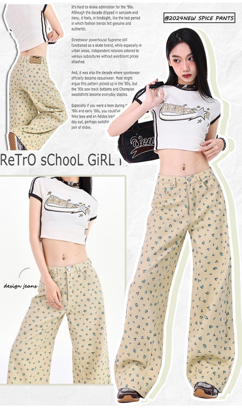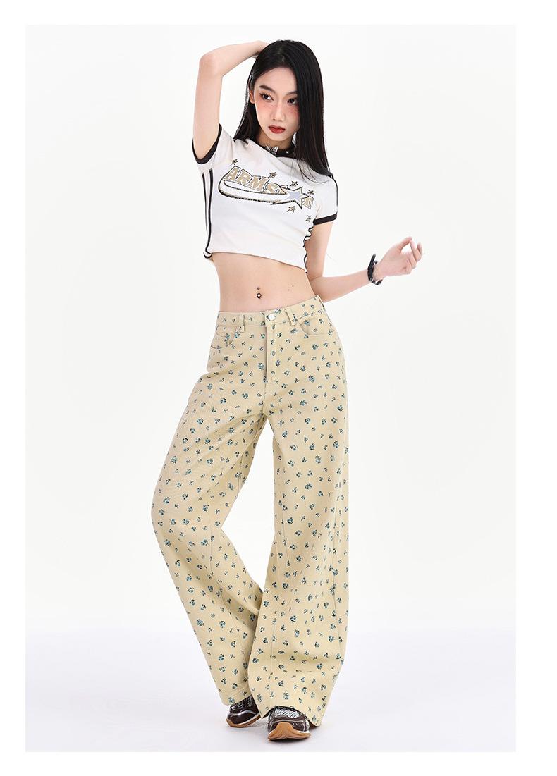 ¡25º cumpleaños! | jeans rectos florales frescos pequeños estilo retro Hong Kong para mujer, pantalones slim sueltos de pierna ancha