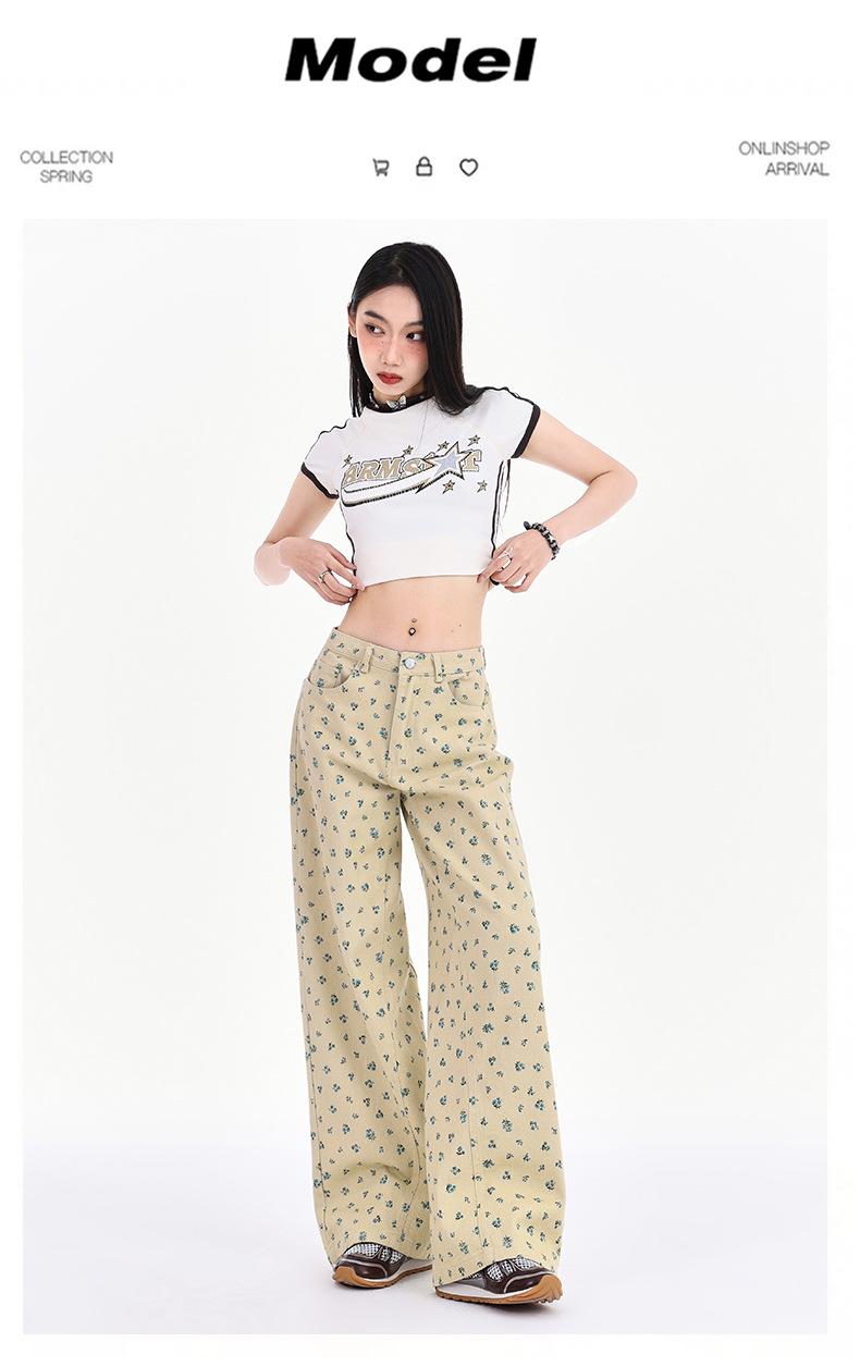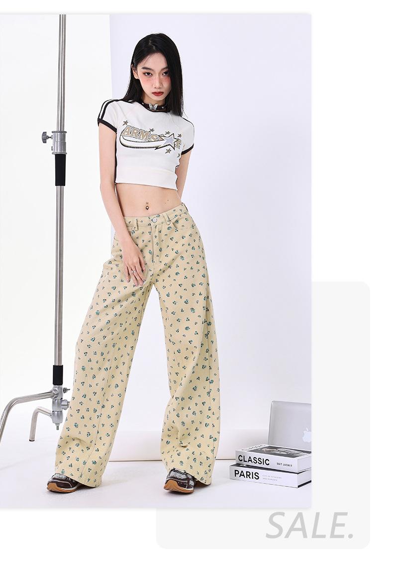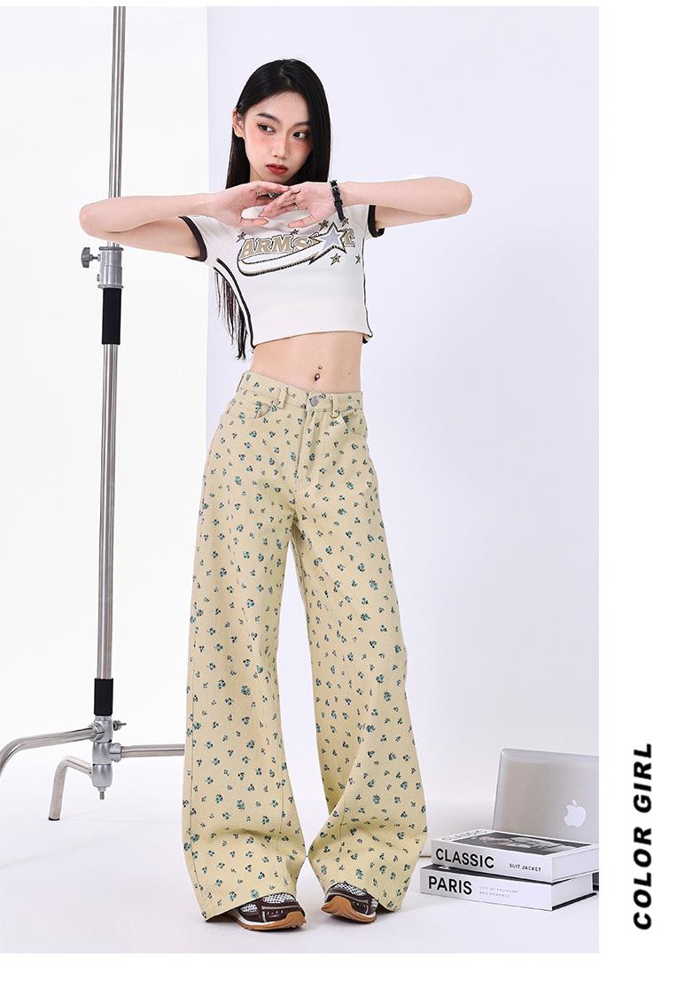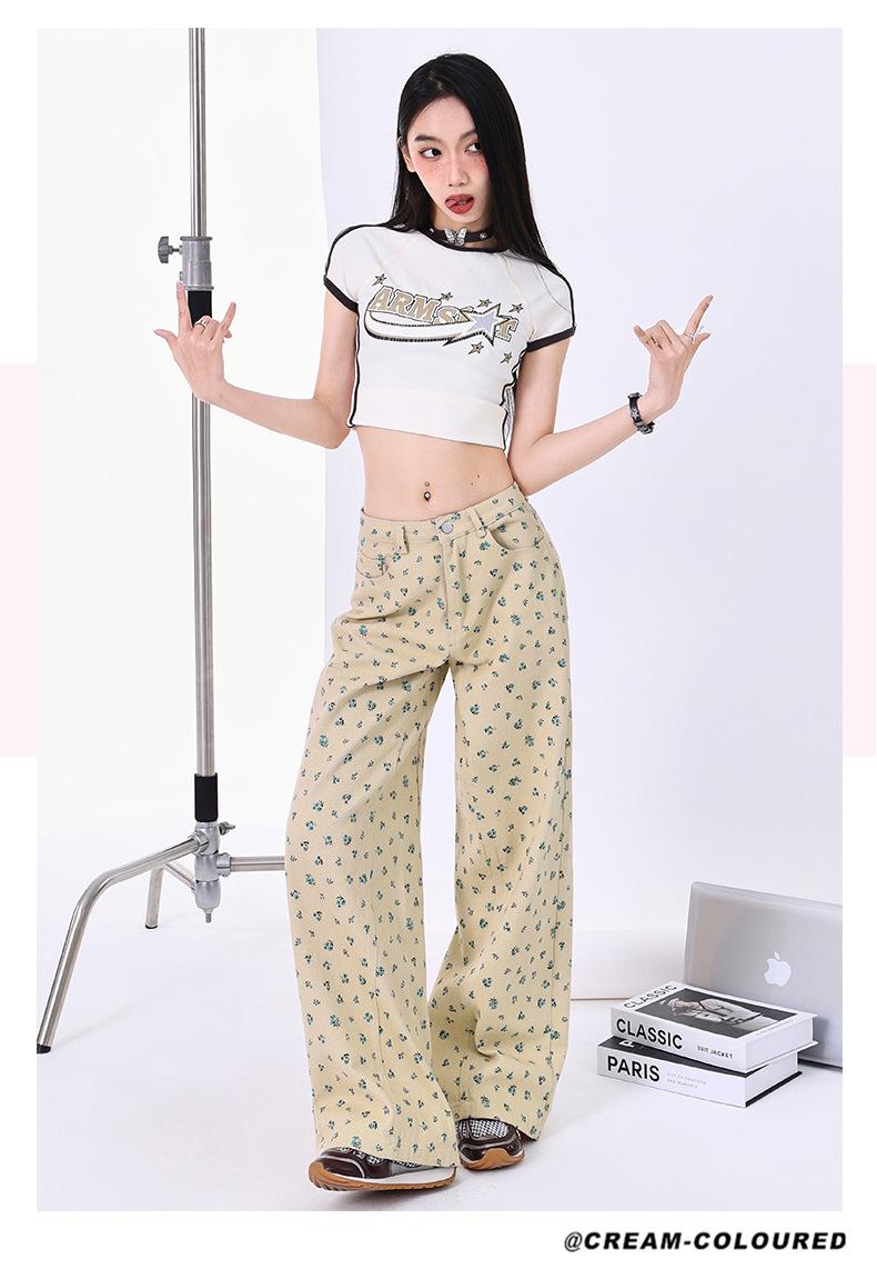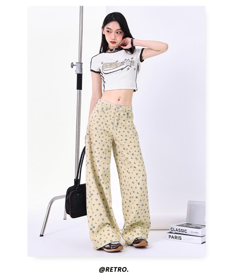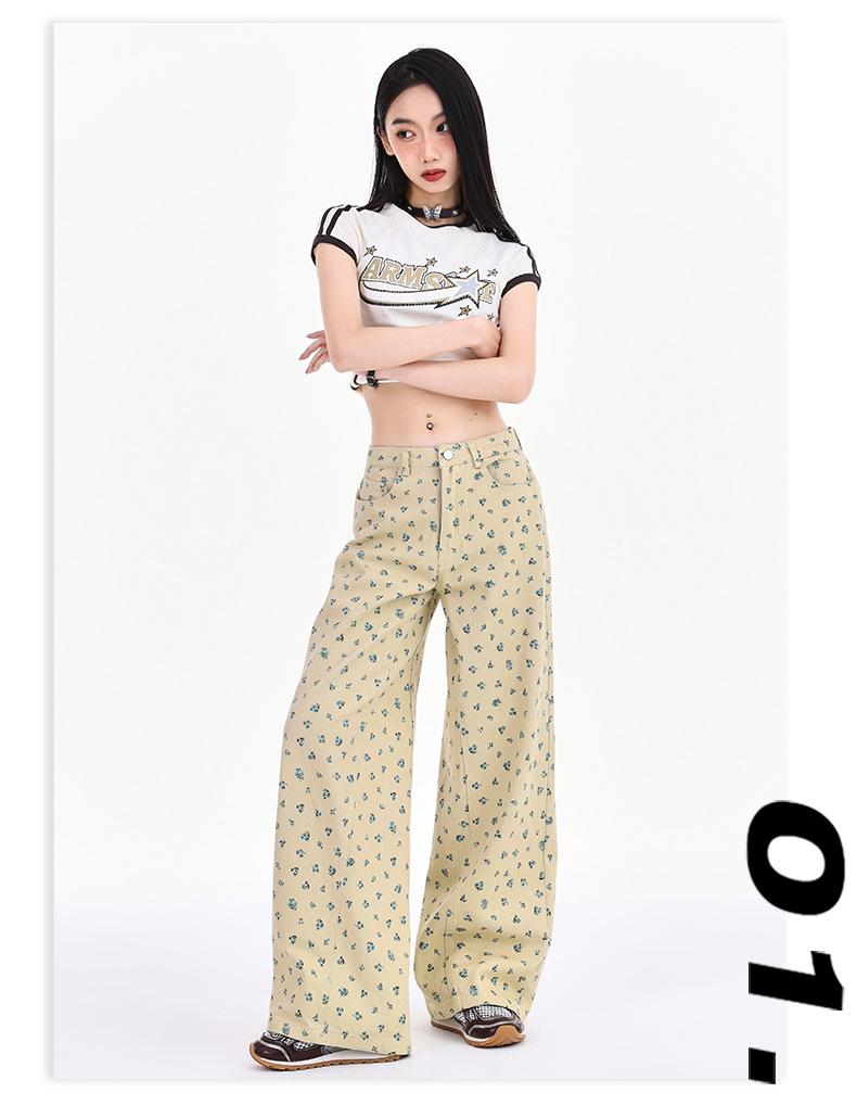 ¡25º cumpleaños! | jeans rectos florales frescos pequeños estilo retro Hong Kong para mujer, pantalones slim sueltos de pierna ancha