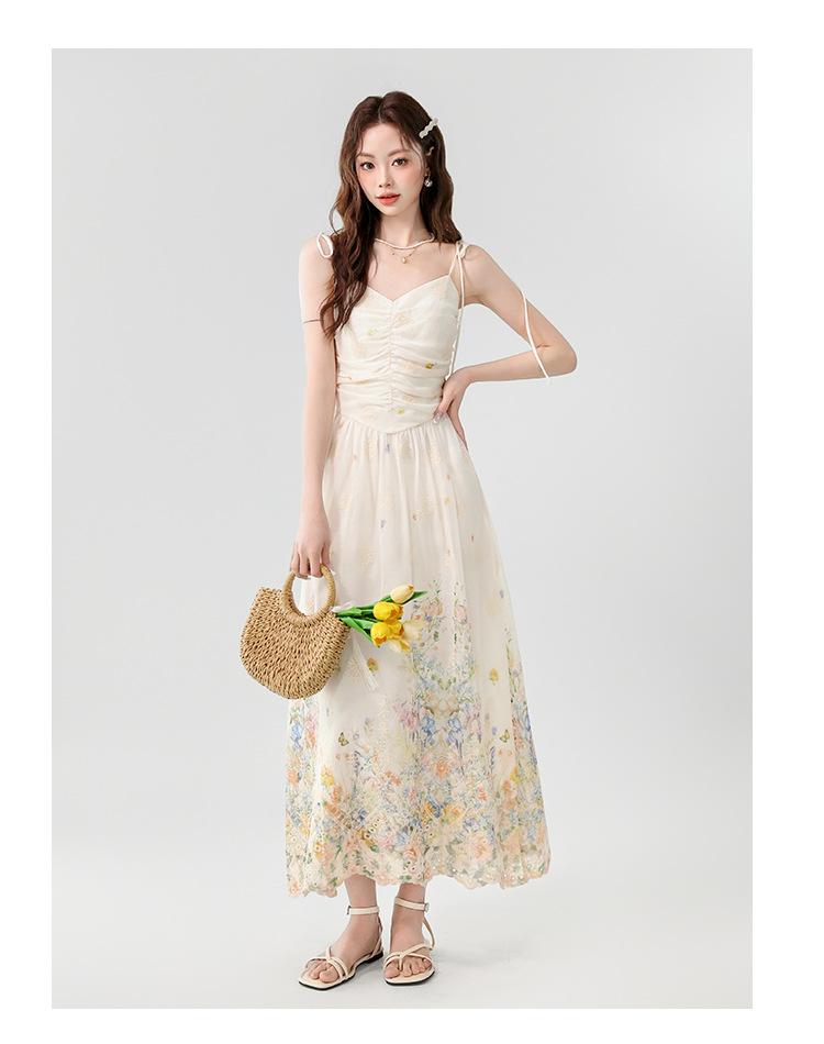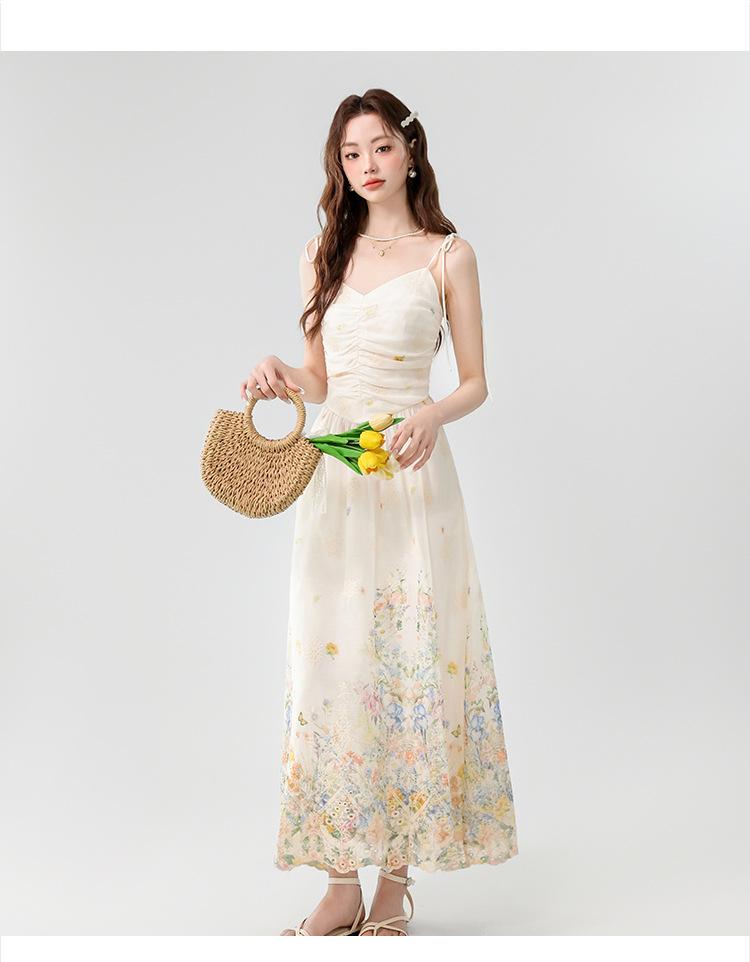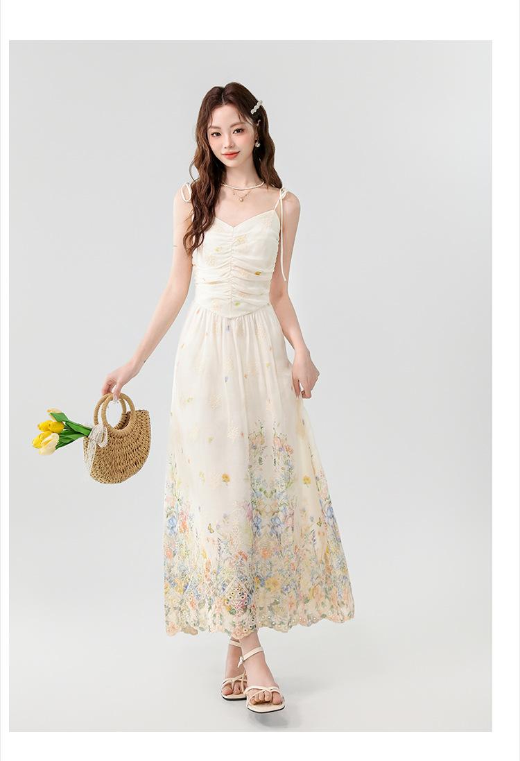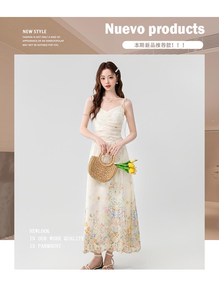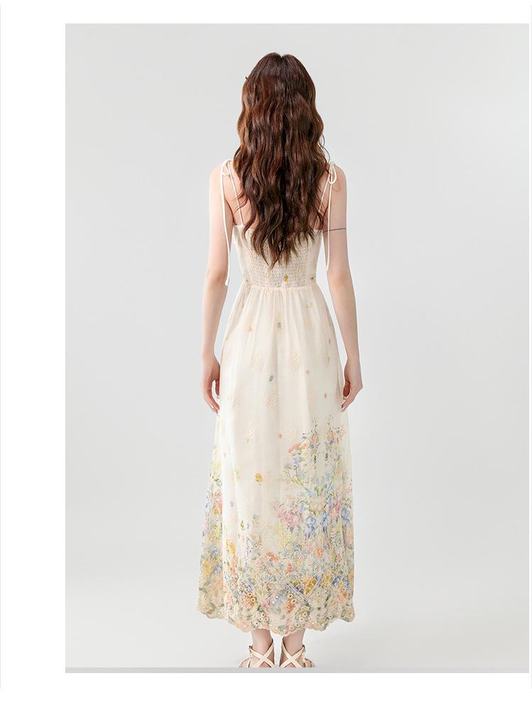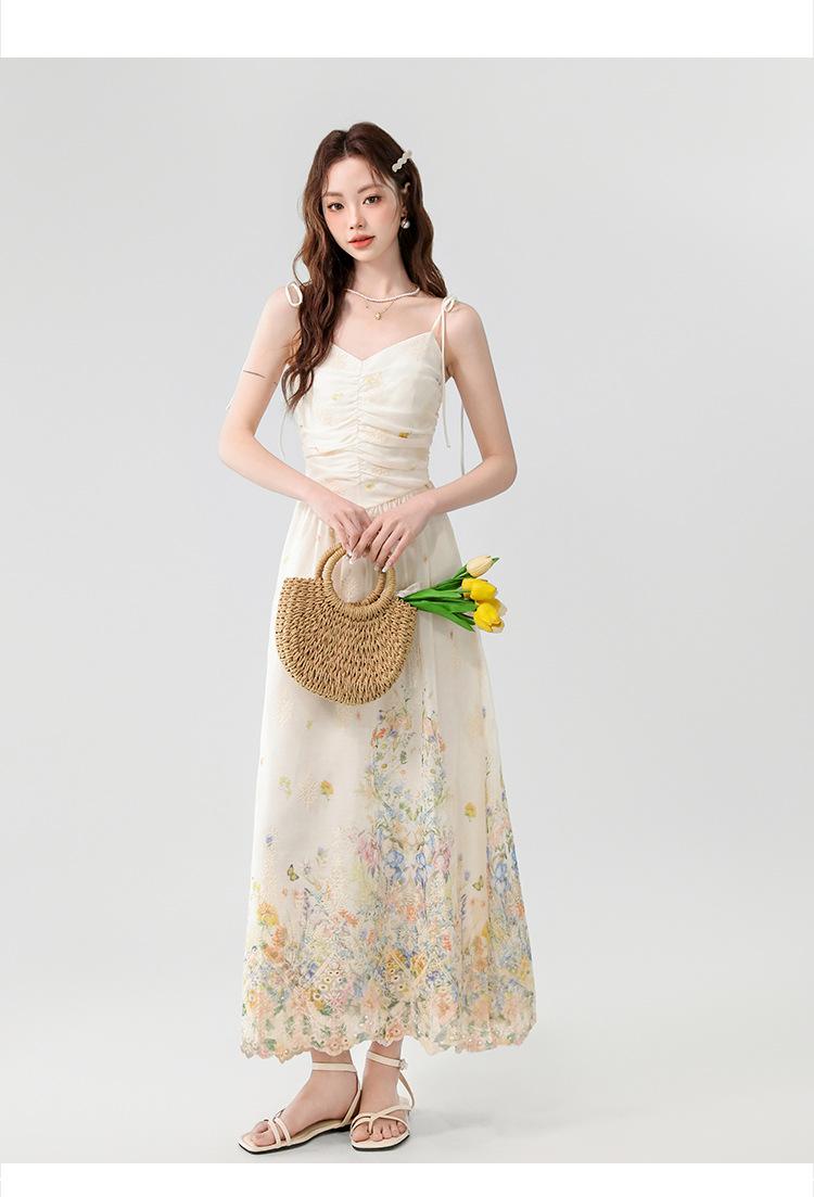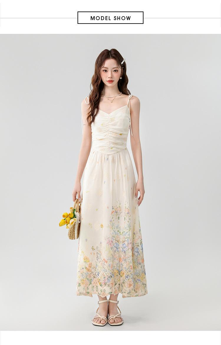 Verano 2025 Nuevo Estilo Francés Romántico Cuello en V Bordado Pesado Estampado Ajustado Largo Tirantes Vestido de Hada