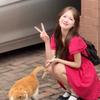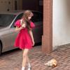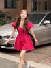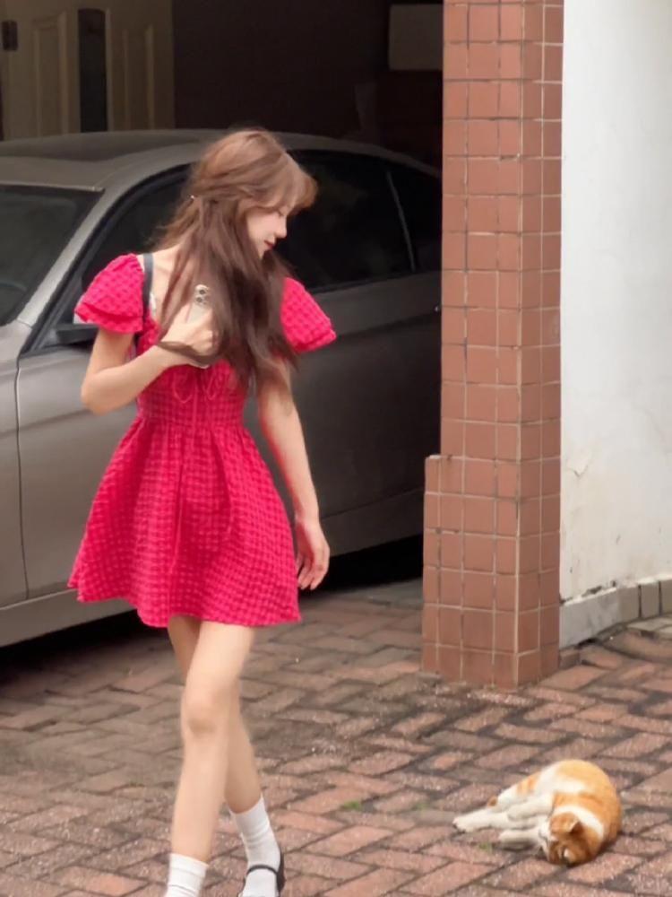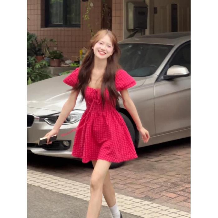 Vestido de verano 2025 con mangas cortas y cuello cuadrado a cuadros color rojo frambuesa estilo universitario para mujer