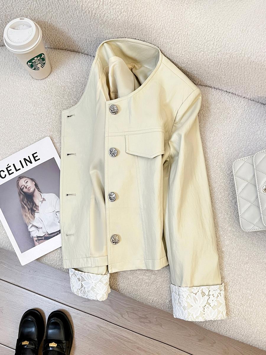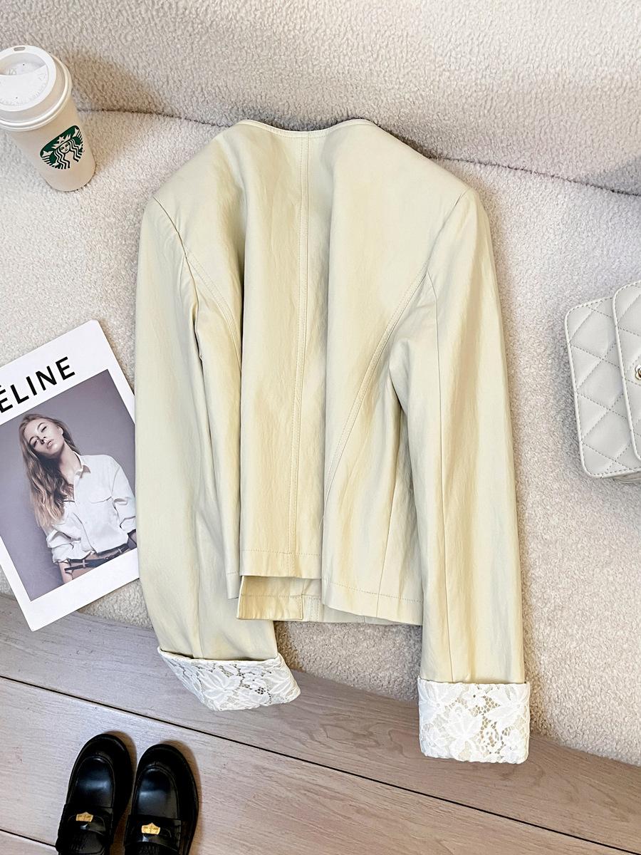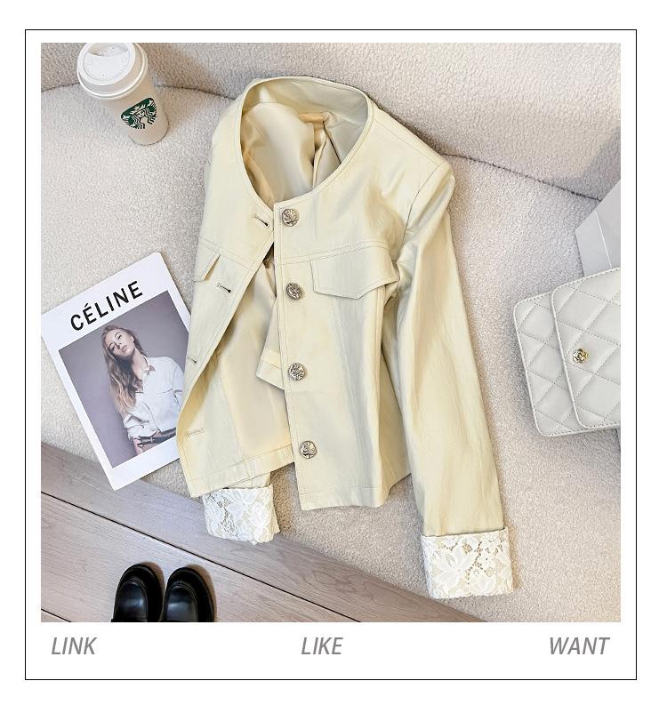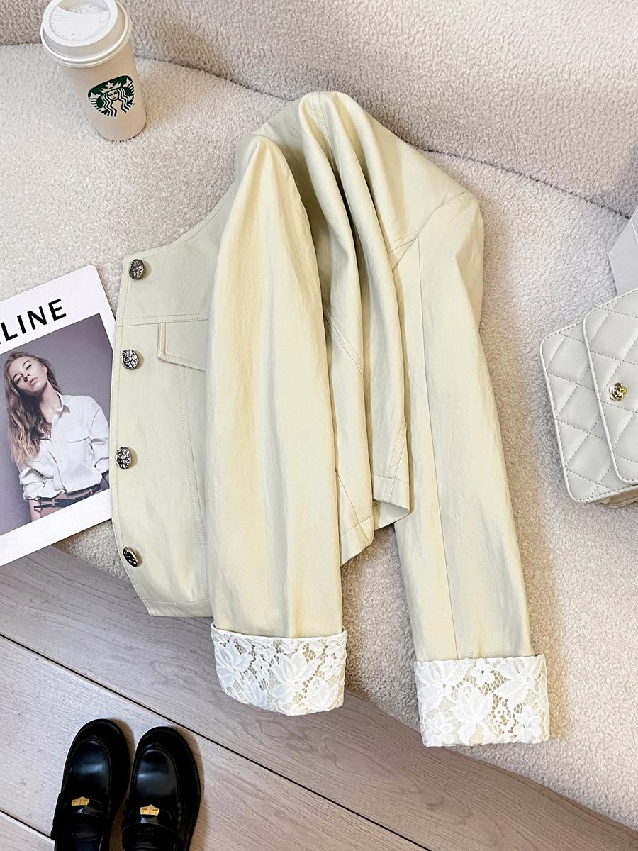 Chaqueta de Cuero Amarillo para Mujer Senior Goddess Fan 2025 Primavera Nuevo Diseño de Costuras de Encaje Elegante Chaqueta de PU