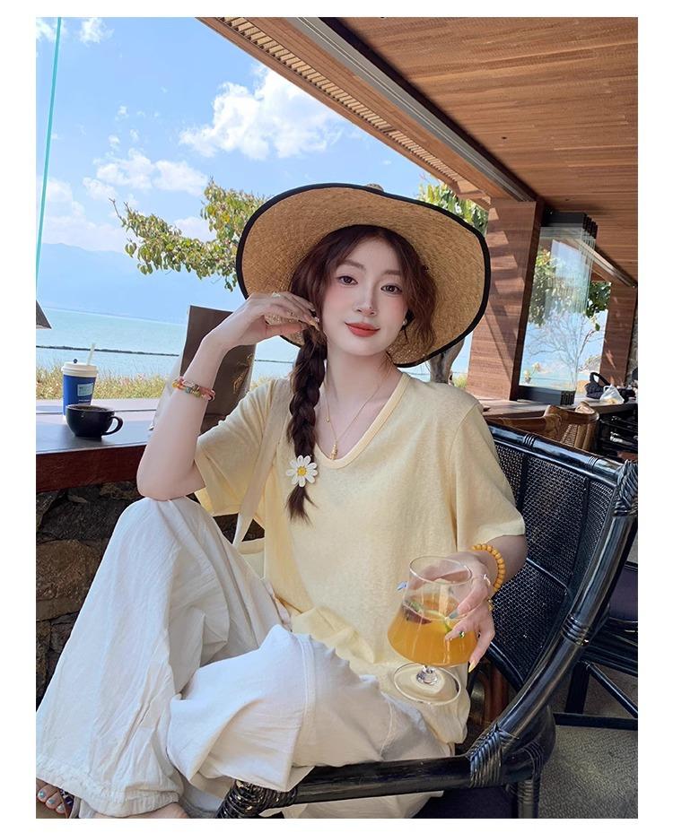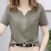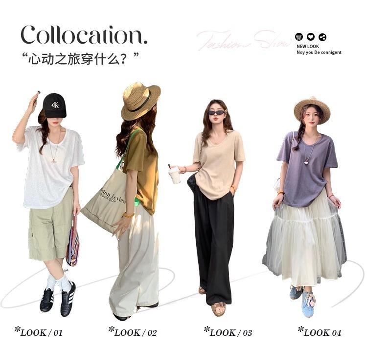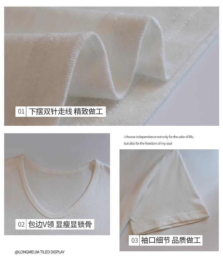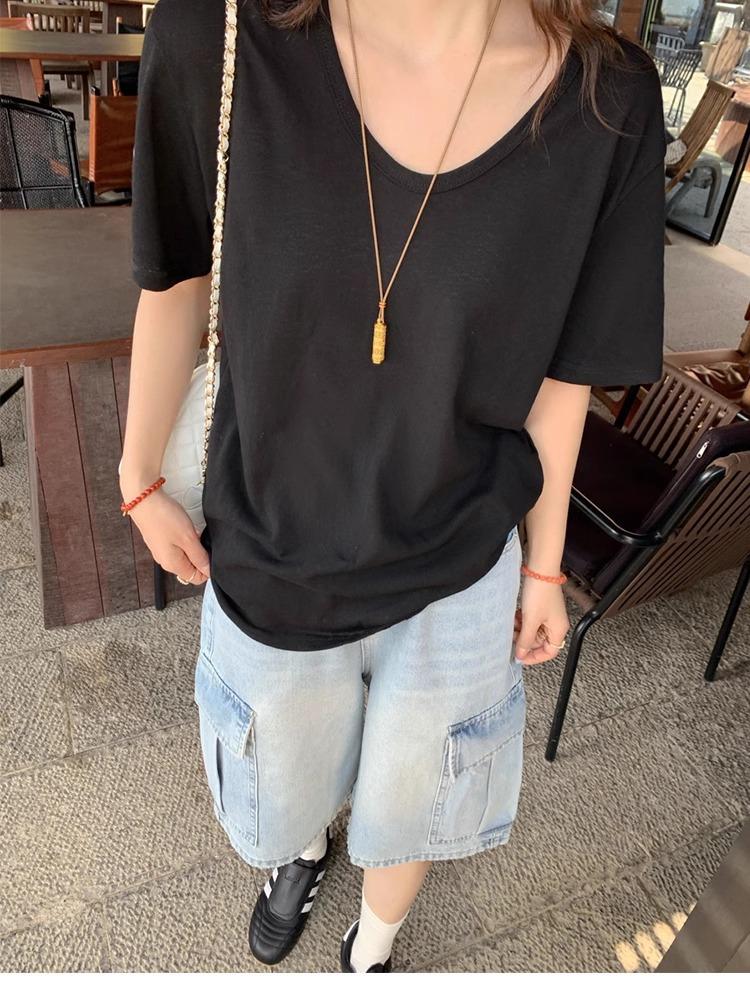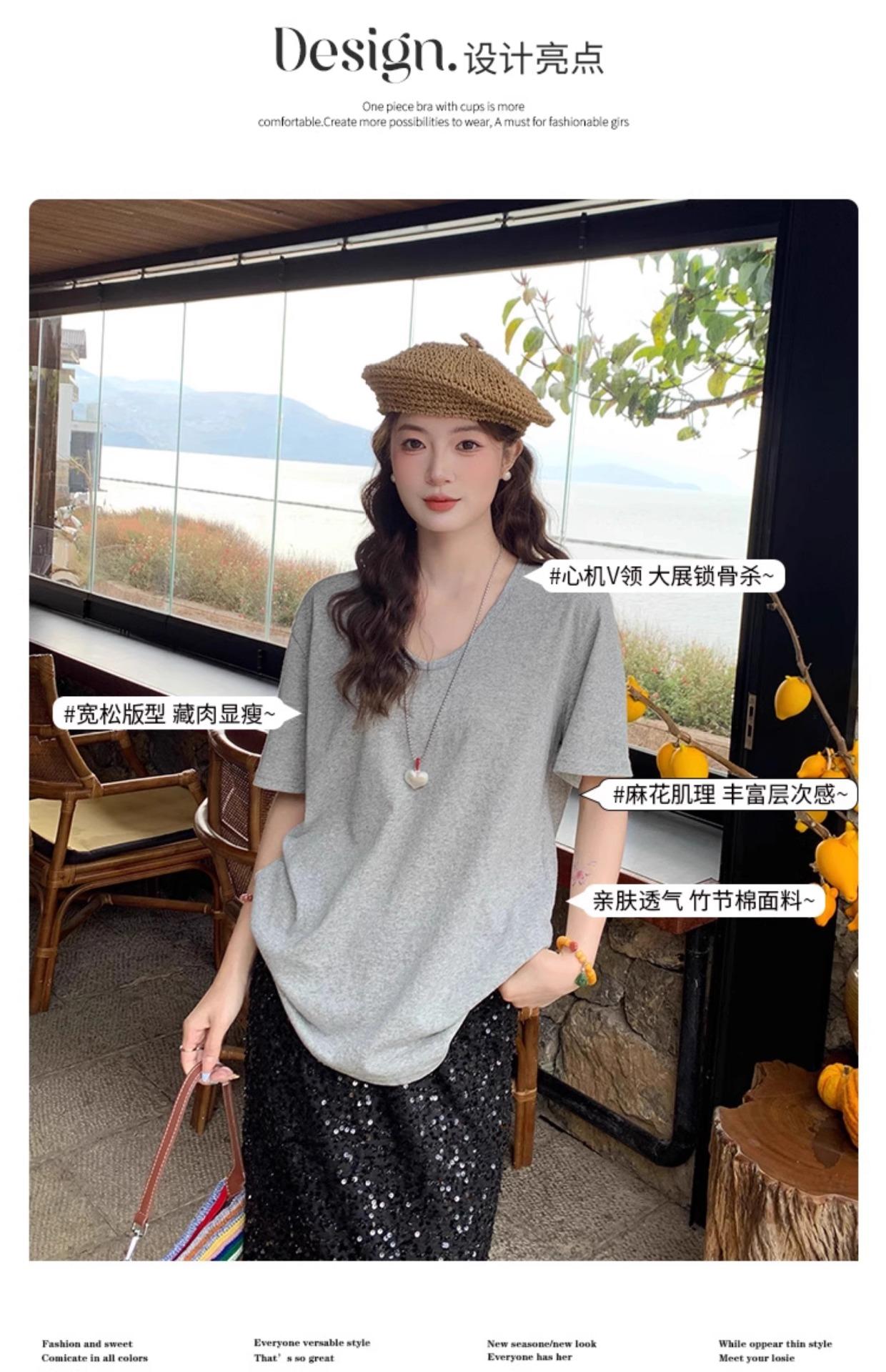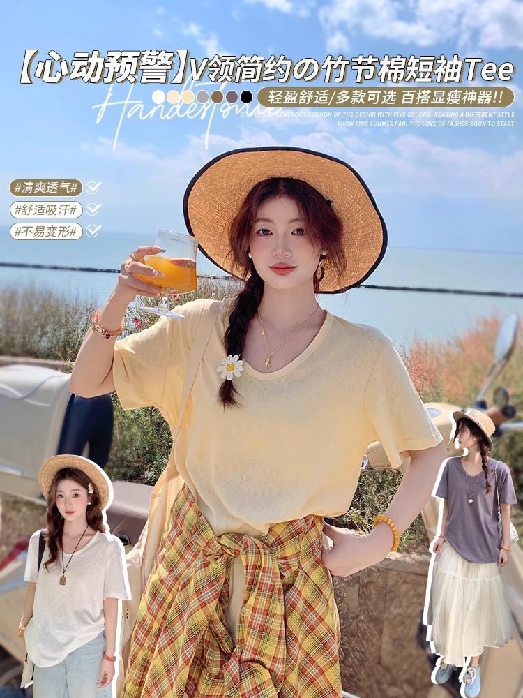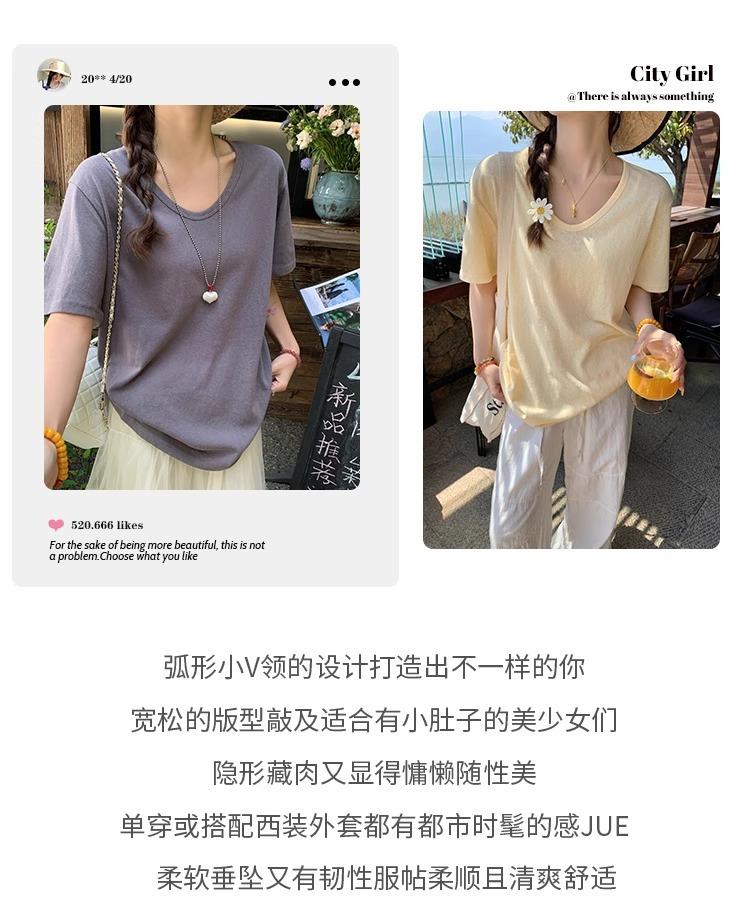 Playera de Punto con Cuello en V de Manga Corta para Mujer Verano 2025 Nuevo Manga Media Algodón Bambú Fino para Fondo Top Holgado para Uso Exterior