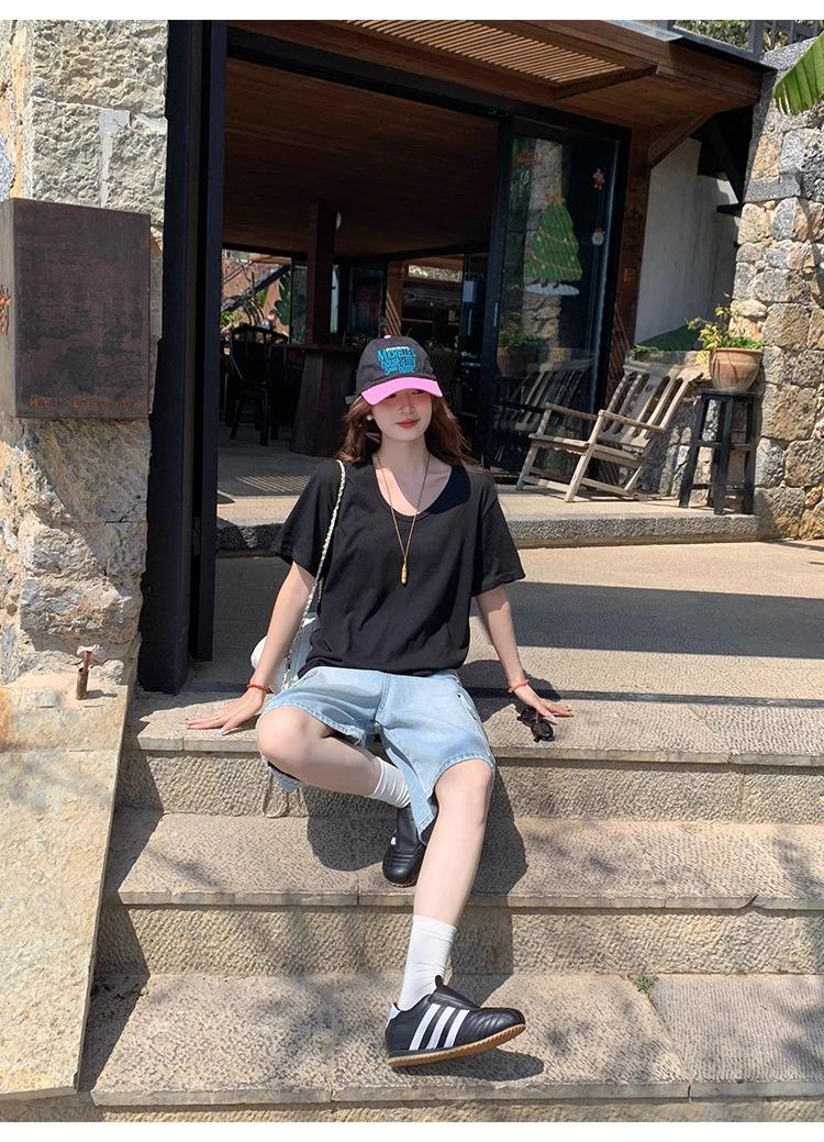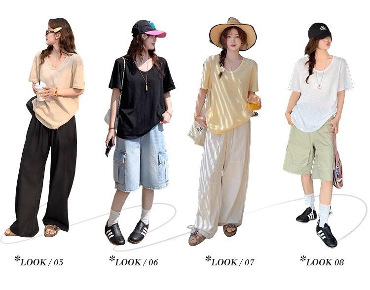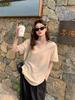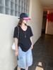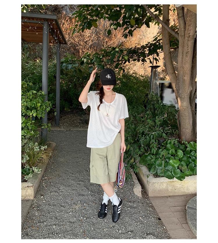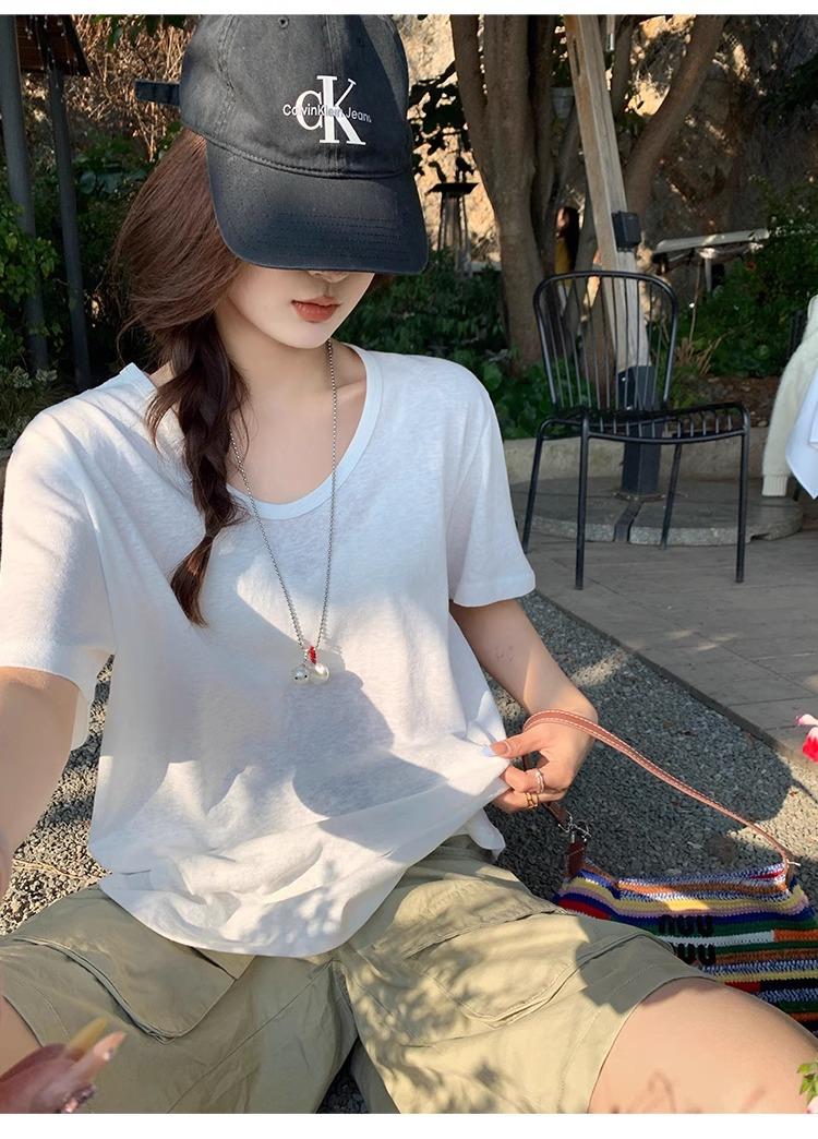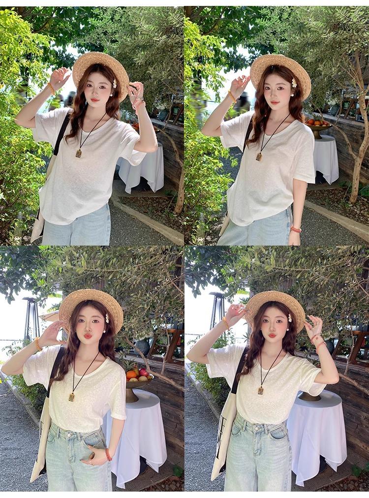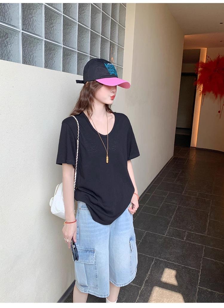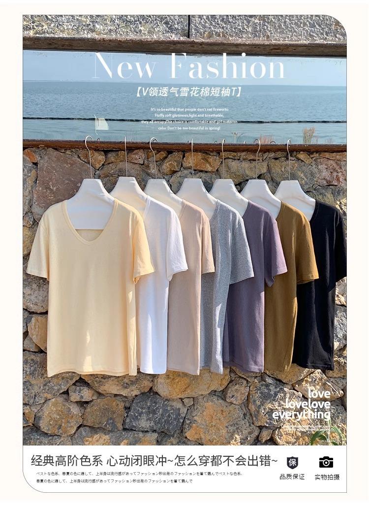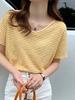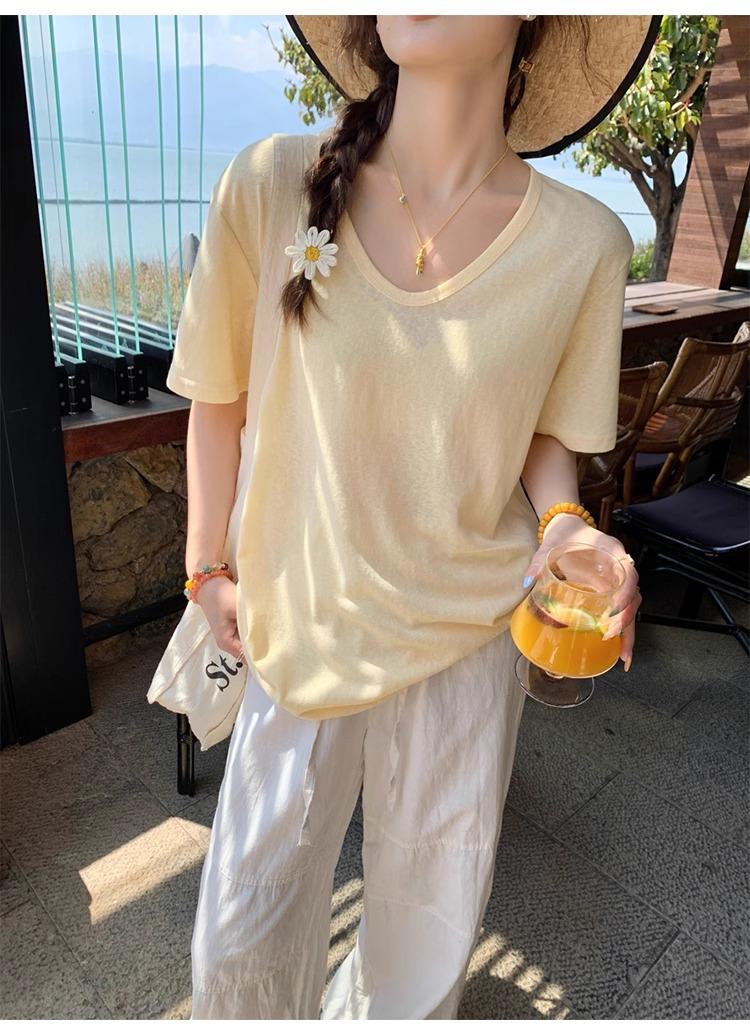 Playera de Punto con Cuello en V de Manga Corta para Mujer Verano 2025 Nuevo Manga Media Algodón Bambú Fino para Fondo Top Holgado para Uso Exterior