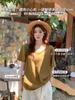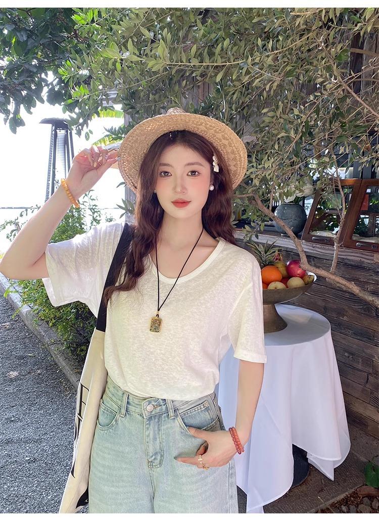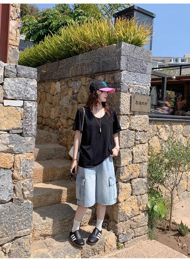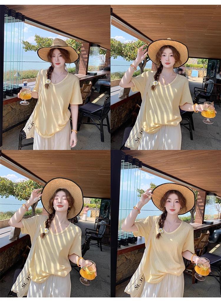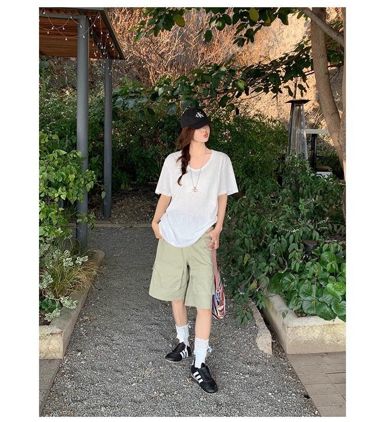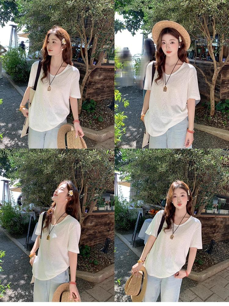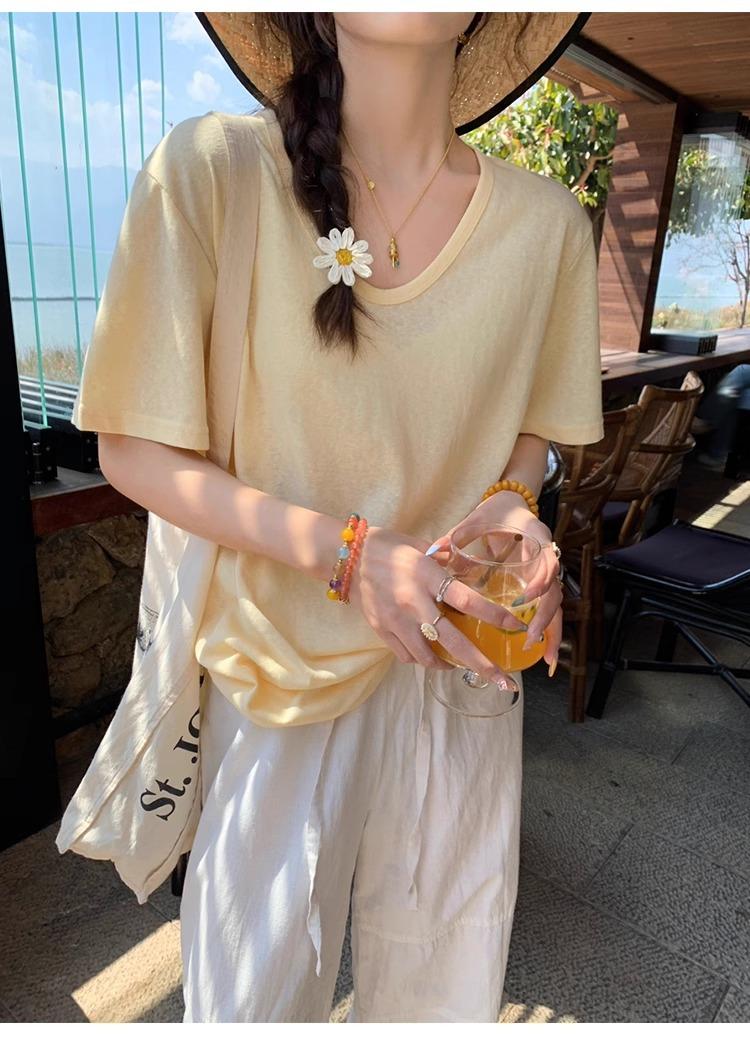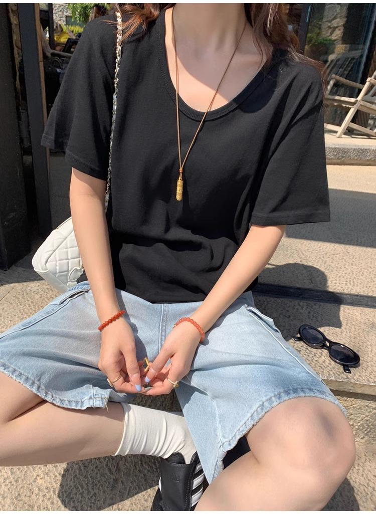 Playera de Punto con Cuello en V de Manga Corta para Mujer Verano 2025 Nuevo Manga Media Algodón Bambú Fino para Fondo Top Holgado para Uso Exterior