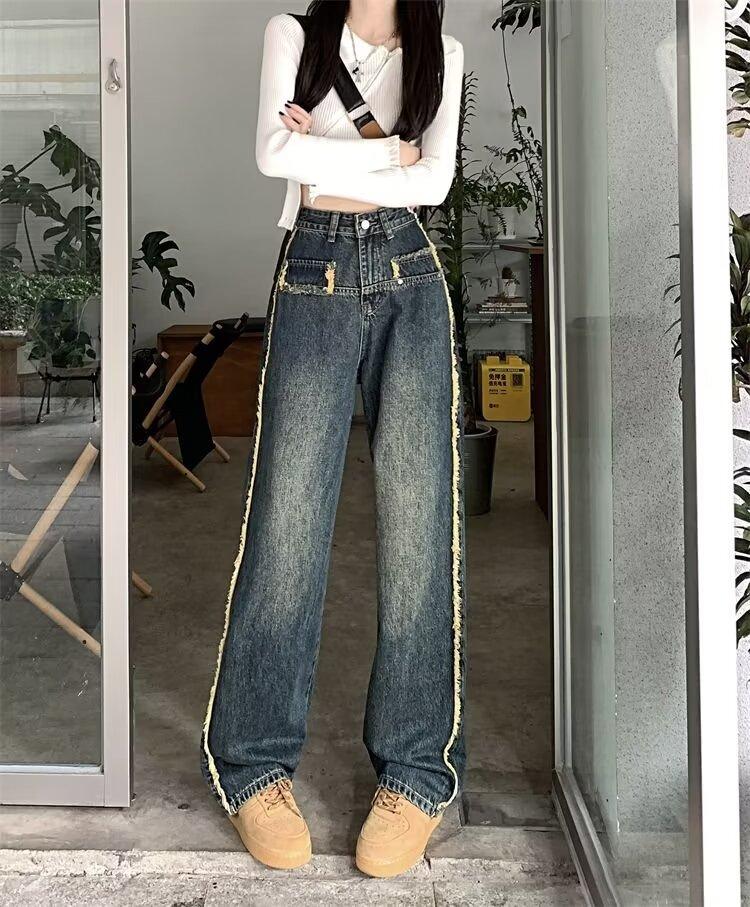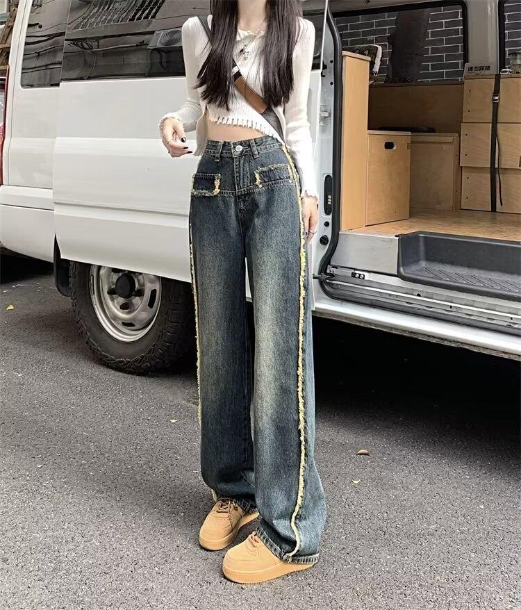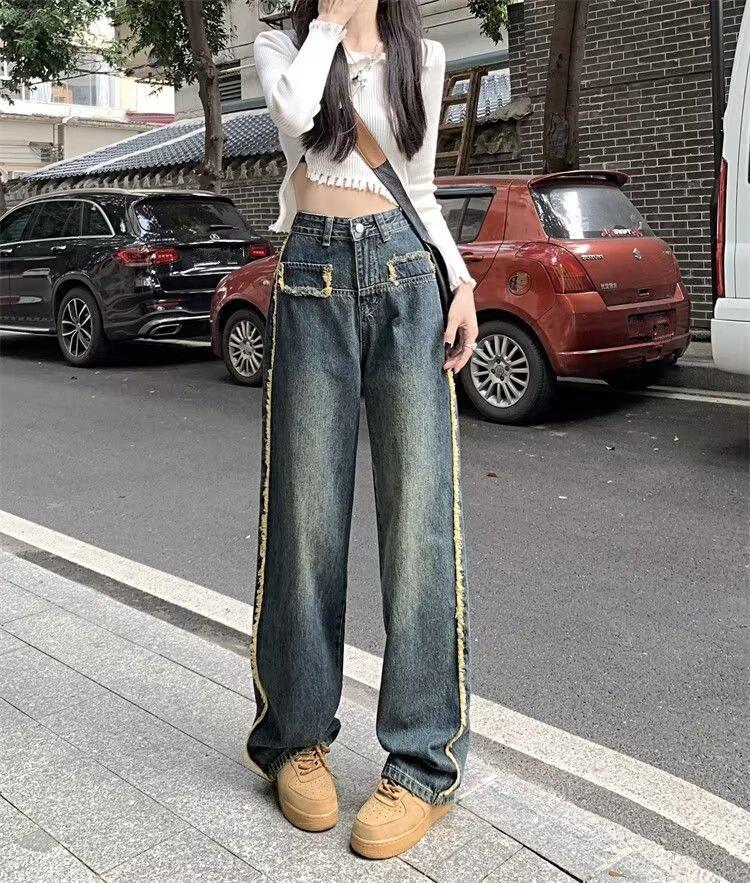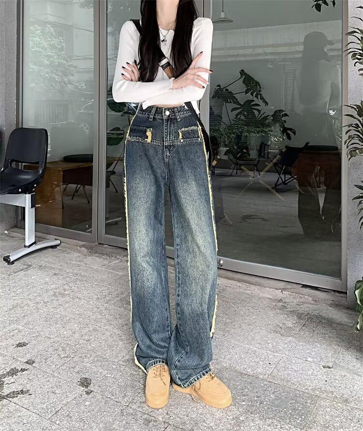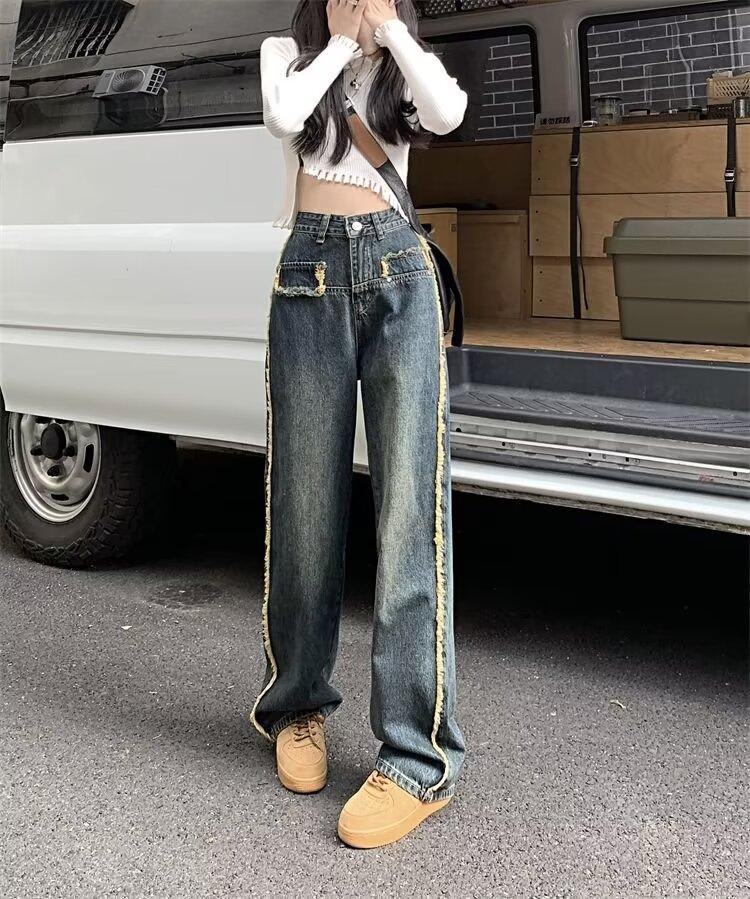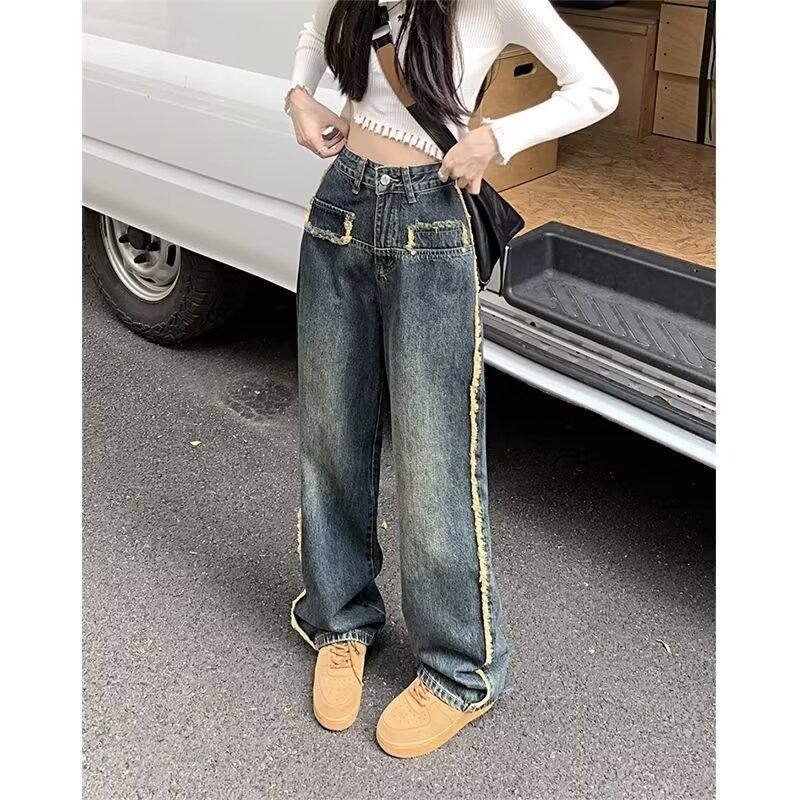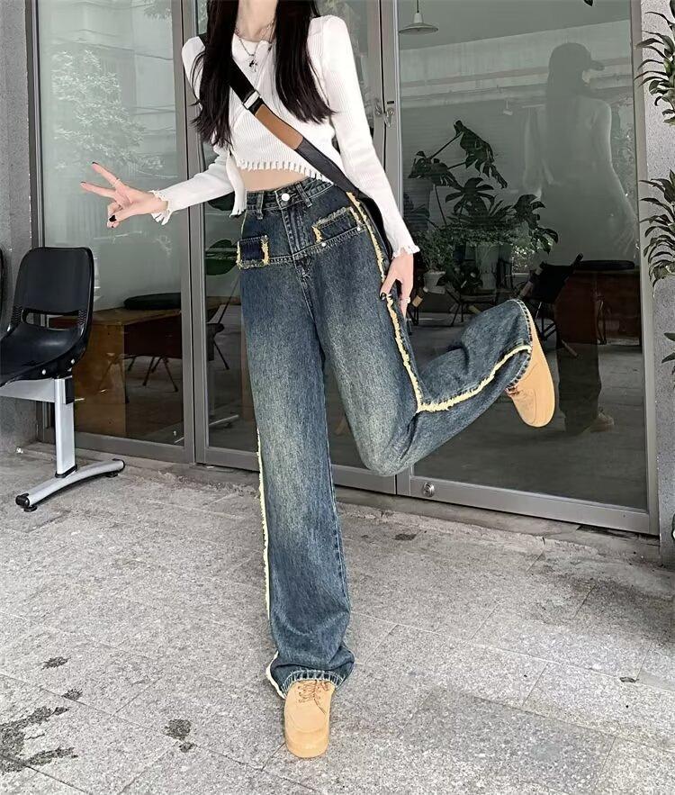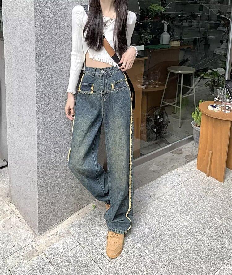 Talla grande Estilo Americano Retro Jeans de Pierna Recta para Mujer chica gordita Primavera Nuevo Ins Cintura Alta Pantalones de Pierna Ancha