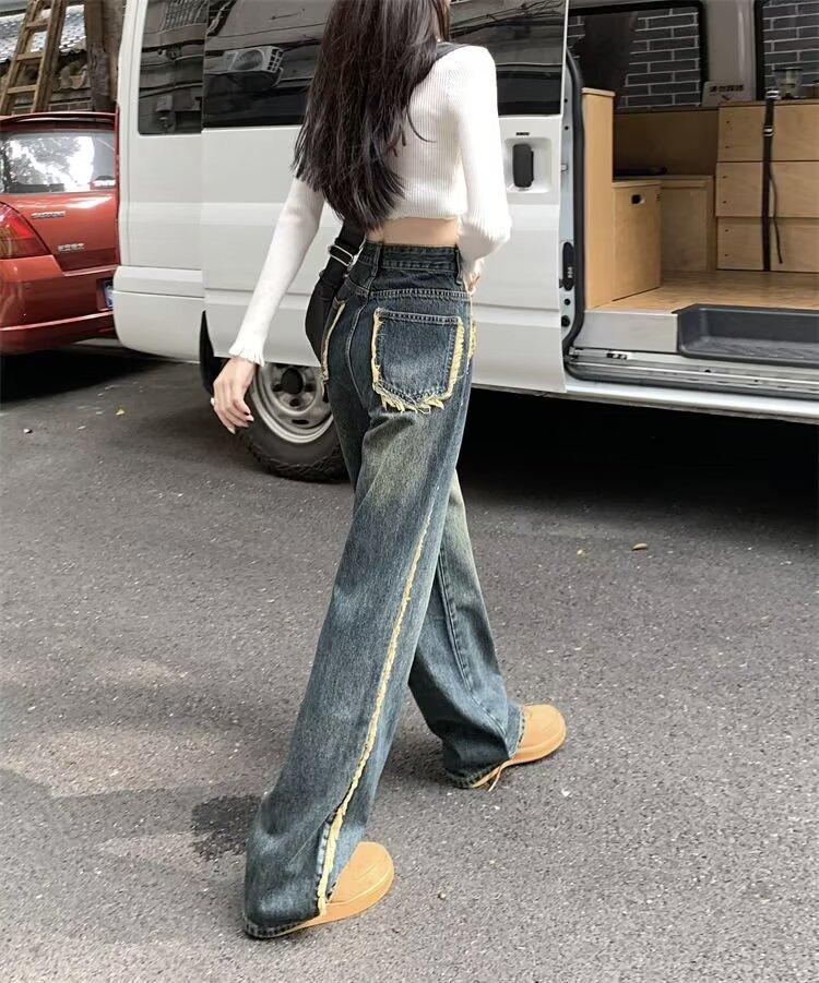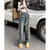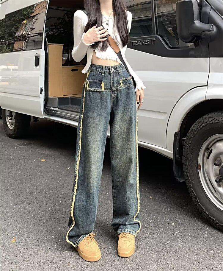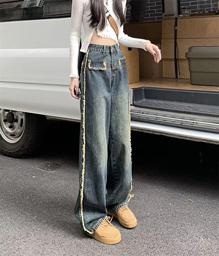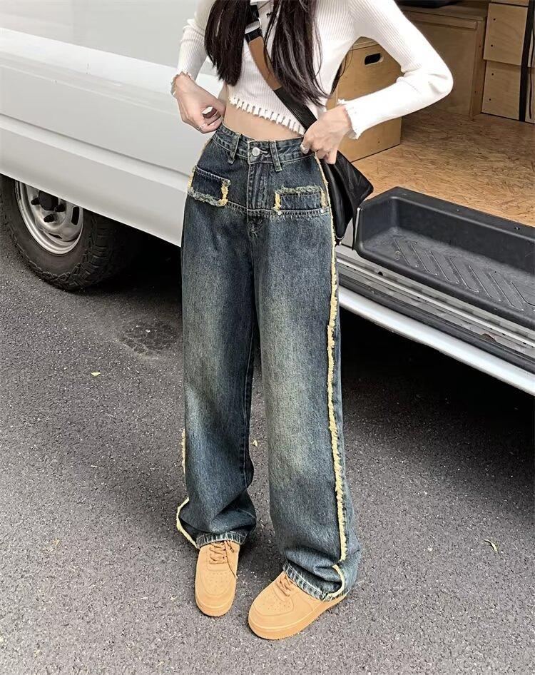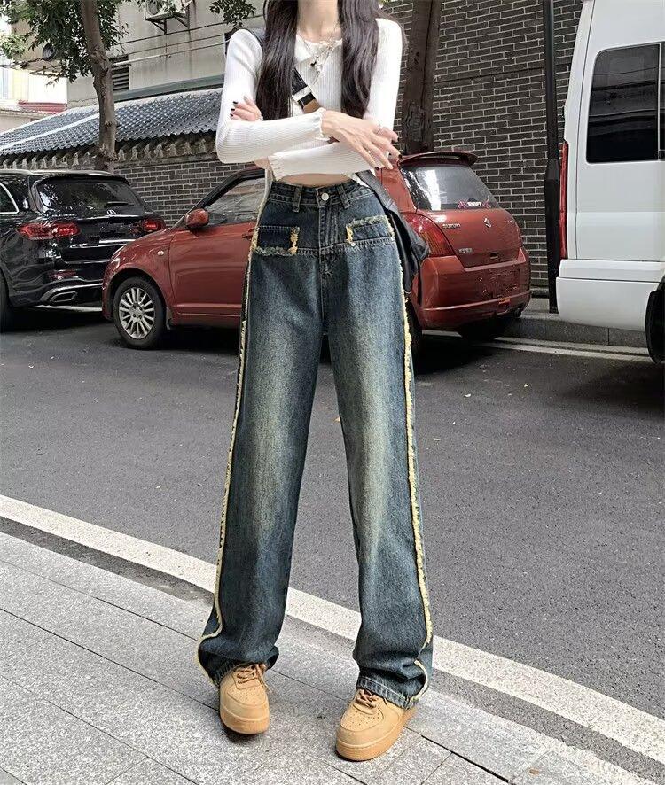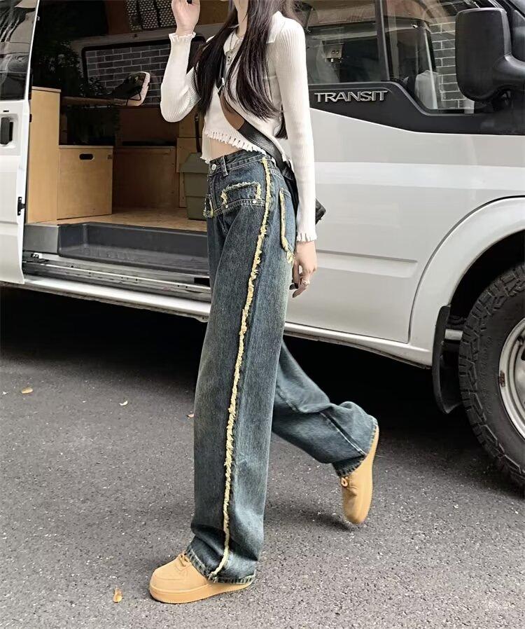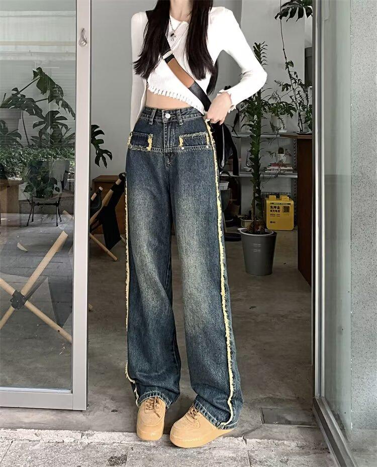 Talla grande Estilo Americano Retro Jeans de Pierna Recta para Mujer chica gordita Primavera Nuevo Ins Cintura Alta Pantalones de Pierna Ancha