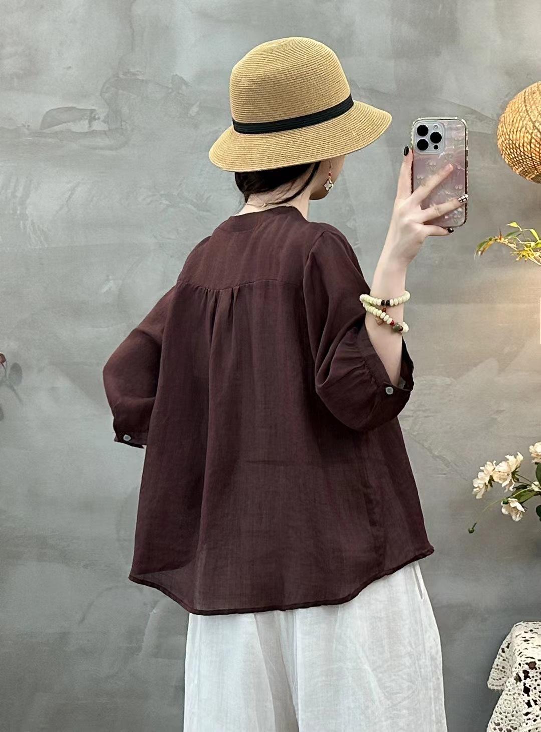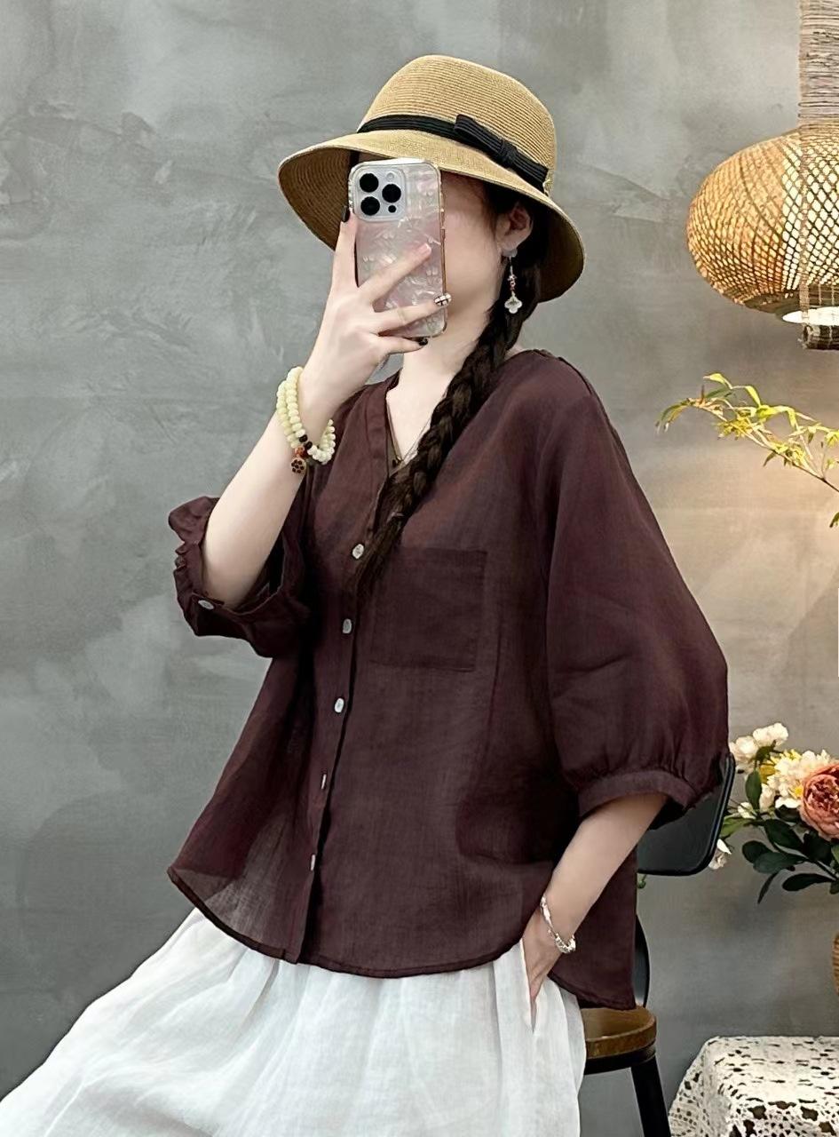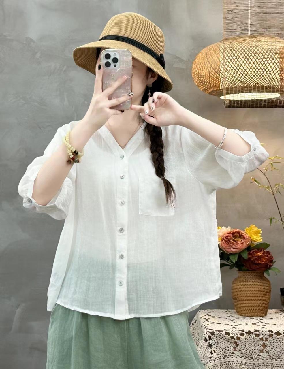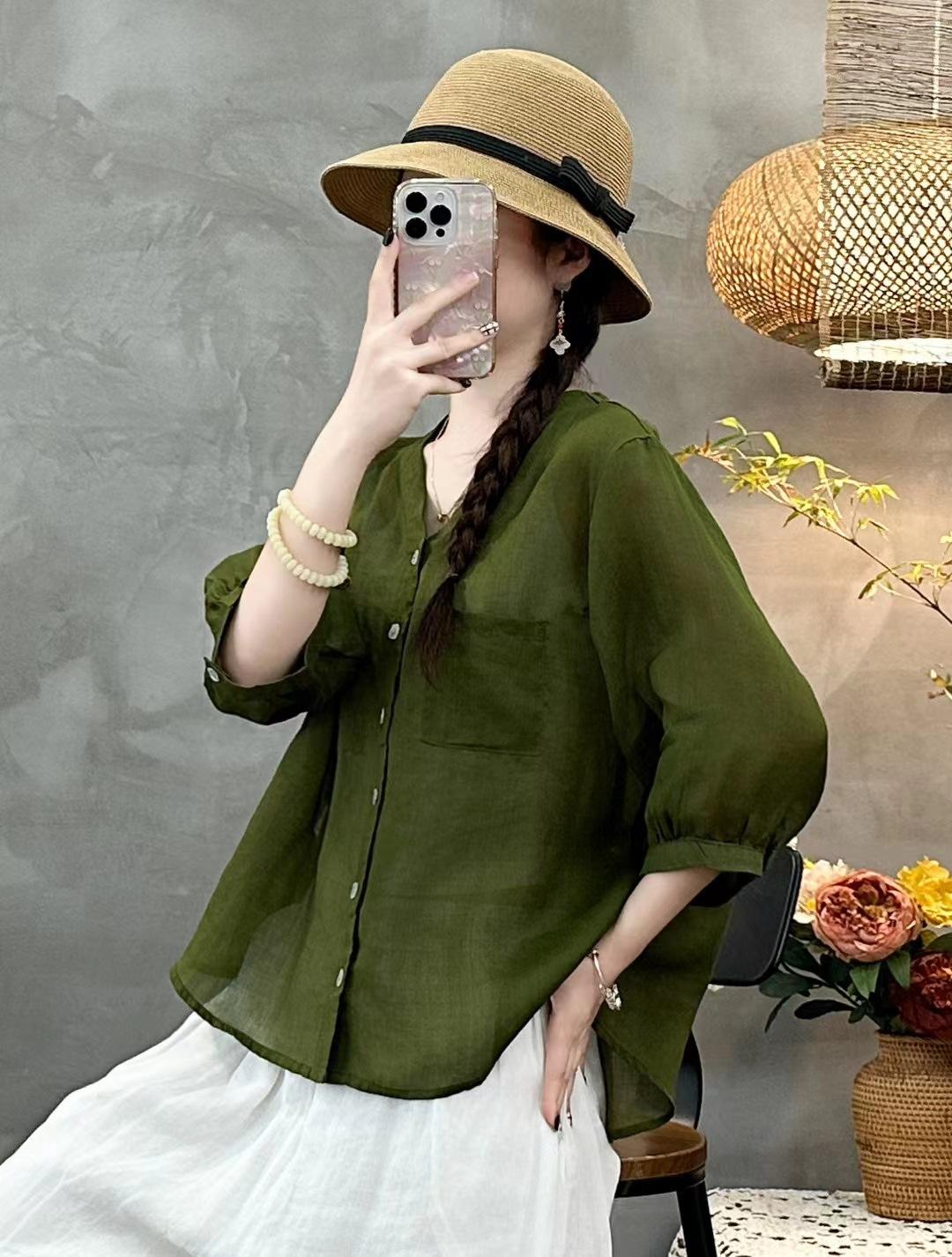 Popular Camisa de Ramio Verano 2025 Nueva, Cubriendo la Carne y con Aspecto Adelgazante, Color Puro, Camisa Top de Manga Tres Cuartos para Mujer