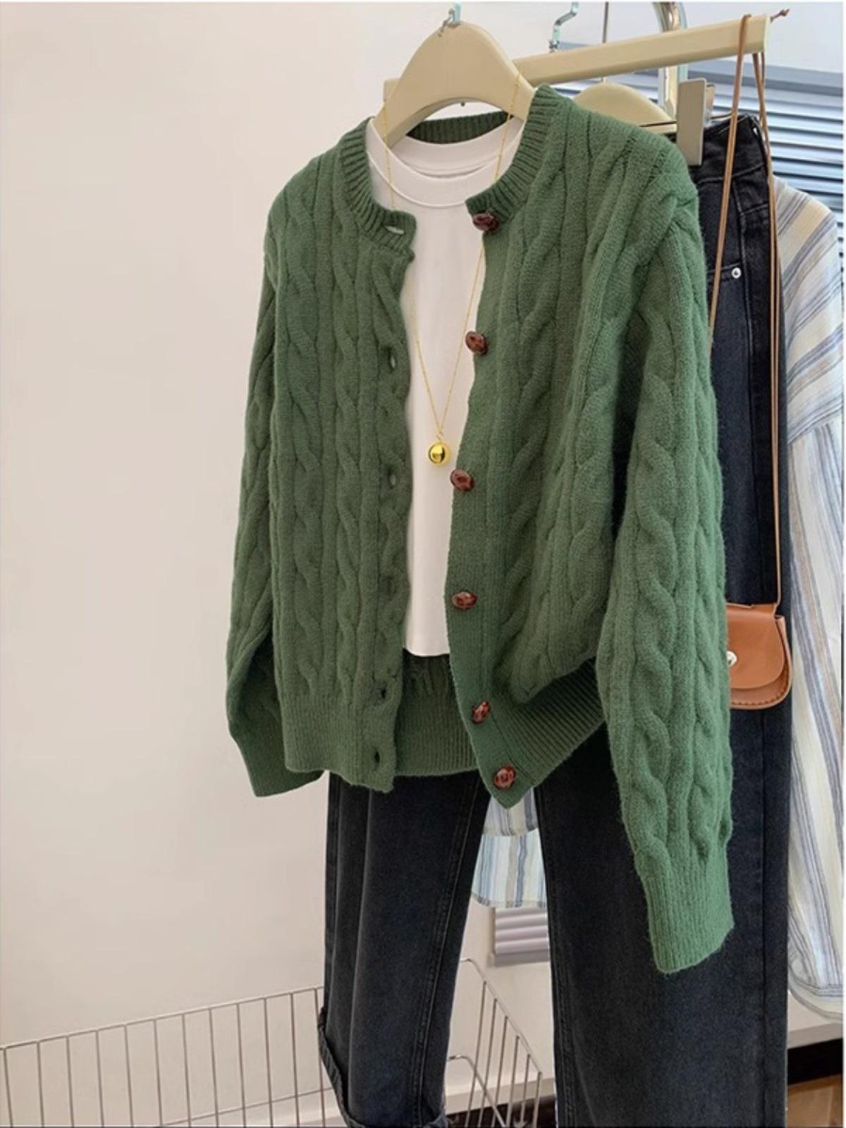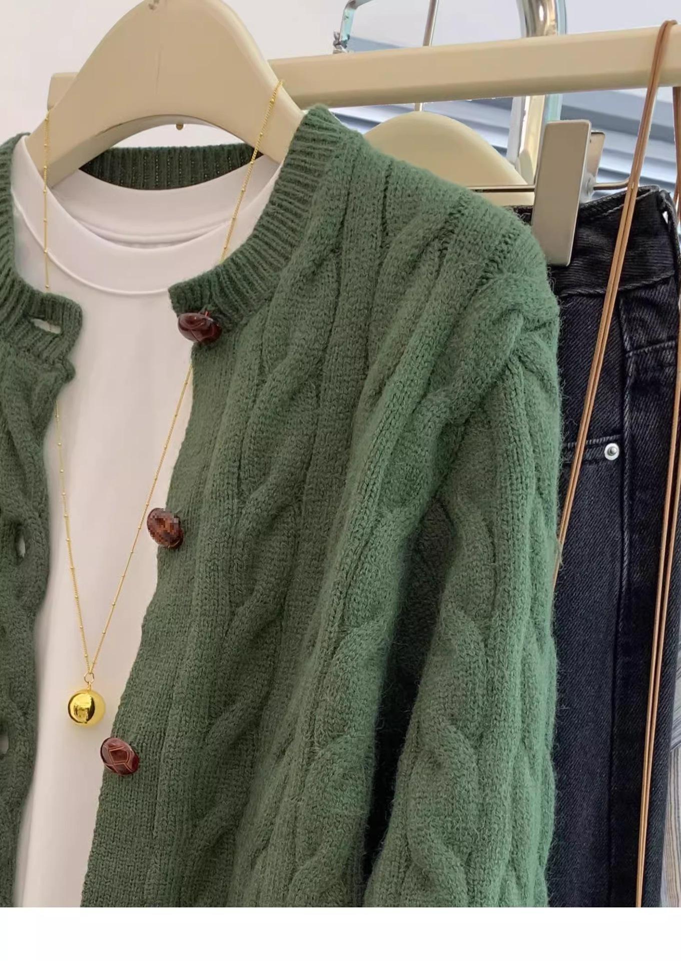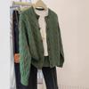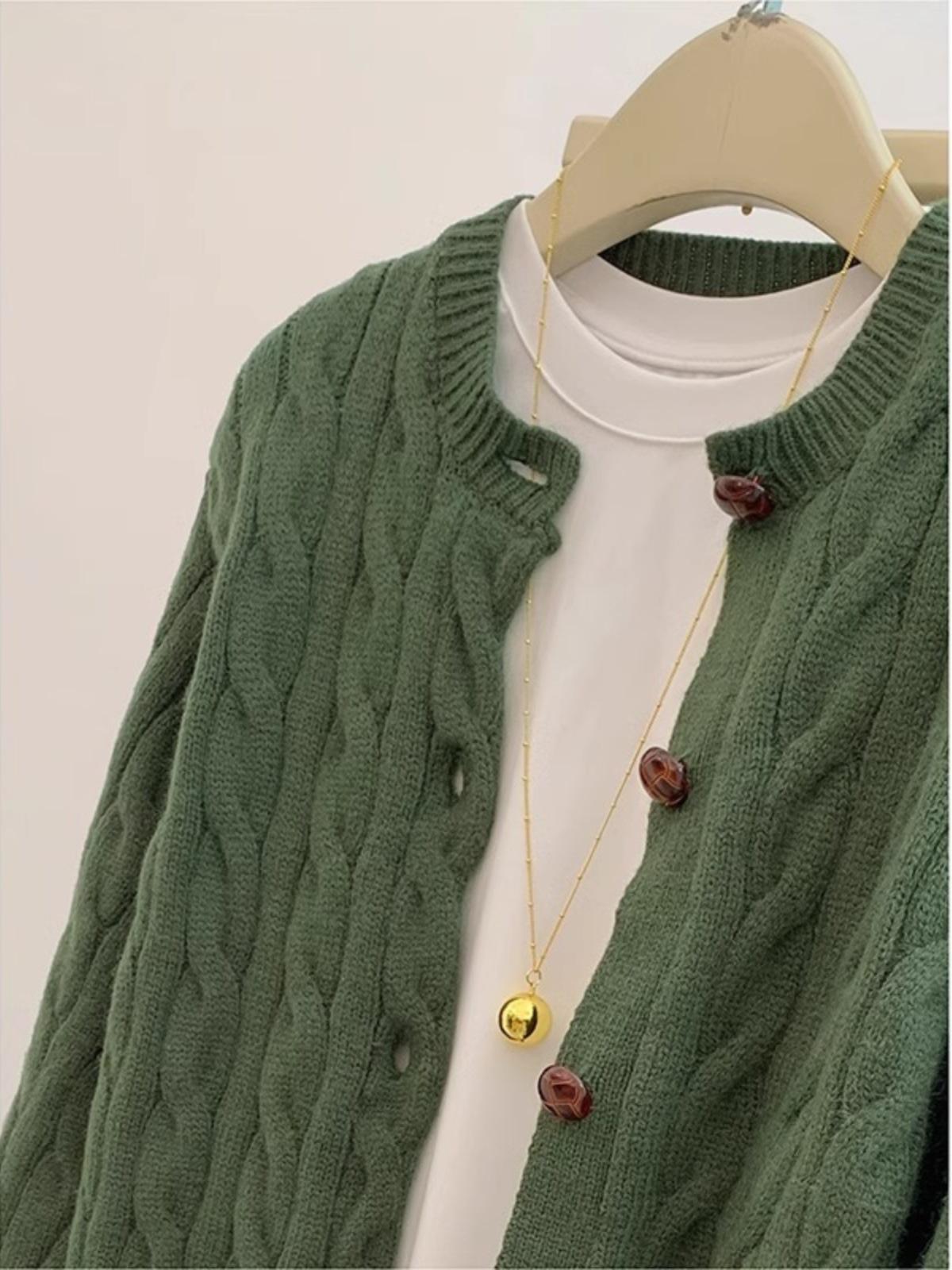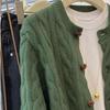 Cárdigan de punto con cuello redondo y diseño retorcido de terciopelo de mapache verde para mujer, suéter holgado de lana para primavera y otoño, top holgado de principios de otoño