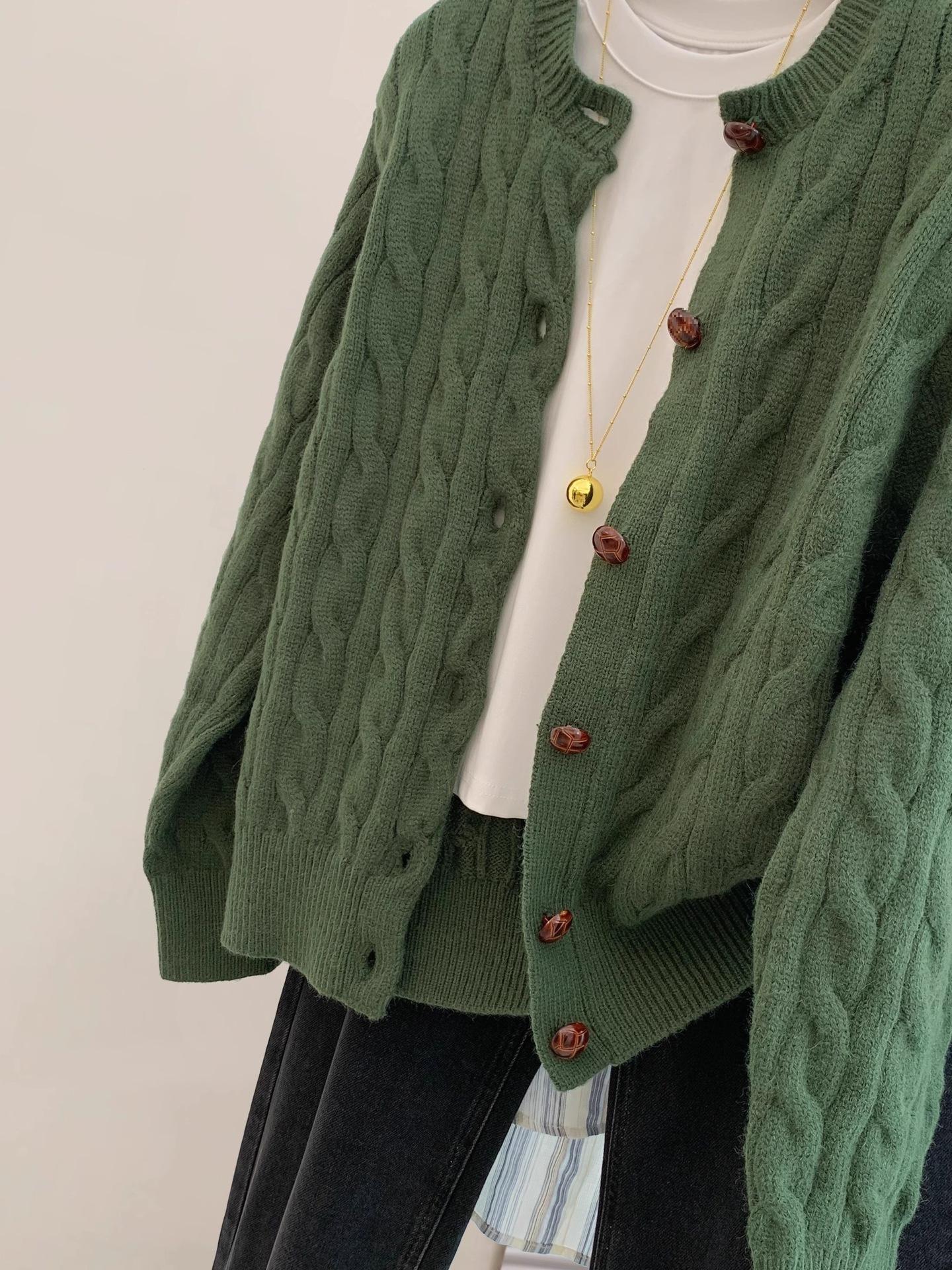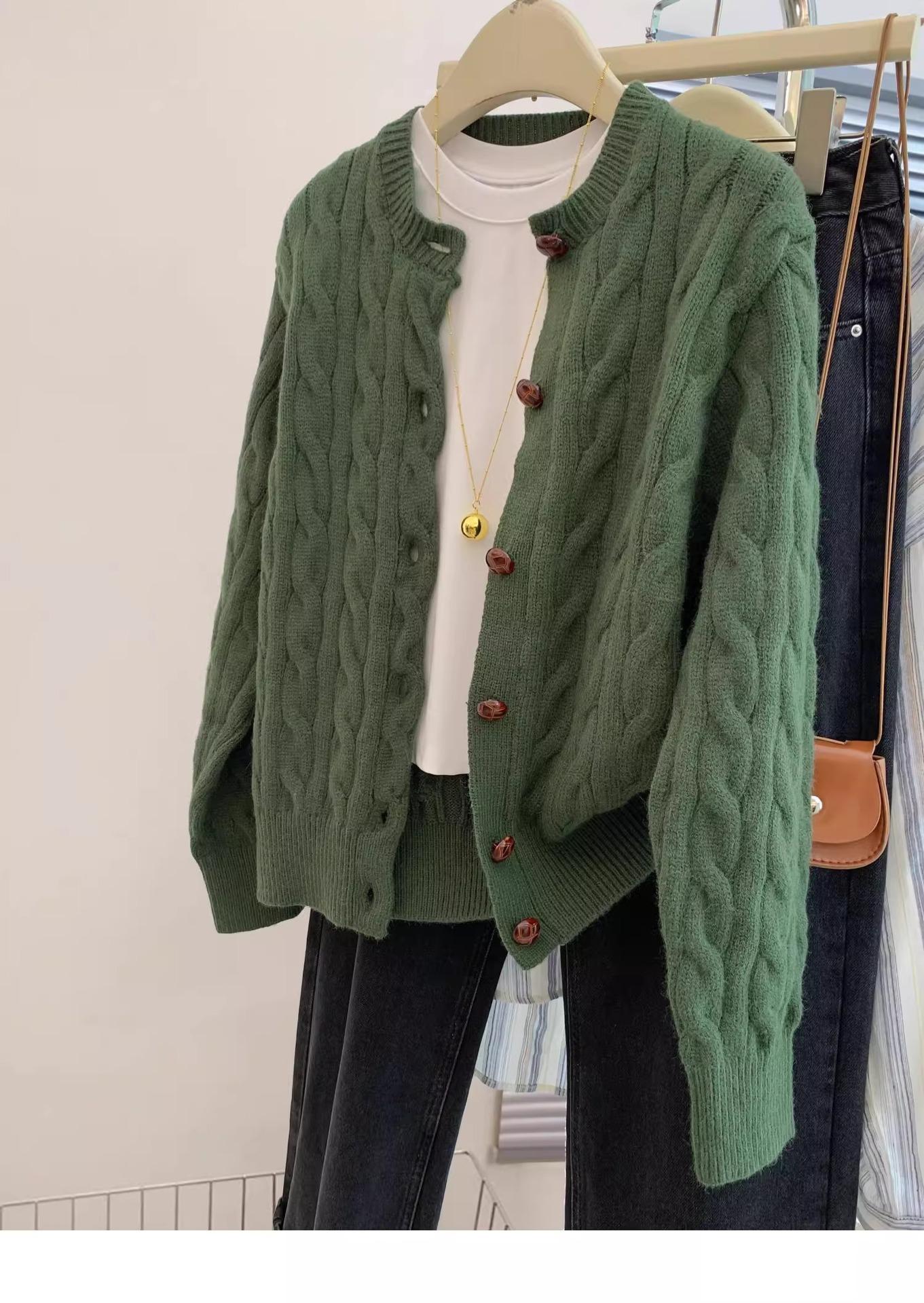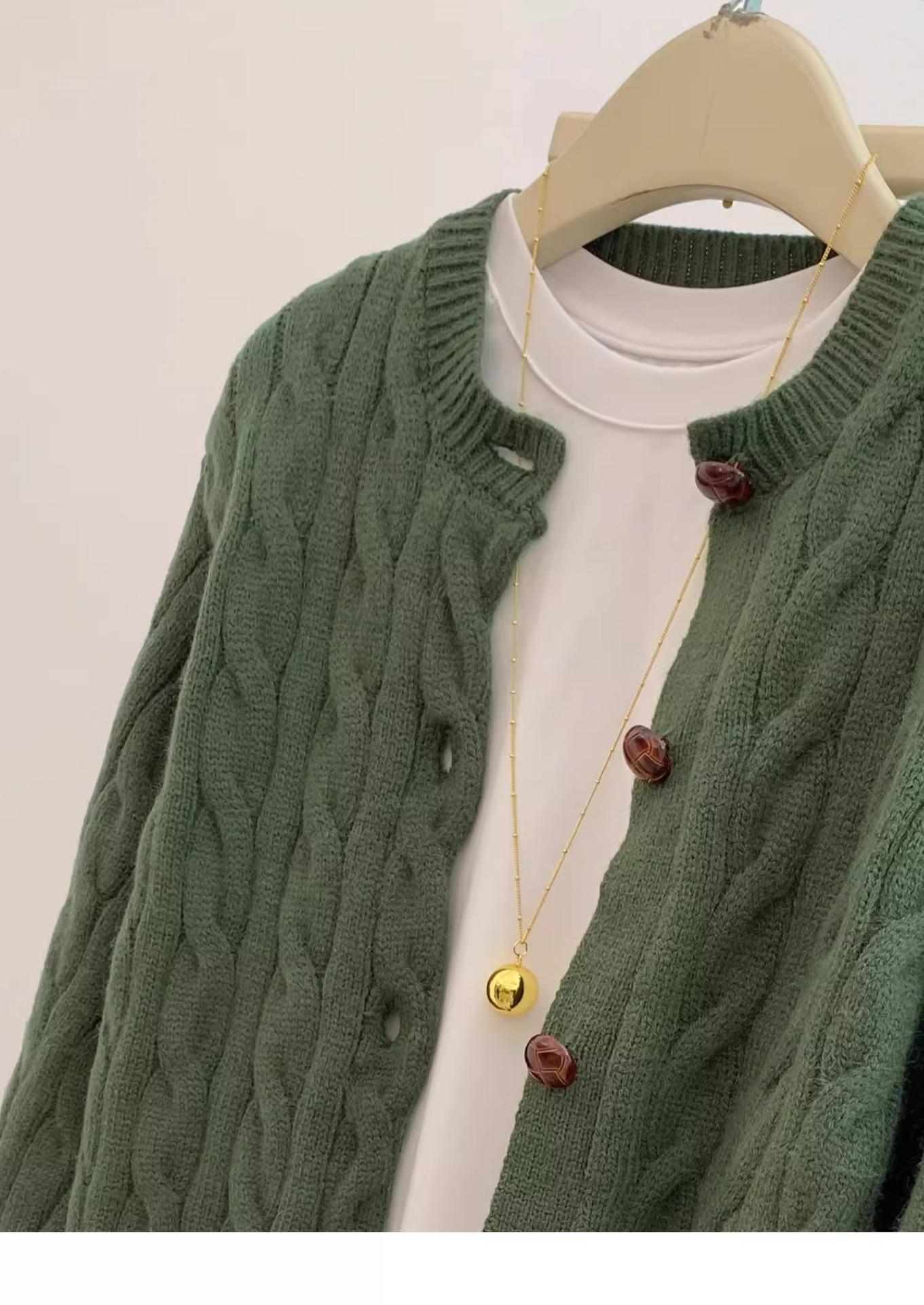 Cárdigan de punto con cuello redondo y diseño retorcido de terciopelo de mapache verde para mujer, suéter holgado de lana para primavera y otoño, top holgado de principios de otoño