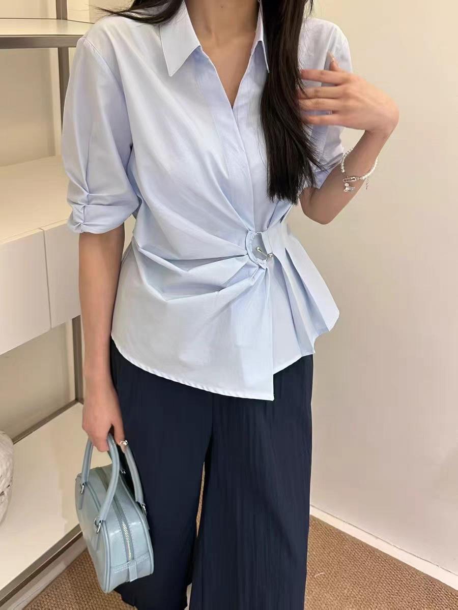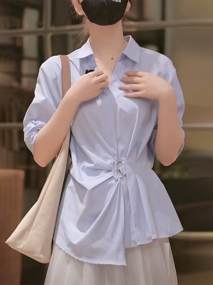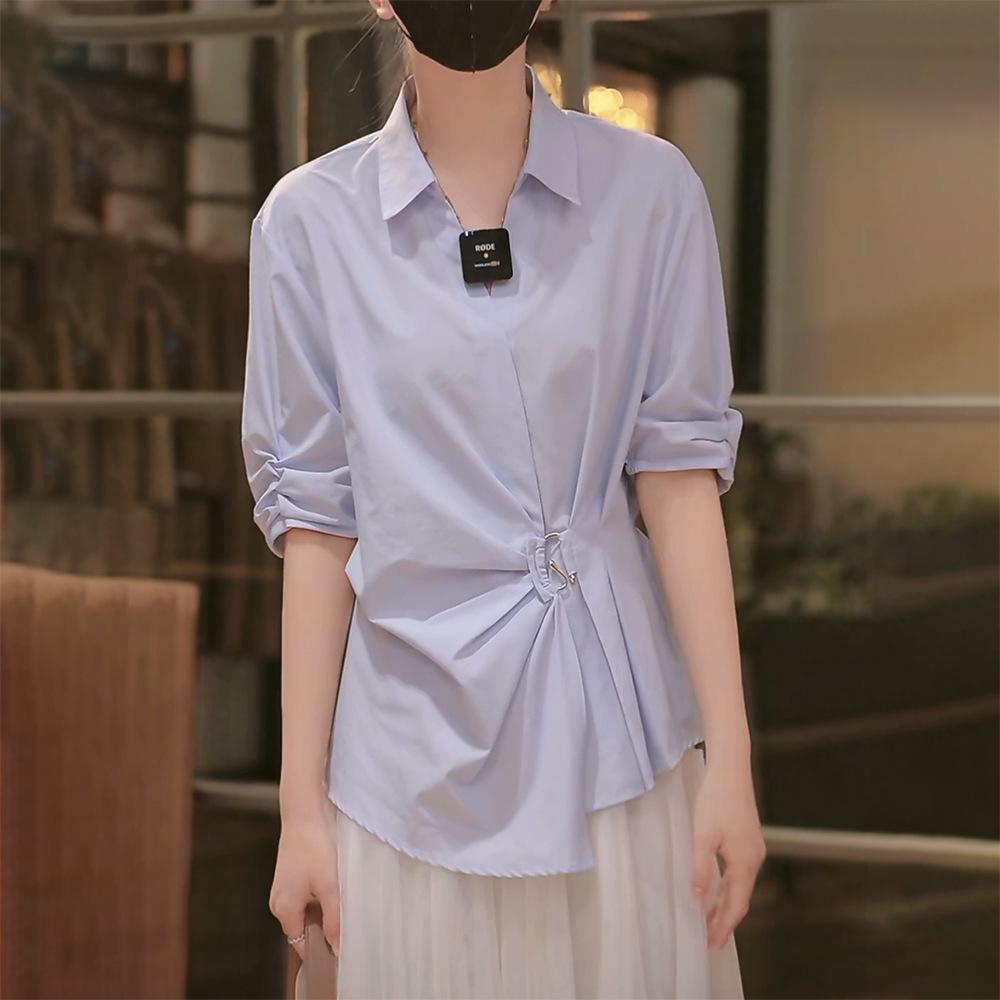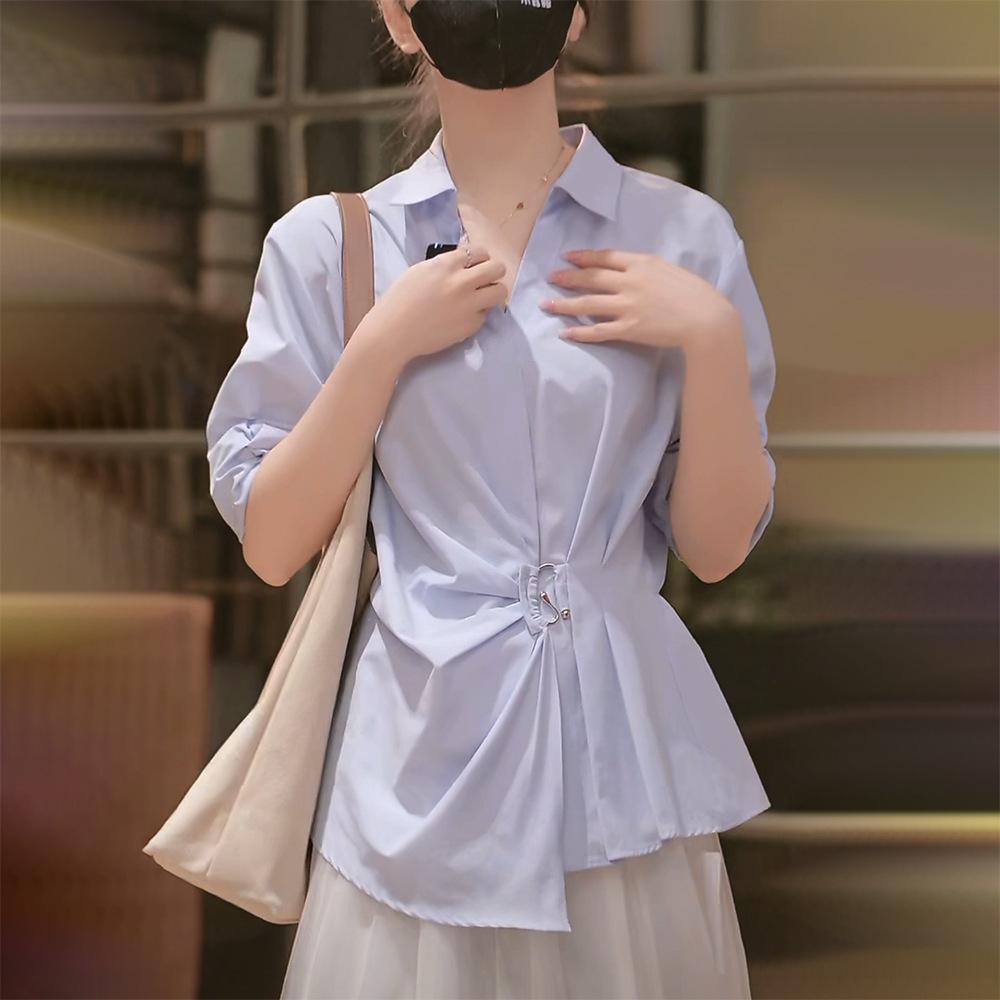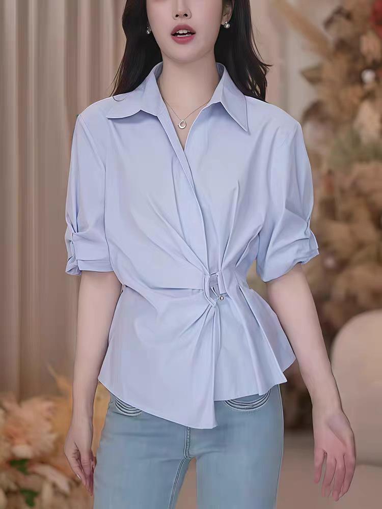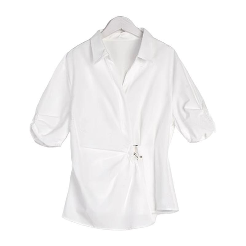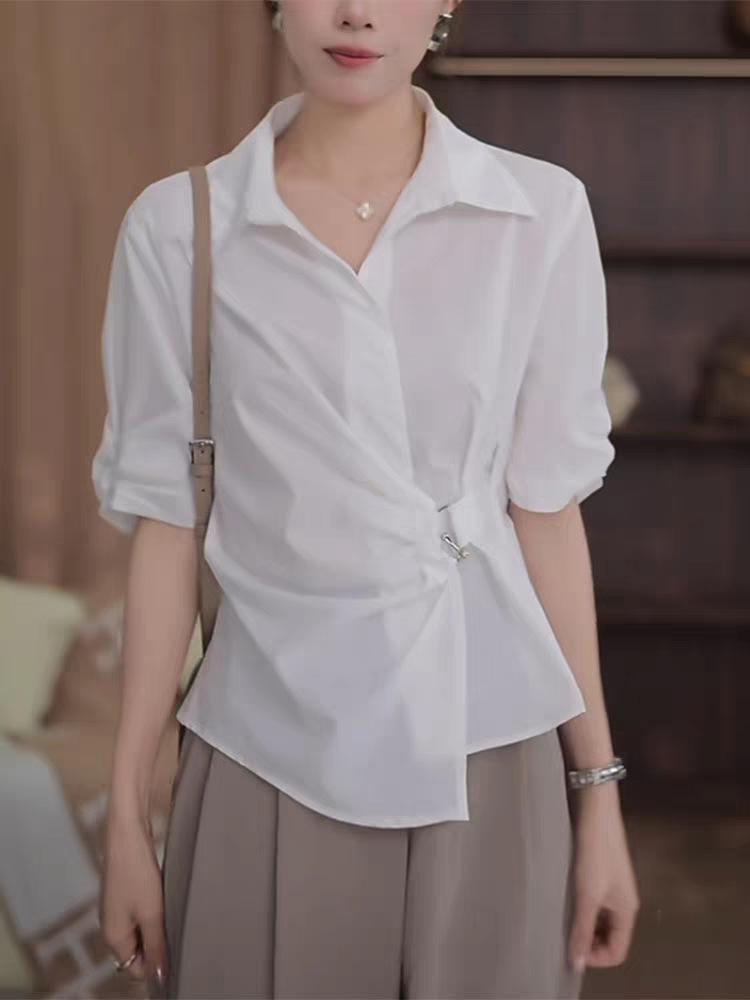 Camisa de Manga Corta Irregular con Sentido del Diseño para Mujer Verano 2025 Nuevo Estilo Moda Versátil Reductora de Edad Casual Adelgazante