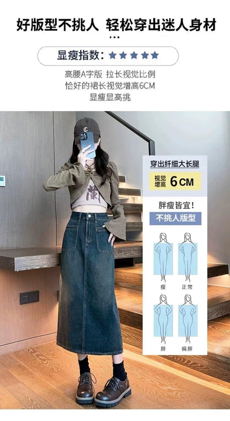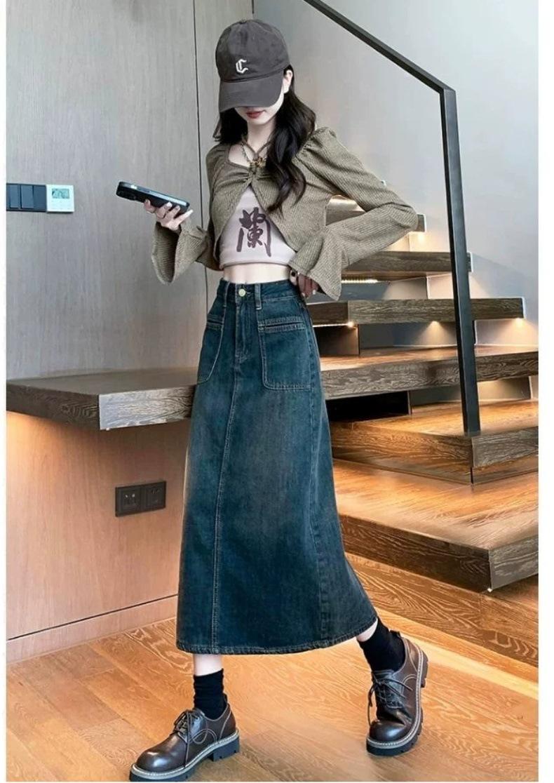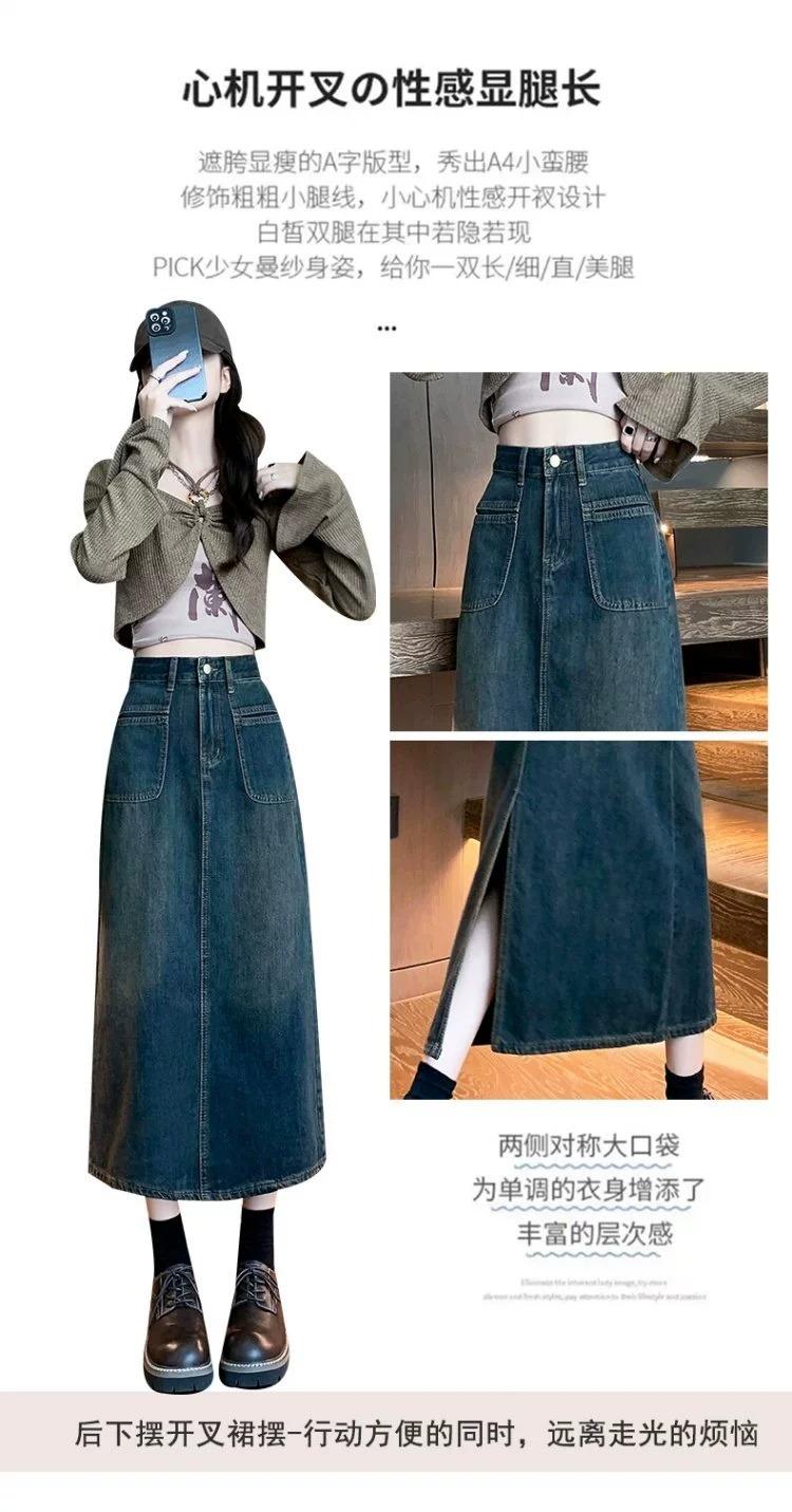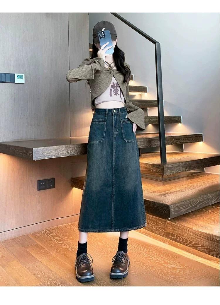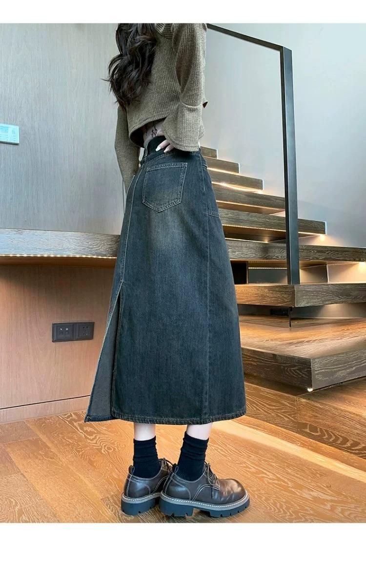 Falda vaquera vintage de cintura alta con corte A para mujer, primavera y otoño, nueva falda larga de longitud media con abertura pequeña, falda a la cadera