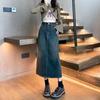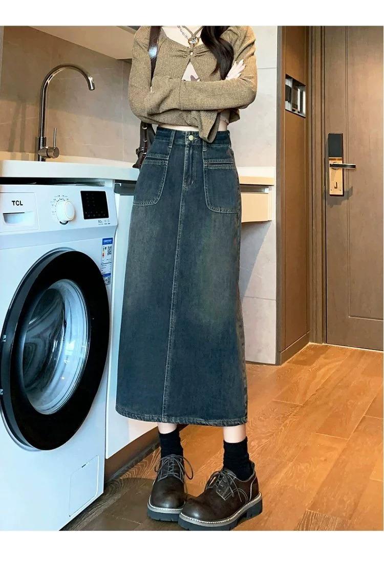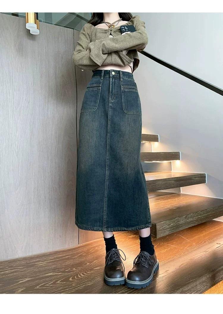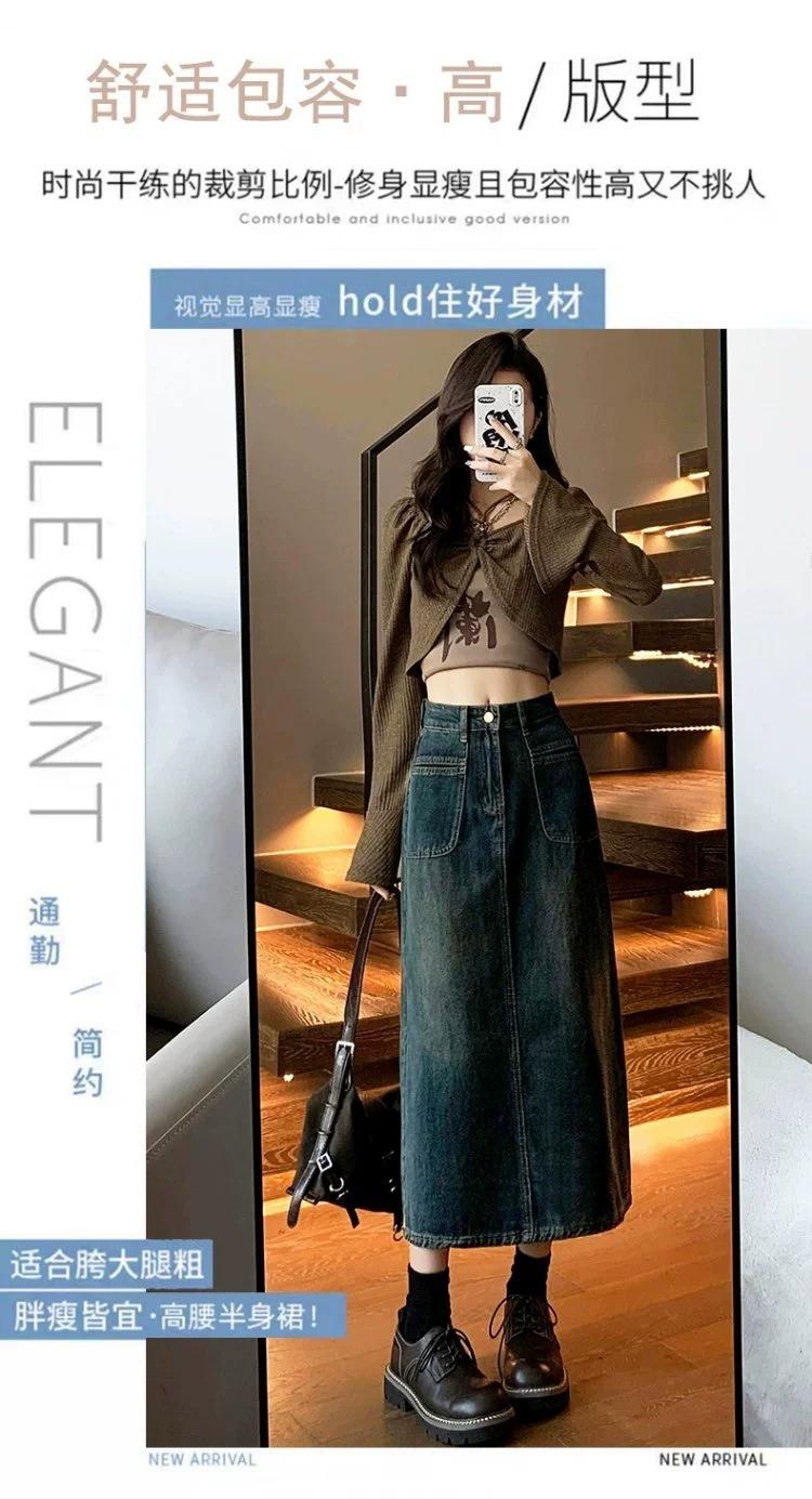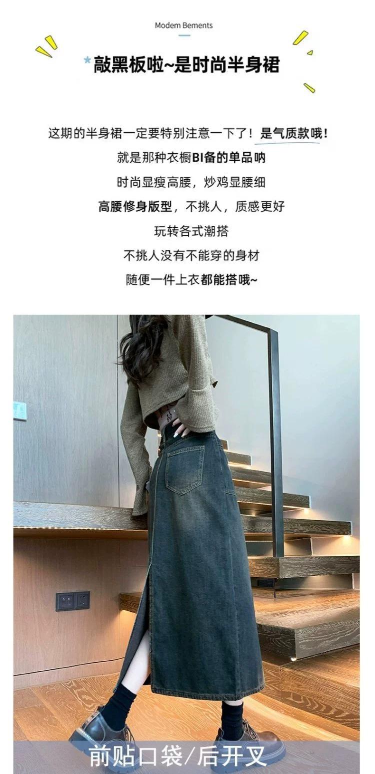 Falda vaquera vintage de cintura alta con corte A para mujer, primavera y otoño, nueva falda larga de longitud media con abertura pequeña, falda a la cadera