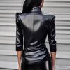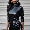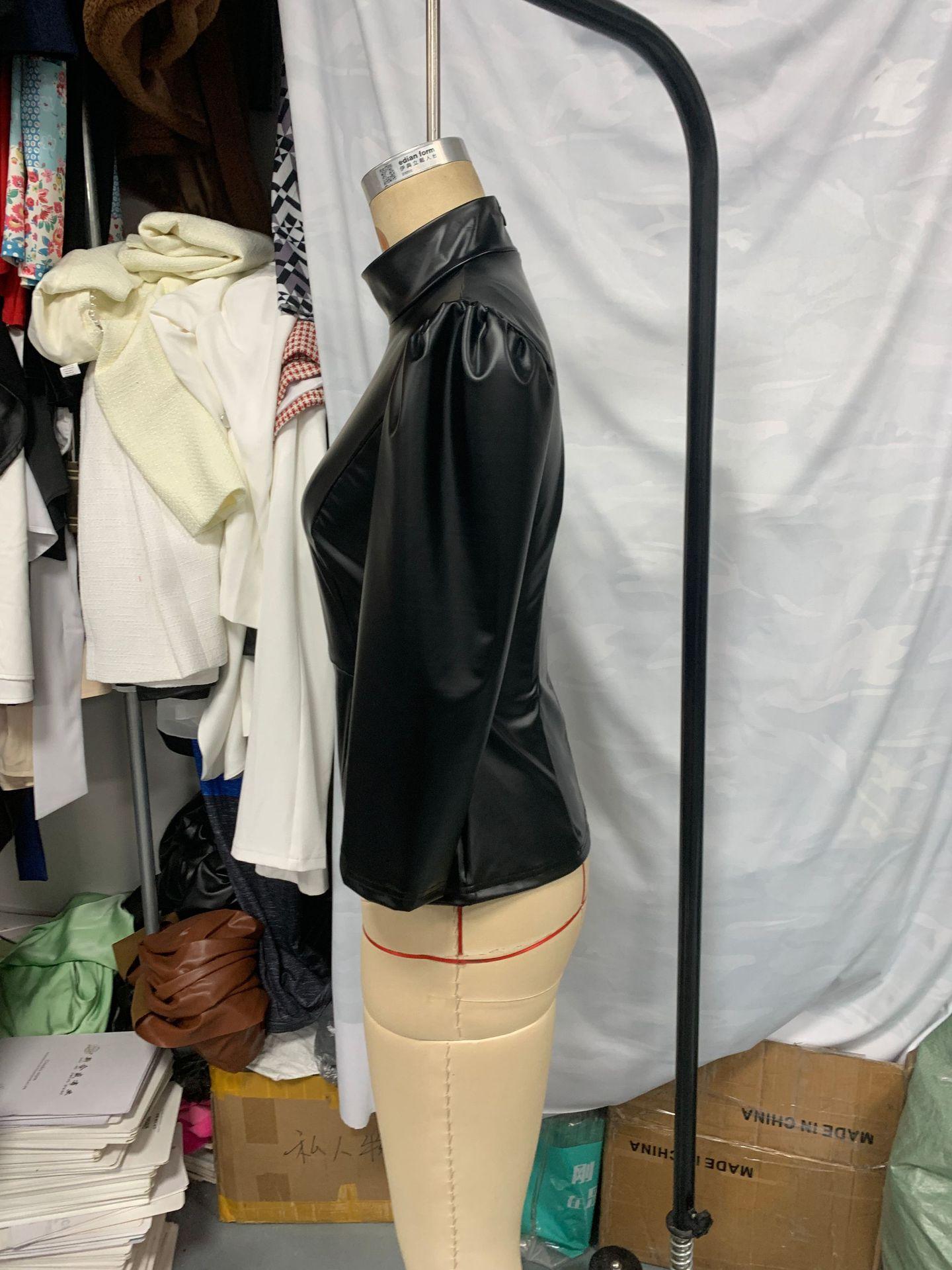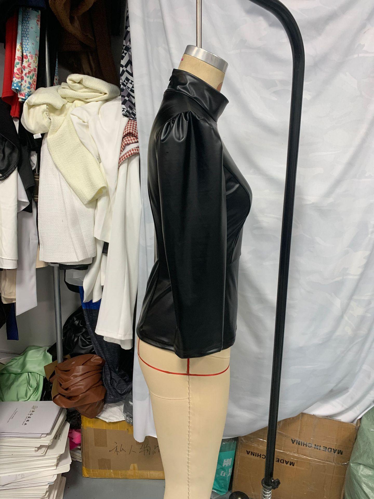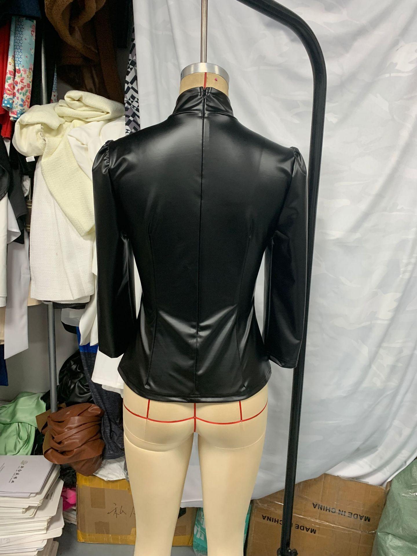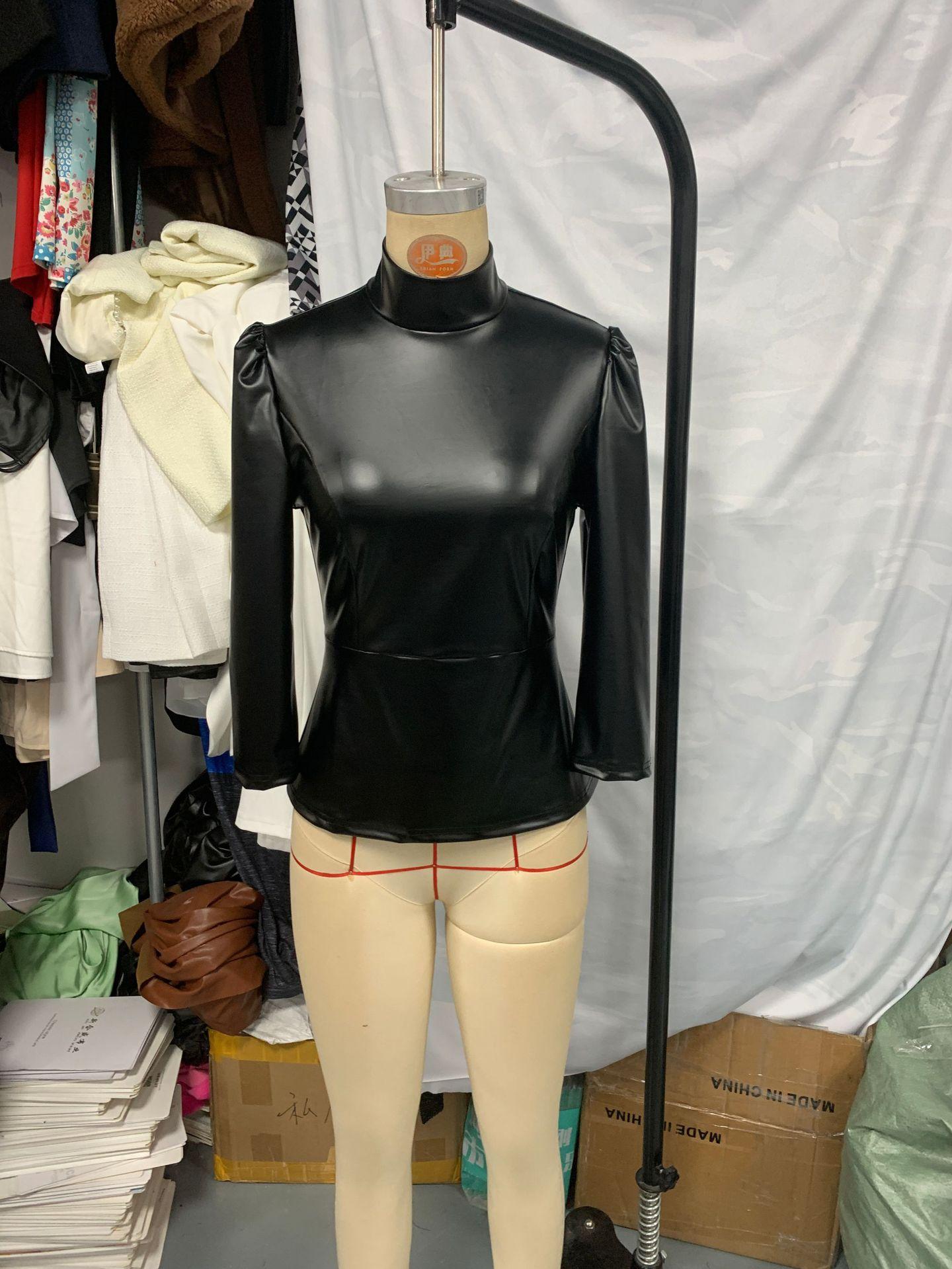 Europeo y Americano Transfronterizo Amazon Nuevo Europeo Moda Calle Cuero PU Sexy Ajustado Cuello Alto Top de Mujer